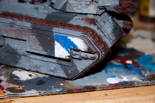 On a different note, here's the first draft of how I want the marines to look (colour/logo wise). The trim will be a rusty orange; sadly the painter seems to think that the trims should be metallic, so it doesn't look quite like the colour I picked, but you get the idea