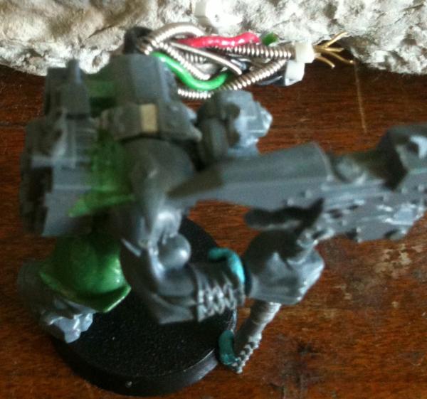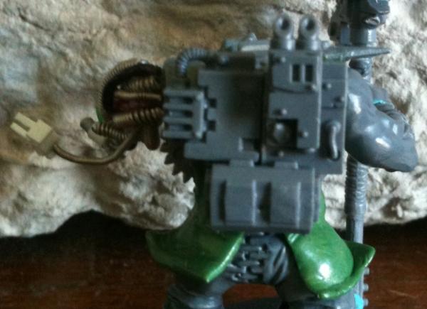 Getting back on track, I've taken a few pics of Gutsnik and his backpack to help remind myself of what is still needed. It's mostly wires at this point (and a load of paint  ), but I have yet to start on any kind of shoulder guards. I'm also going to take up a suggestion I remember from much earlier in Gutsniks life, tho I can't remember who posted it. I'm gonna see how it looks to put in some extra-mekanikal supports for Da Dred Klaw. There's also the grots tools to build...