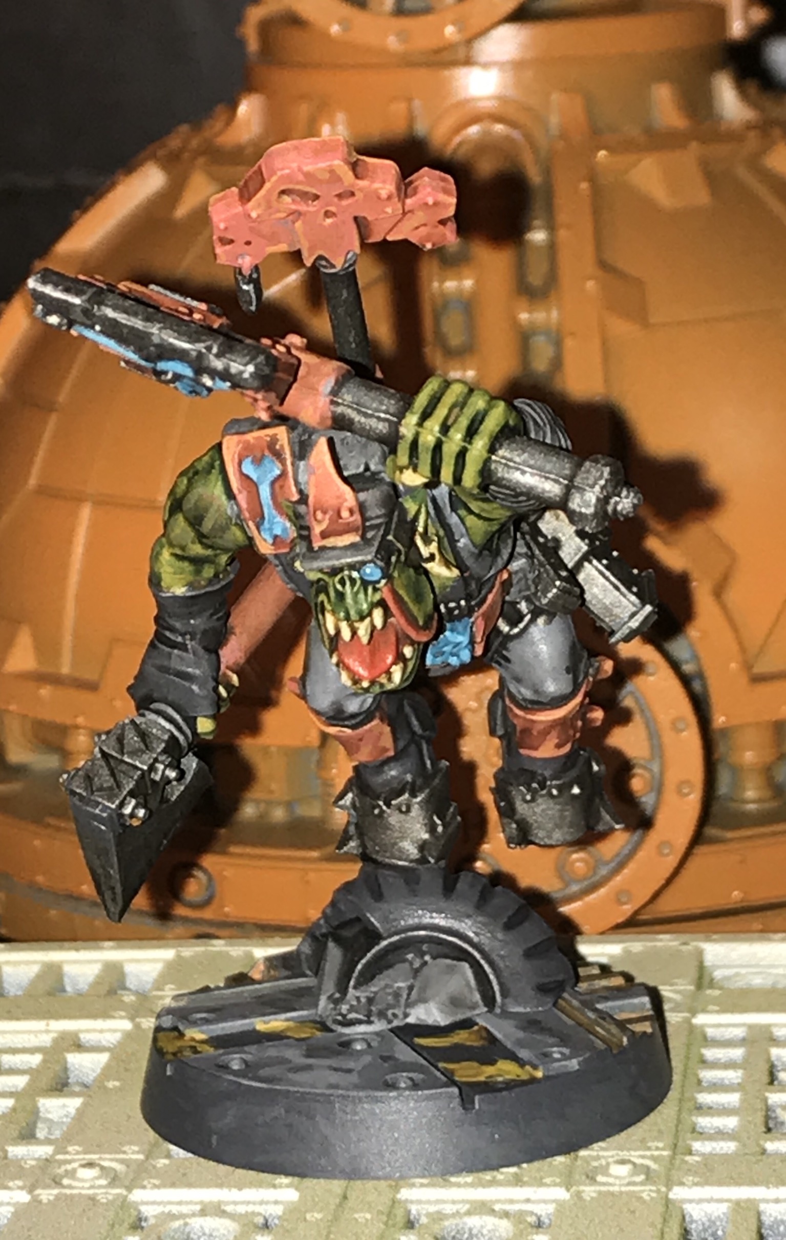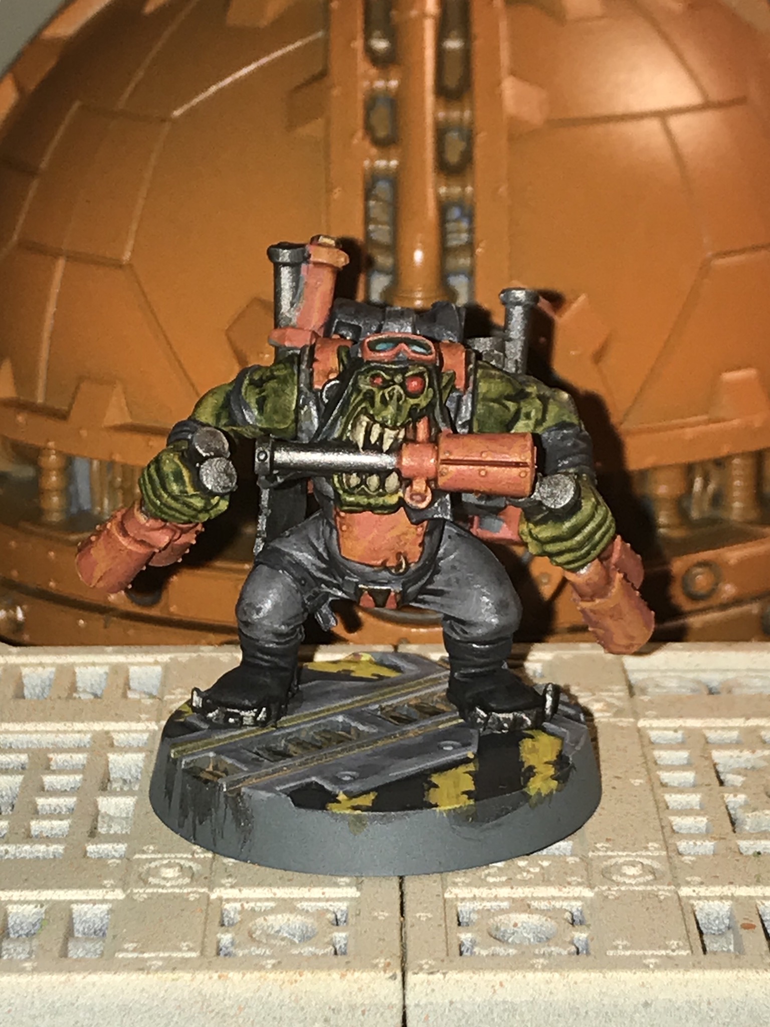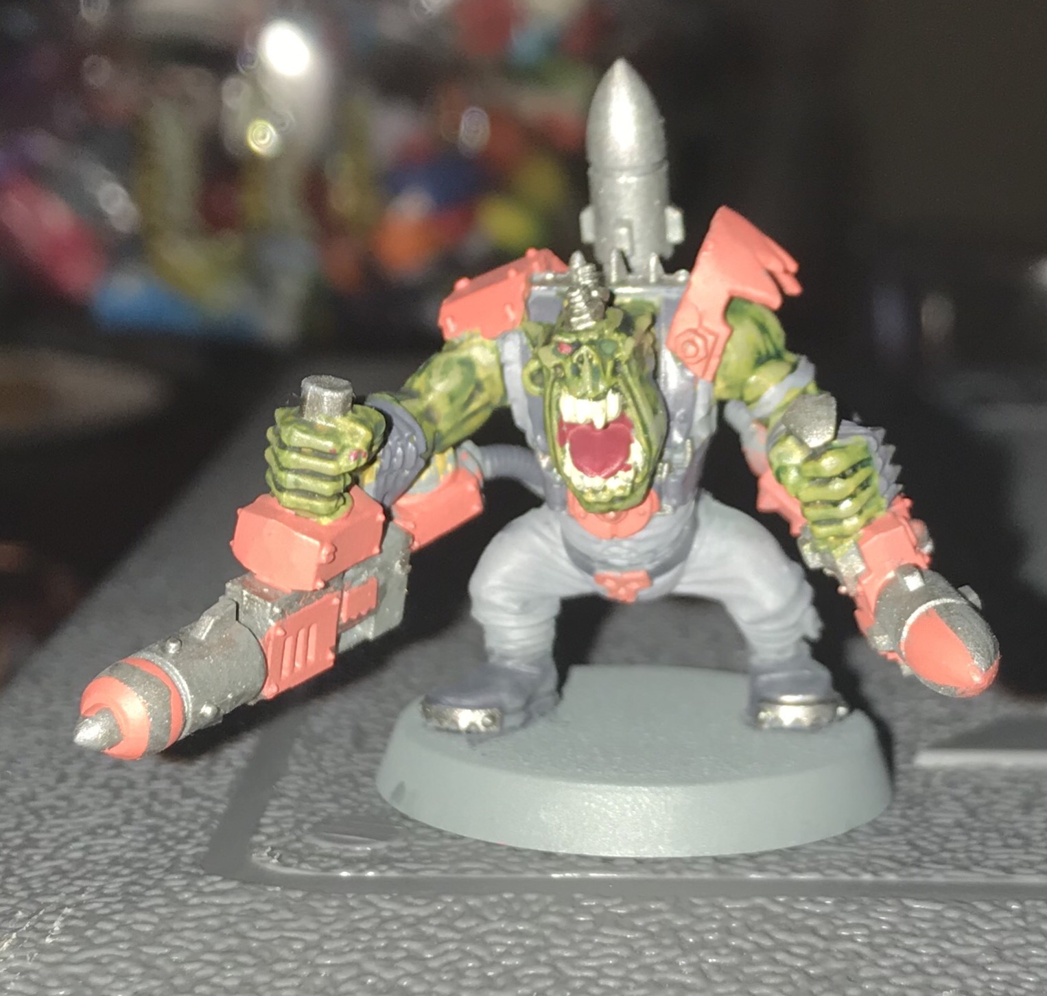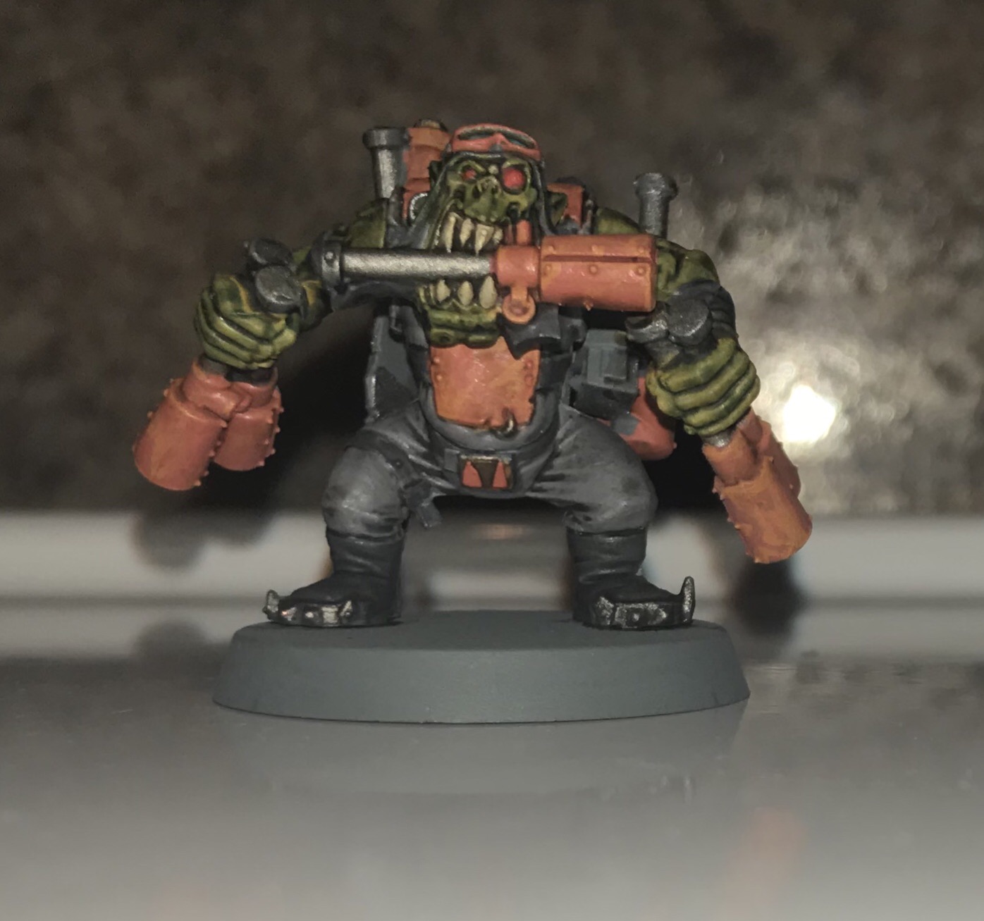 Man I’m really slow at this. Haven’t done a lot at all the past couple weeks. But I did manage to get a tank busta painted and another ready for paint. So captain boom boom is painted. Changed the color scheme. I always do when I start back up on my orks. Don’t know why but I do. And I took monkeytrolls advice and added hoses to the rocket boy and a rocket pack. Gonna start painting him next. But here are some pics with this minor update.