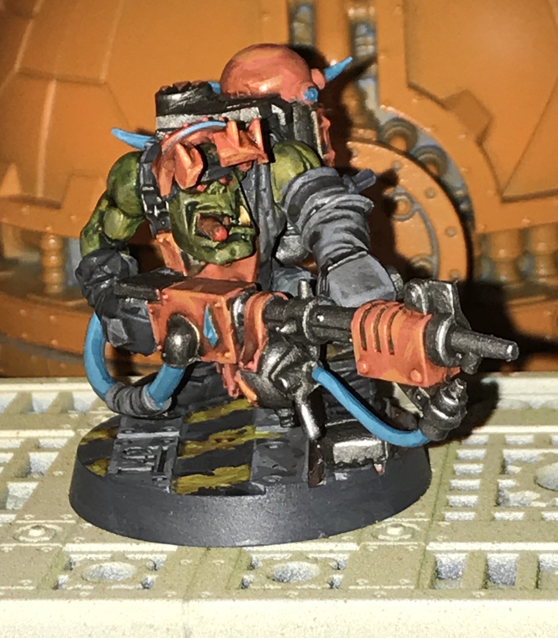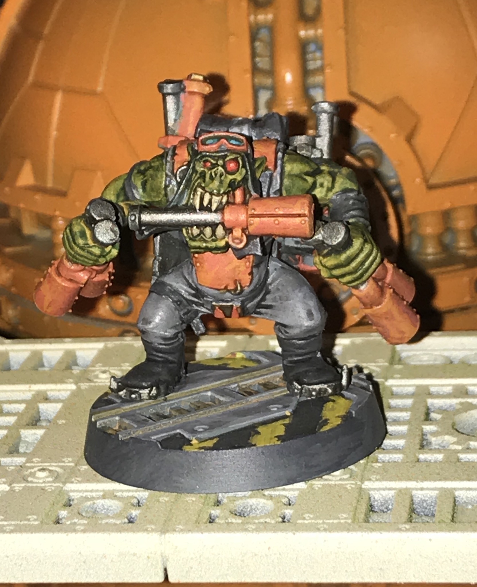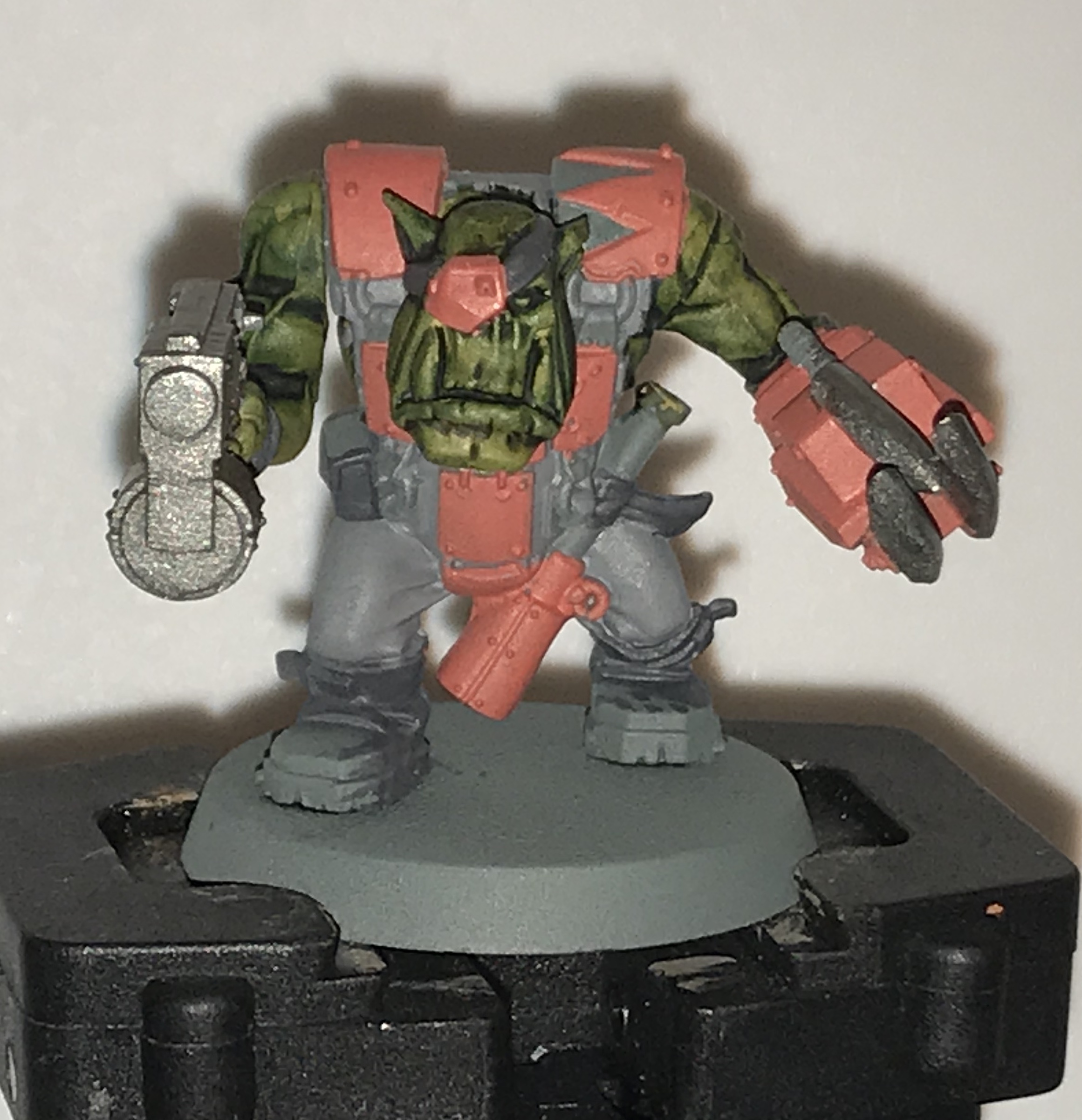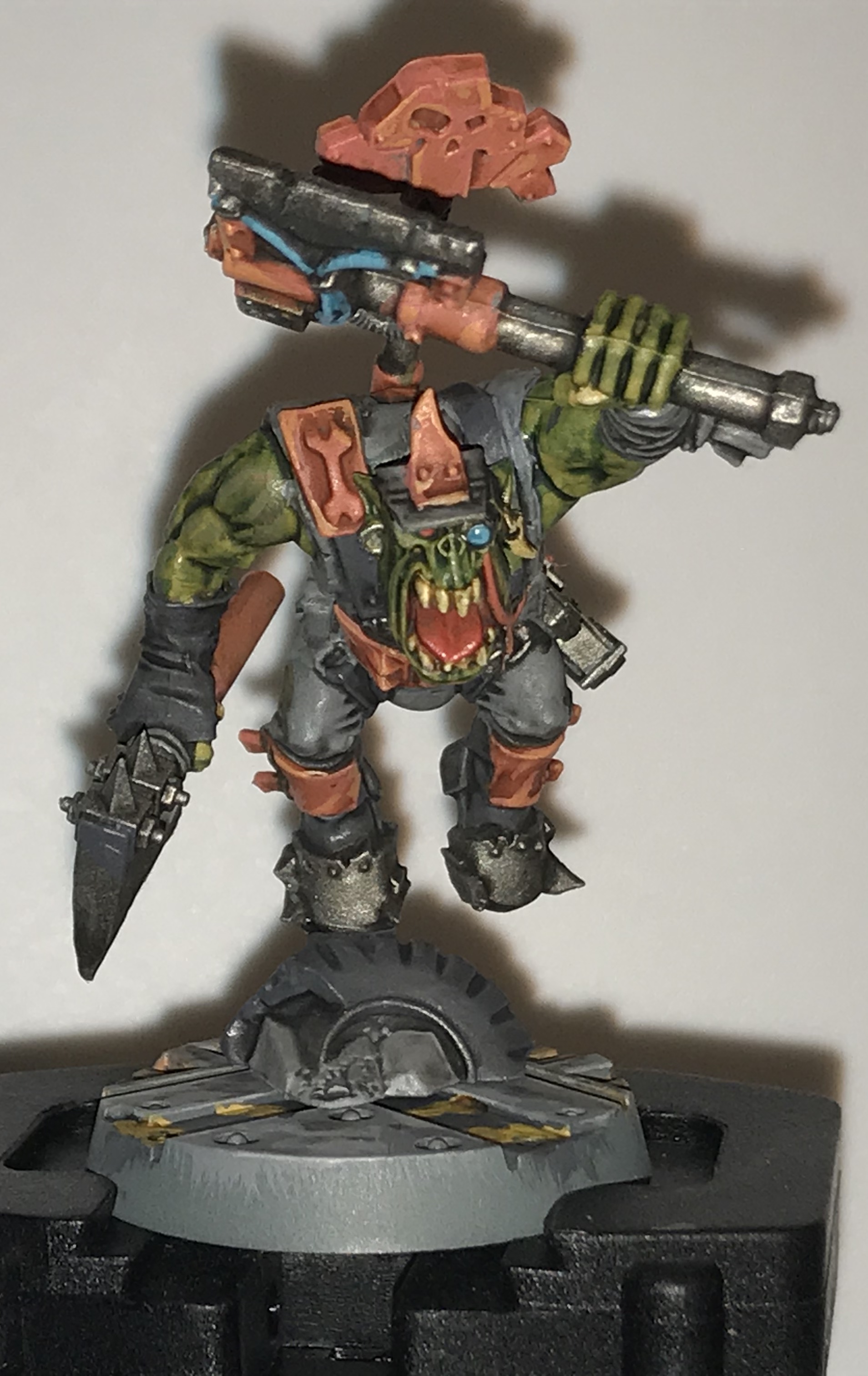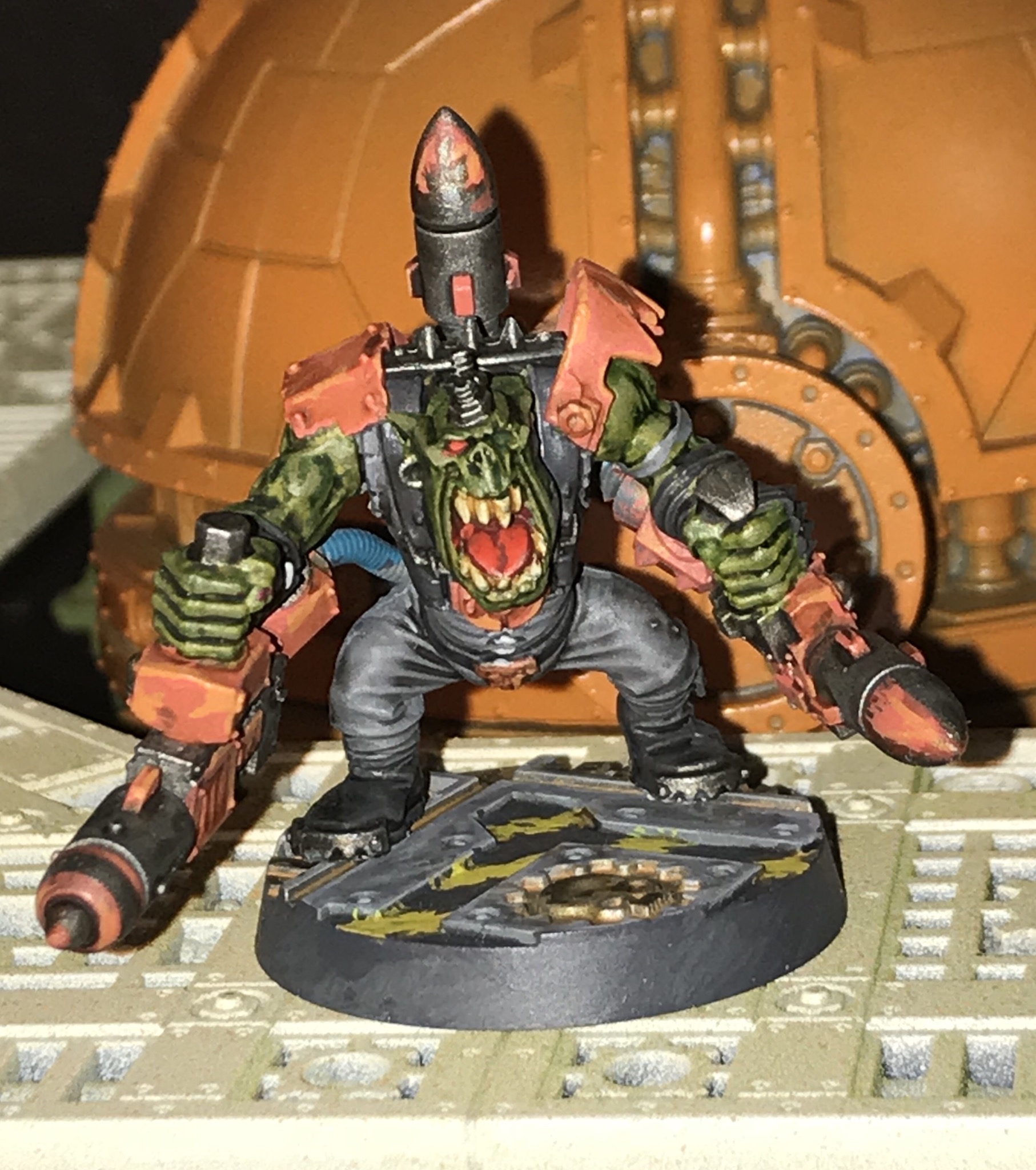 Man I’m really slow at this. Haven’t done a lot at all the past couple weeks. But I did manage to get a tank busta painted and another ready for paint. So captain boom boom is painted. Changed the color scheme. I always do when I start back up on my orks. Don’t know why but I do. And I took monkeytrolls advice and added hoses to the rocket boy and a rocket pack. Gonna start painting him next. But here are some pics with this minor update.