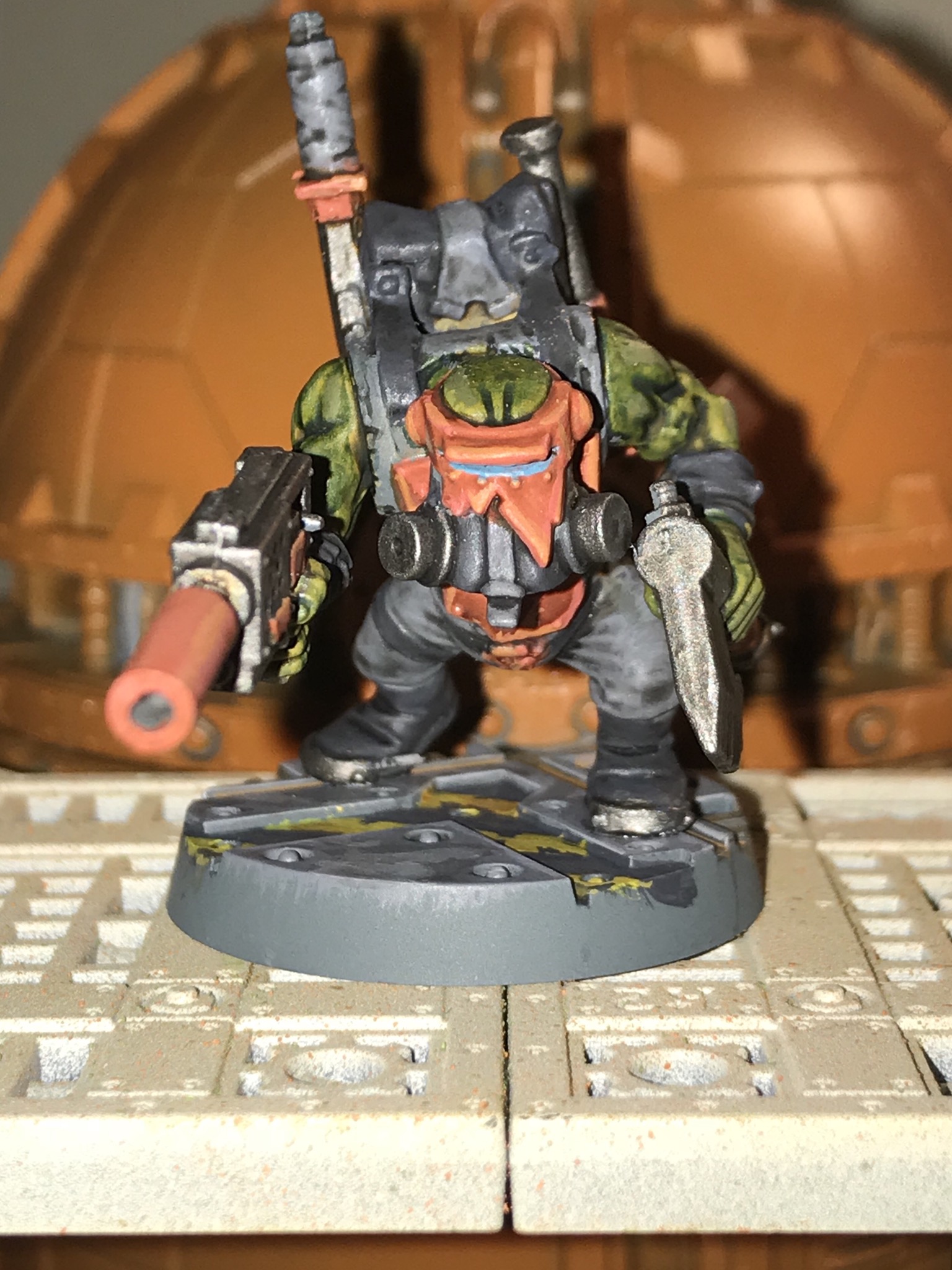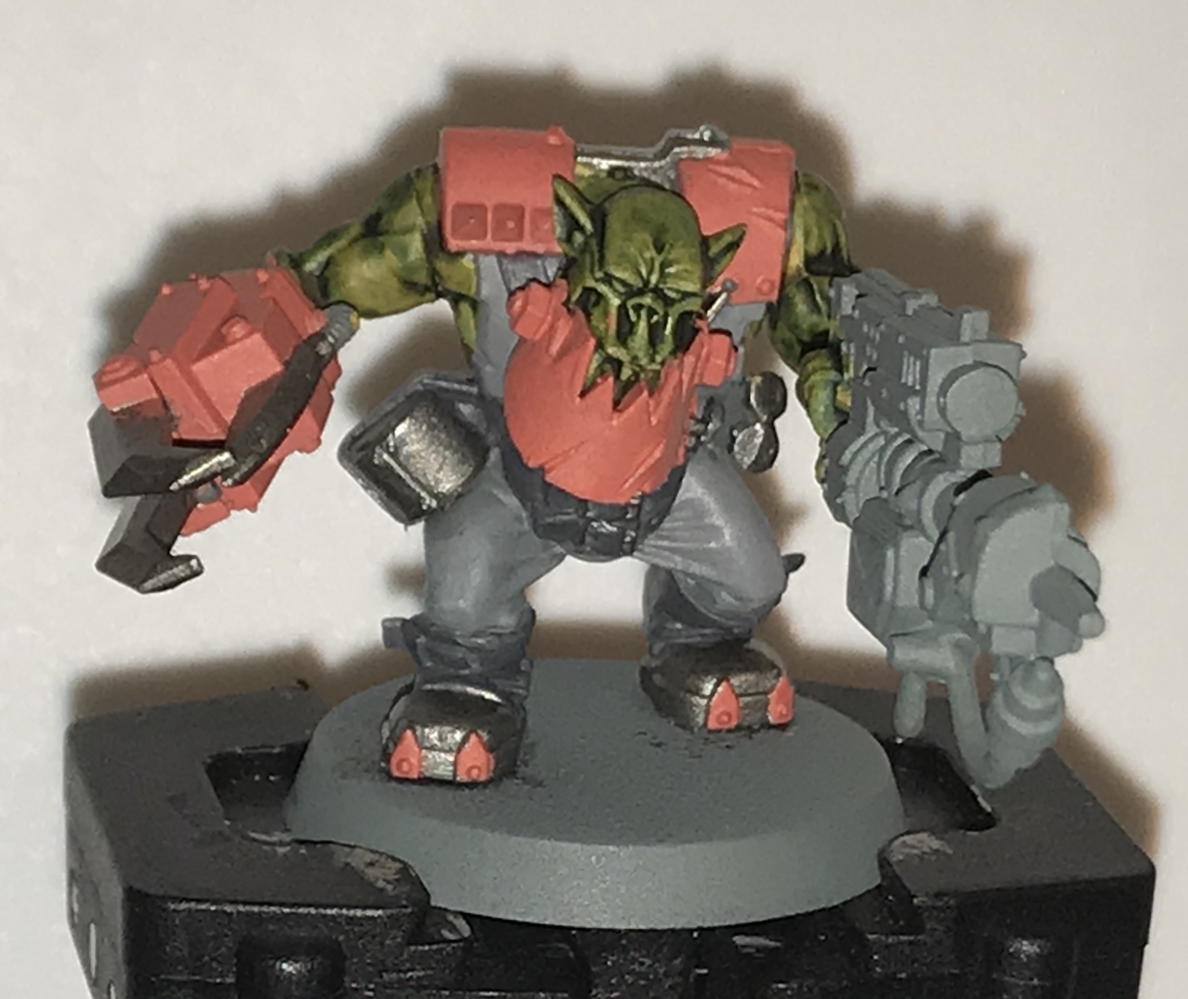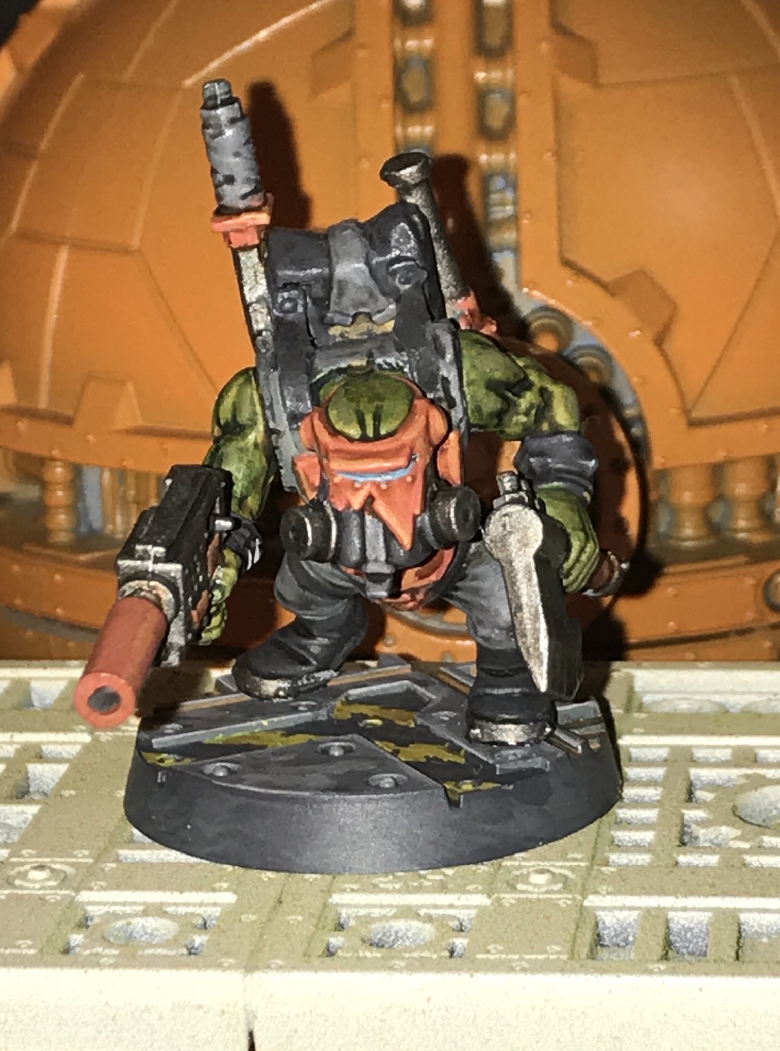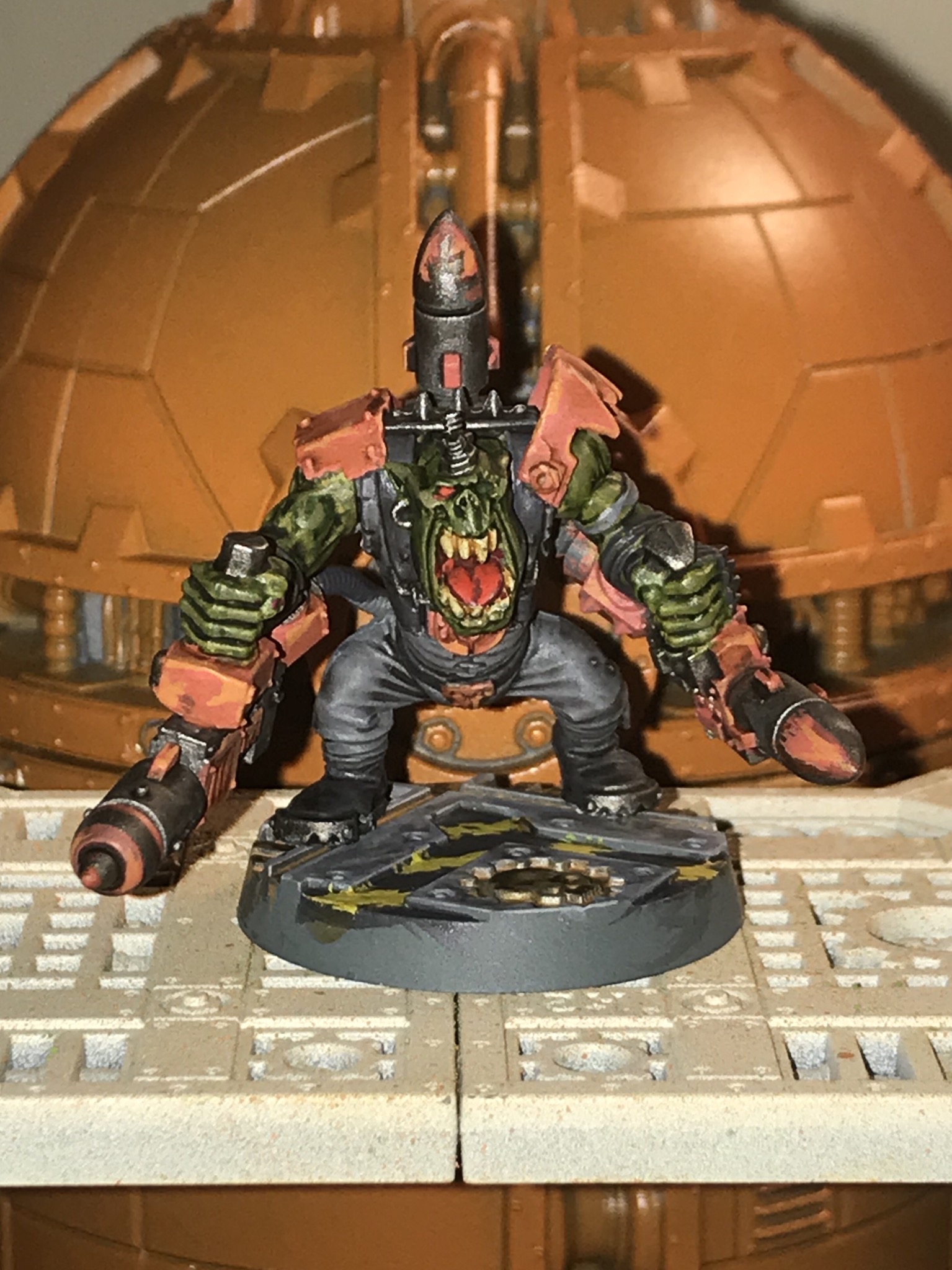 Man I’m really slow at this. Haven’t done a lot at all the past couple weeks. But I did manage to get a tank busta painted and another ready for paint. So captain boom boom is painted. Changed the color scheme. I always do when I start back up on my orks. Don’t know why but I do. And I took monkeytrolls advice and added hoses to the rocket boy and a rocket pack. Gonna start painting him next. But here are some pics with this minor update.