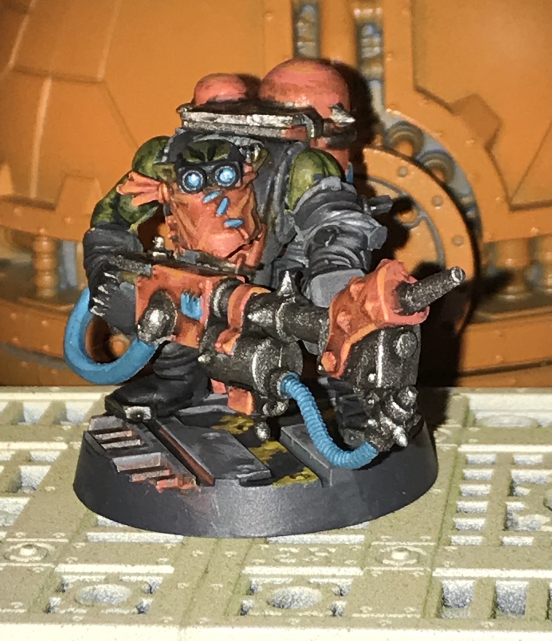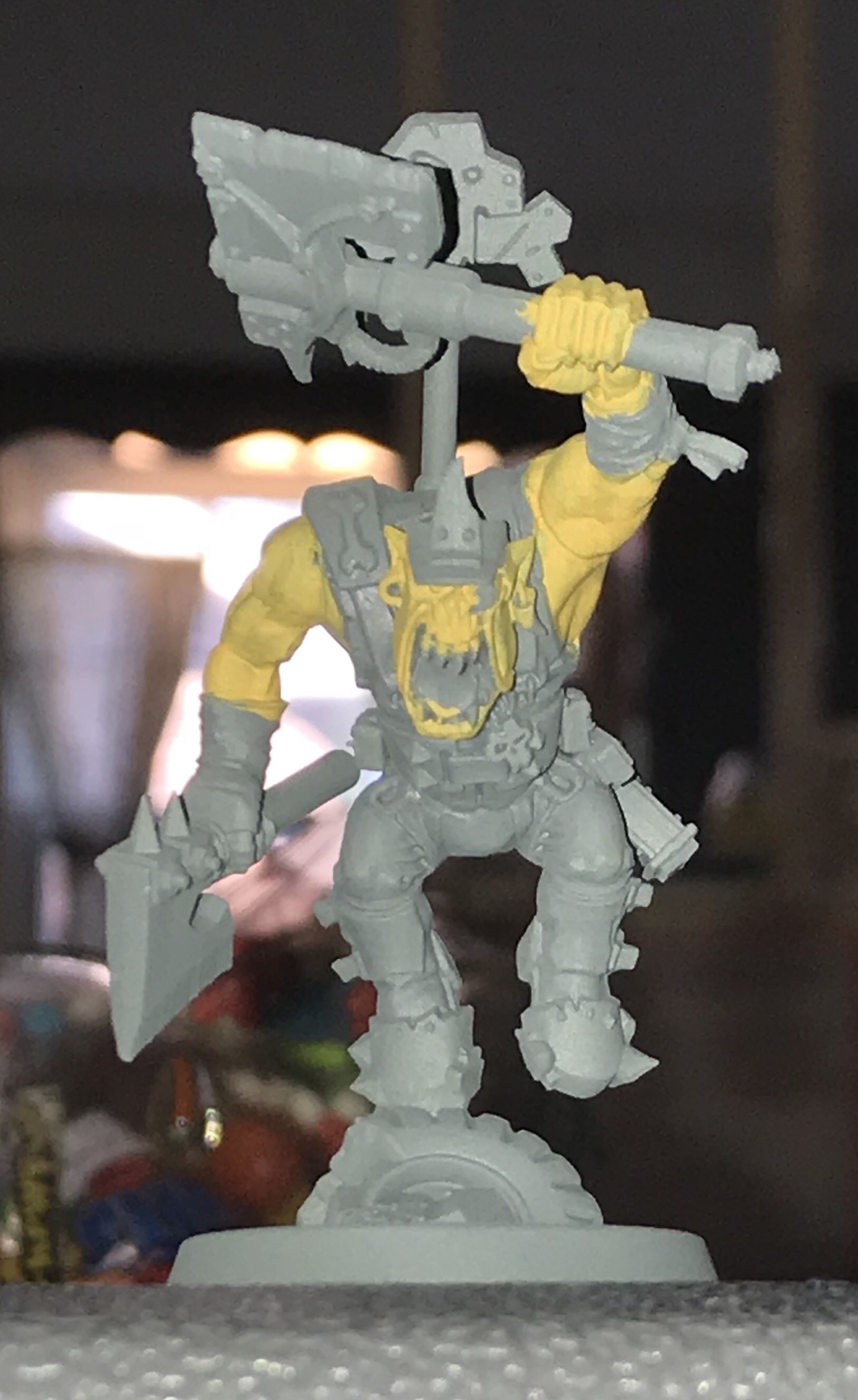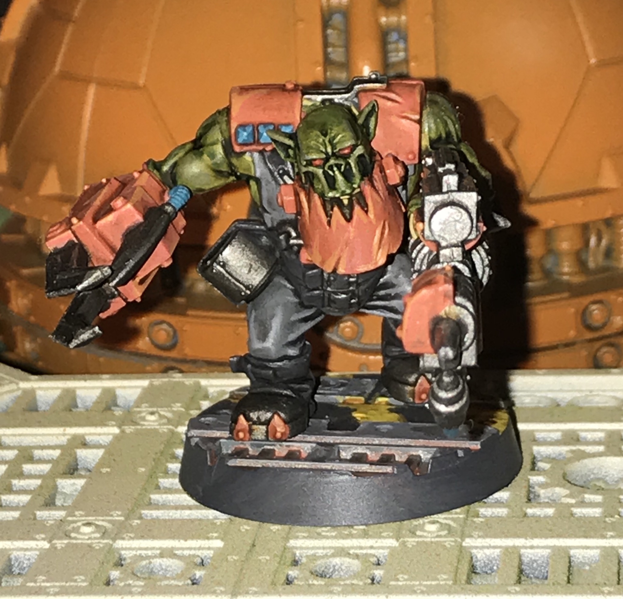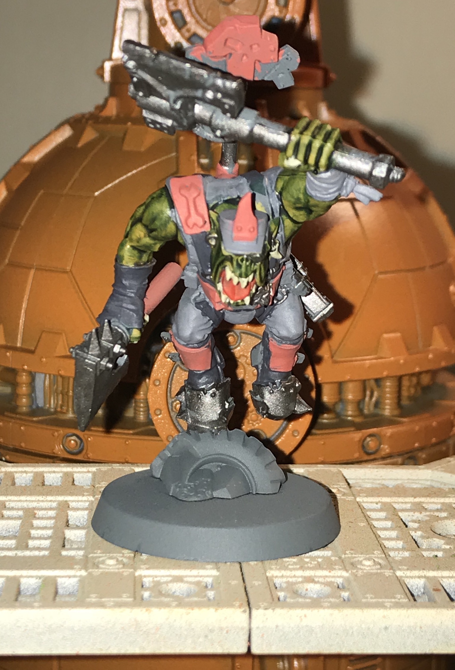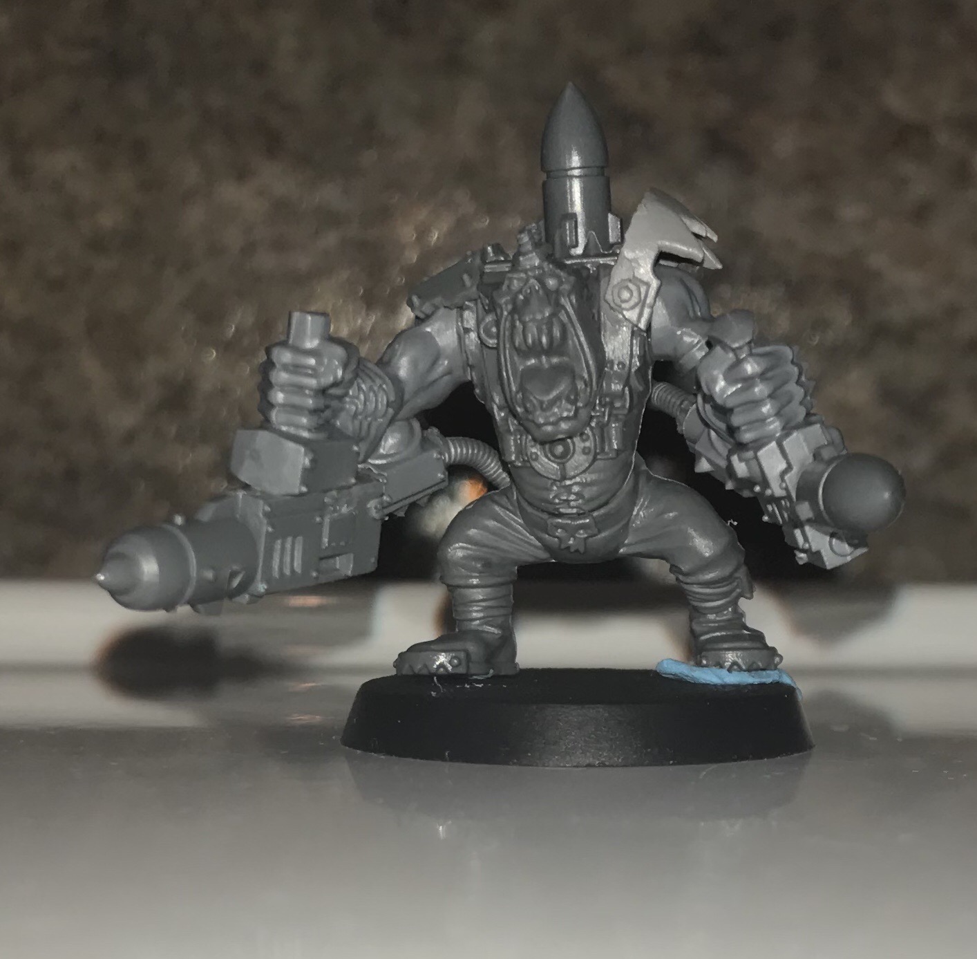 Man I’m really slow at this. Haven’t done a lot at all the past couple weeks. But I did manage to get a tank busta painted and another ready for paint. So captain boom boom is painted. Changed the color scheme. I always do when I start back up on my orks. Don’t know why but I do. And I took monkeytrolls advice and added hoses to the rocket boy and a rocket pack. Gonna start painting him next. But here are some pics with this minor update.
