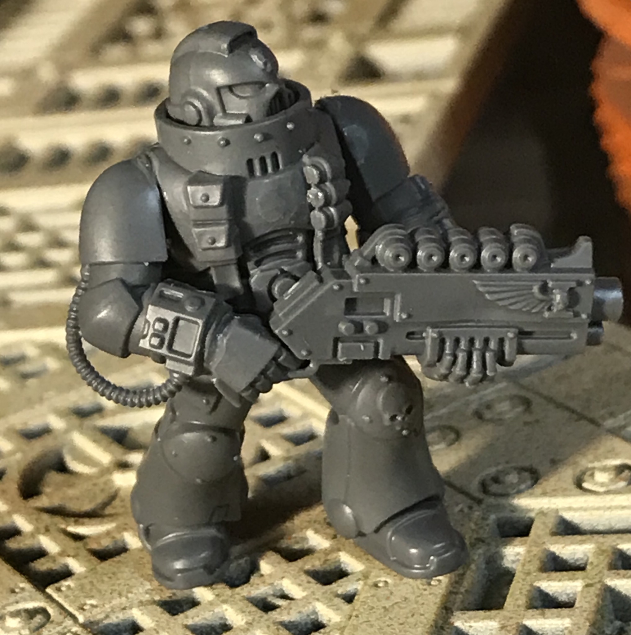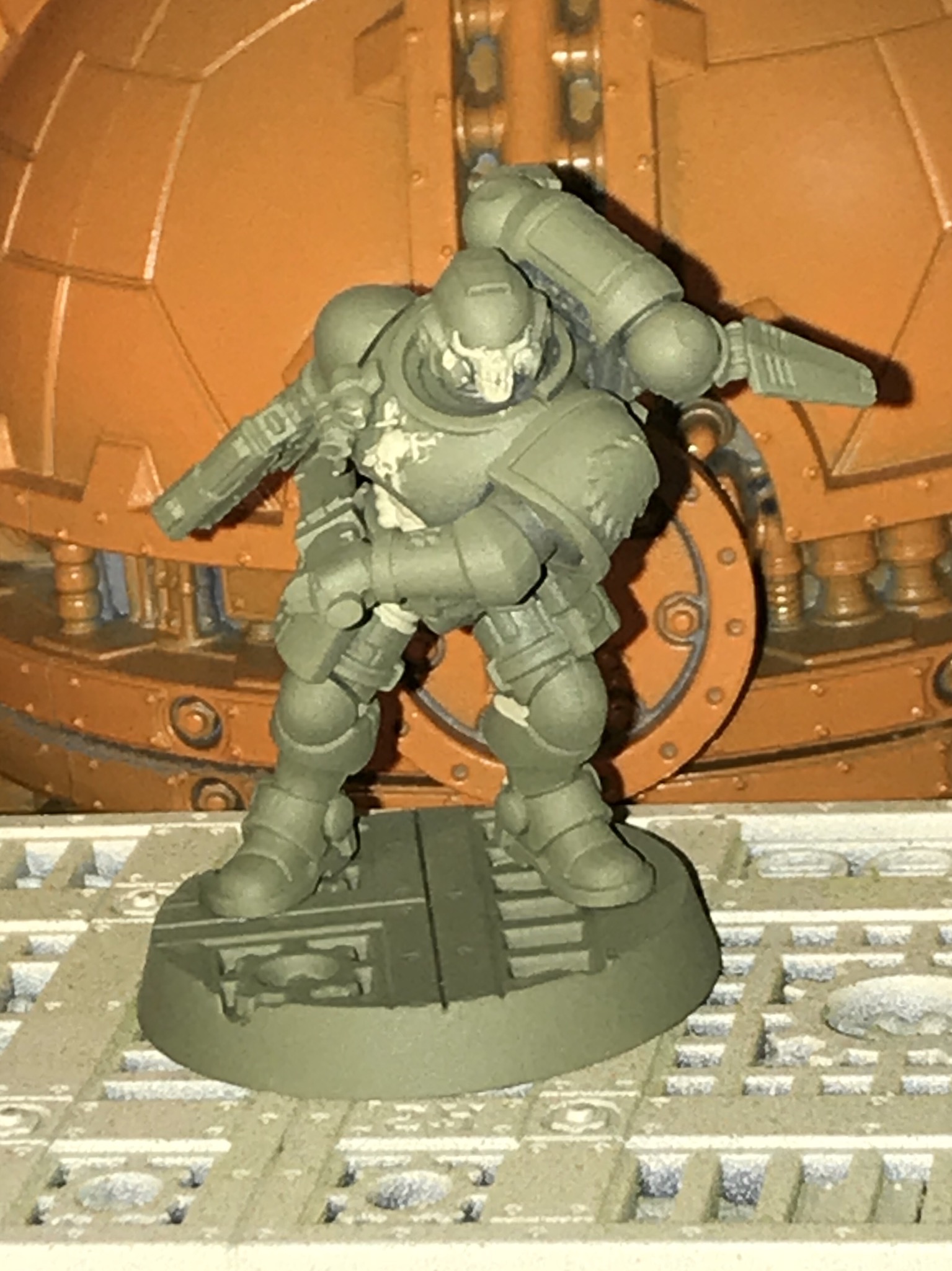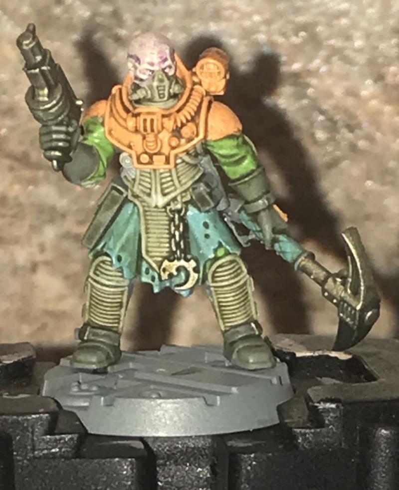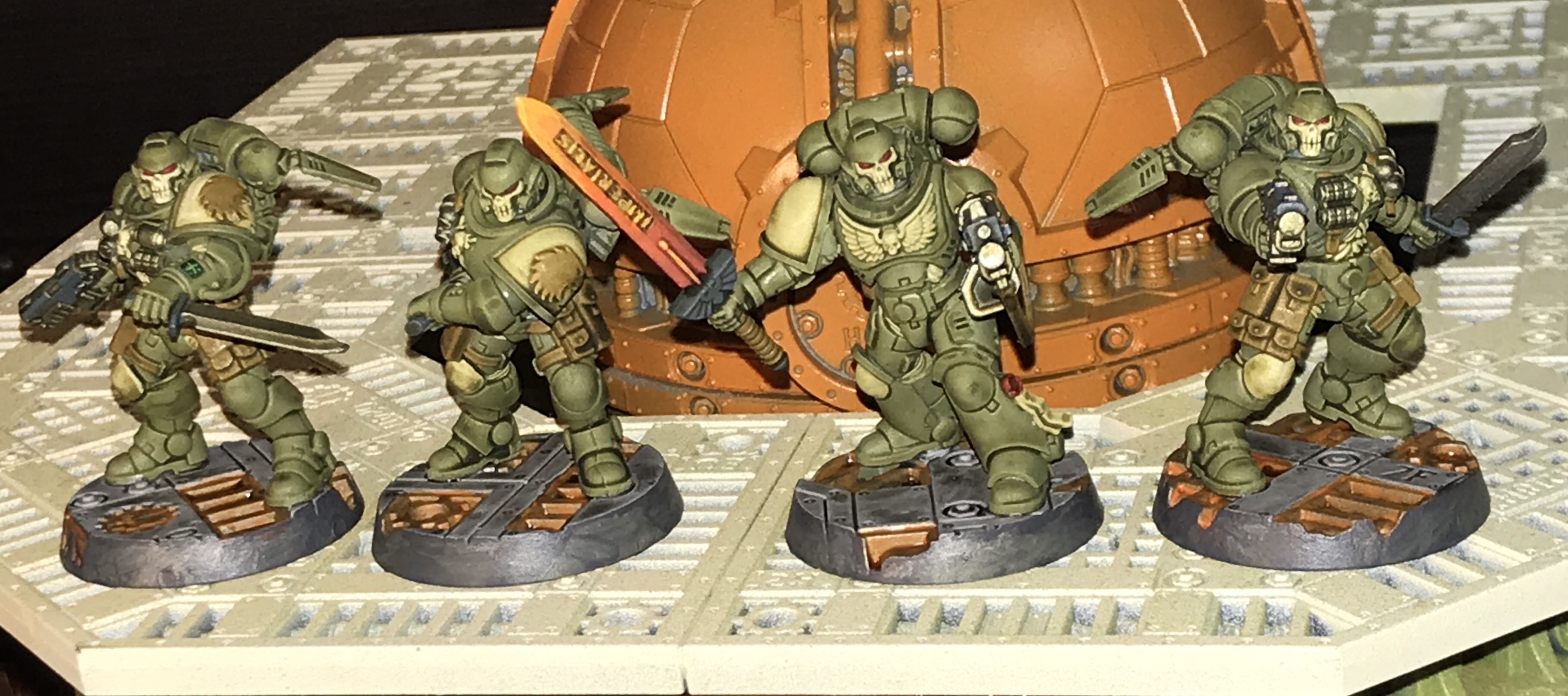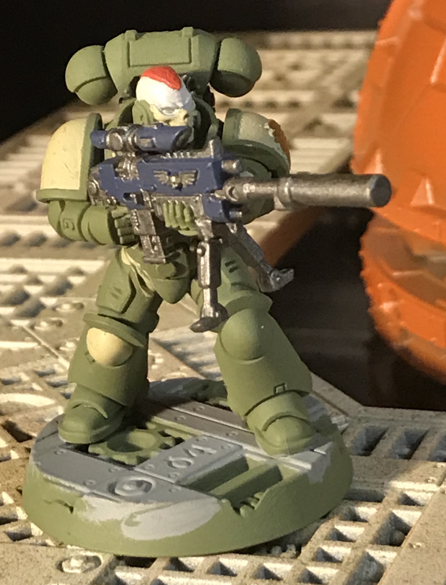 Did some work on the bases. CK I took your advice and used some Nurgle Rot on the rusted bits. Then I played around with the Nihilakh Oxide in the recesses of the rest. I like how it turned out. I hope you can see it from the pic. The I started my sniper with a stalker bolt rifle. Wanted to pull the orange from my orkz into Mohawk. The the first layer done so far. No wash or highlights. Stared kit bashing some normal marines from the Death Watch and regular marine bits to give them a similar look as the rest.