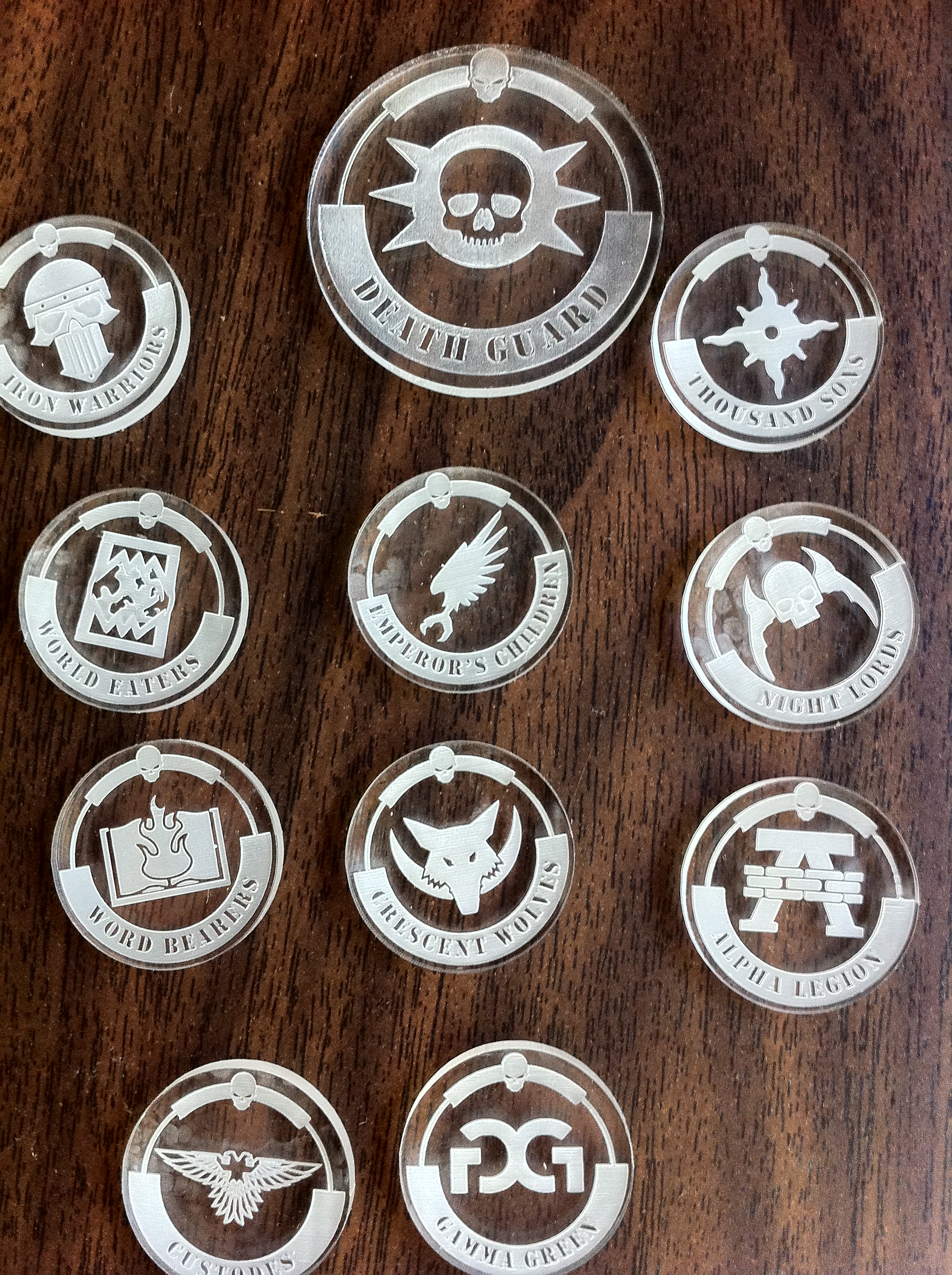 I just finished cutting a commission order for a set of bases with the Yu Jing from Infinity logo. They look pretty damn sexy in mirror acrylic, and can be painted from behind to highlight the 180deg firing arc engraved on the base. Ed's been coming up with some new base designs, I cut a sample set tonight and they're looking pretty cool. He's also done a set that we haven't cut yet that are looking very nice, we'll try and get some pics up soon. Other plans for the month include finishing the wall upgrade pack and new base design ranges.