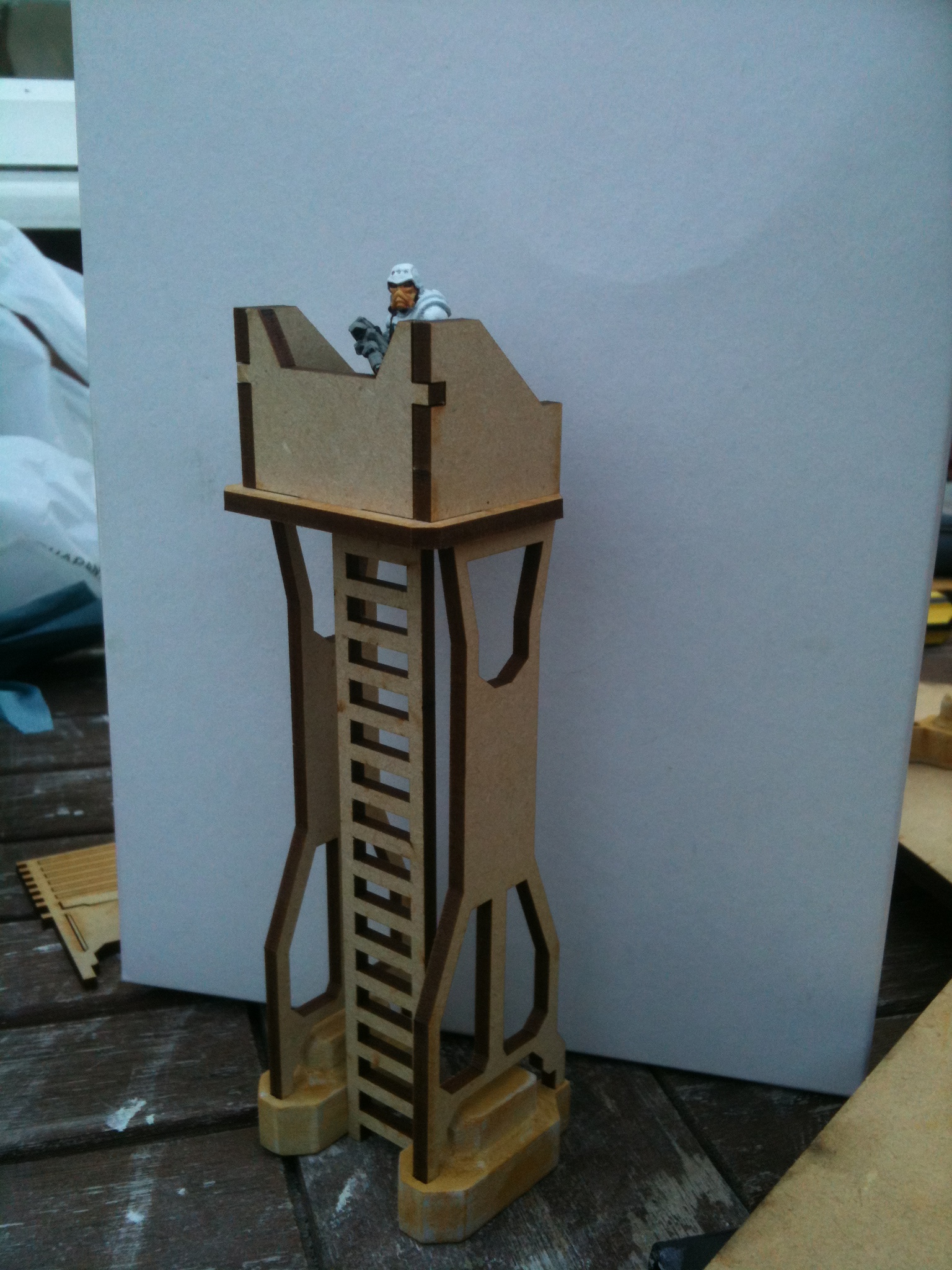 Cut a couple of build testers for the little storage unit / outpost building to test the construction, they went together very nicely, only taking a few minutes to build. They need steps, and they guy who painted our big fortress suggested having a walkway going all the way round for the second level which I reckon is a pretty hot idea, then detail adding. They're a nice size and we should be able to get them out at a good price. Other suggestions are welcome as always