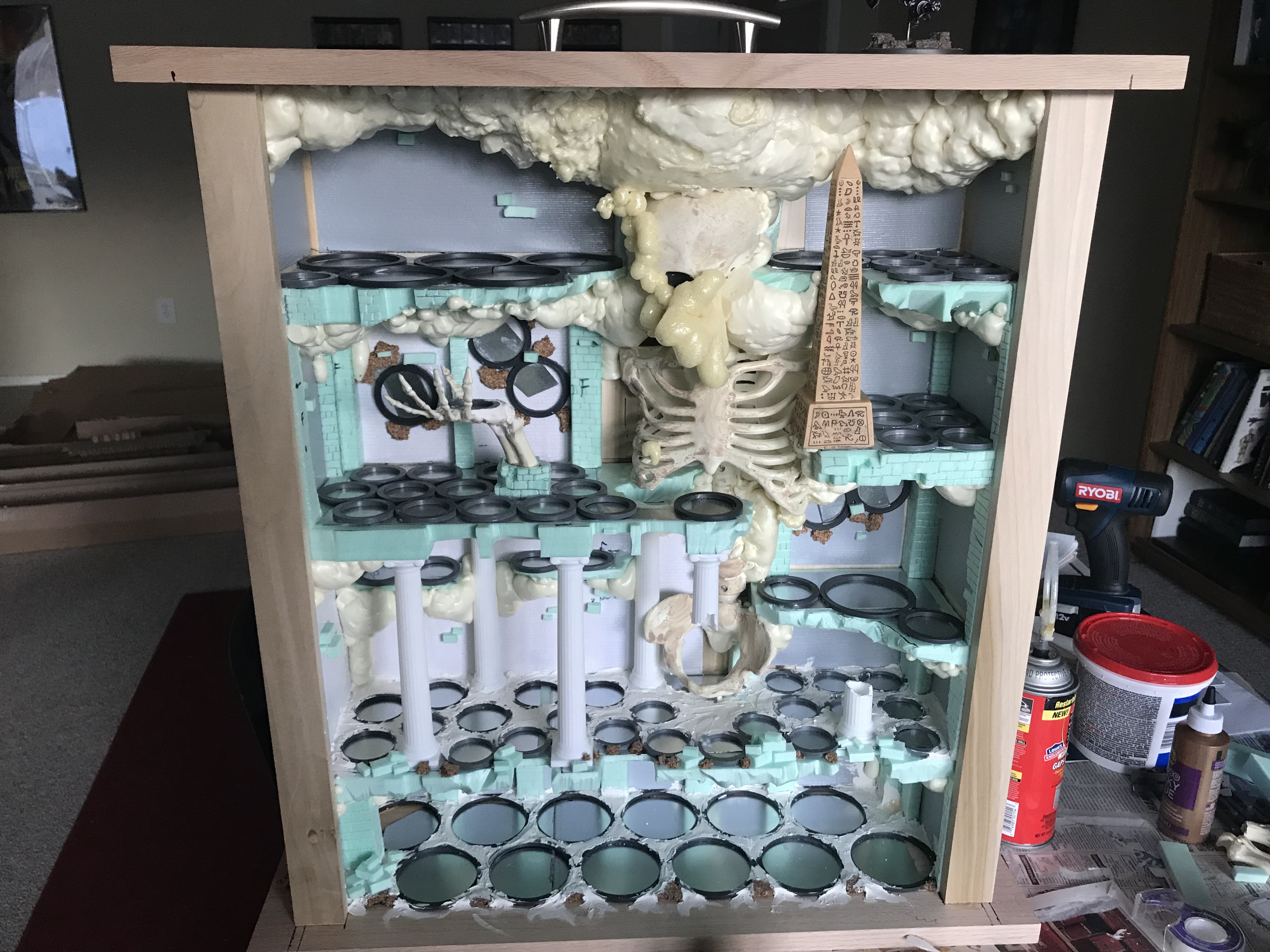Sprayed the rest of the cabinet with foam, this time right-side-up to get the bottom areas covered. Then went wild with a knife inside, cutting out a ton of foam. It's getting there! Really happy with how the foam is shaping into rock around the skeleton and other areas. And lastly, got spackle filled in between all the spacer rings on every level.