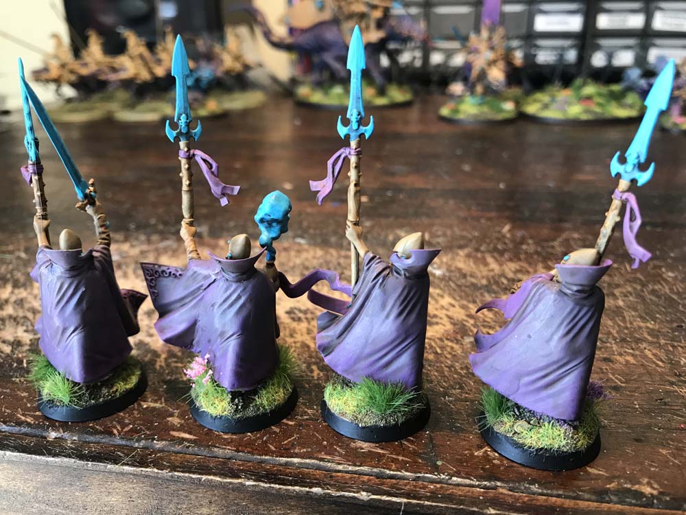I particularly like those warlocks - especially the one on the right with the orb. That's a really cool pose, even if it is pretty much straight out of the empire wizard box it's amazing how much difference an eldar helmet makes.