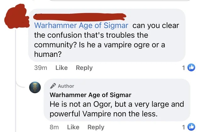 Yeah, maybe I'm wrong and the design team/lore team gave the community team the wrong notes. Or maybe the Customer Service team running the Facebook page doesn't have the same information as the preview team. Or maybe GW wants to stress that the Wolf is a Vampire first and foremost, so that the people asking if he's an Ogor can't complain later on that they cannot take him as part of an Ogor Mawtribes force.