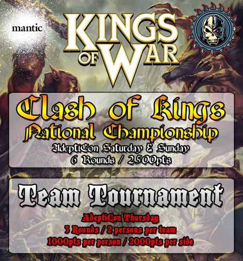AdeptiCon 2016 is proud to host the inaugural Kings of War: Clash of Kings National Championship and Team Tournament! Join this epic clash of armies in what will prove to be legendary tournaments using ManticGame’s set of massed fantasy combat rules.