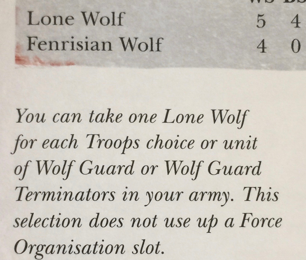 jy2 wrote: There are troops in the army. The rules for the Lone Wolf does not say that the troop has to be from the Space Wolf detachment. It doesn't even have to be a troop from the SW codex. It just has to be a troop in the army. I know that's a technicality, but the RAW is correct, even if the RAI probably isn't.