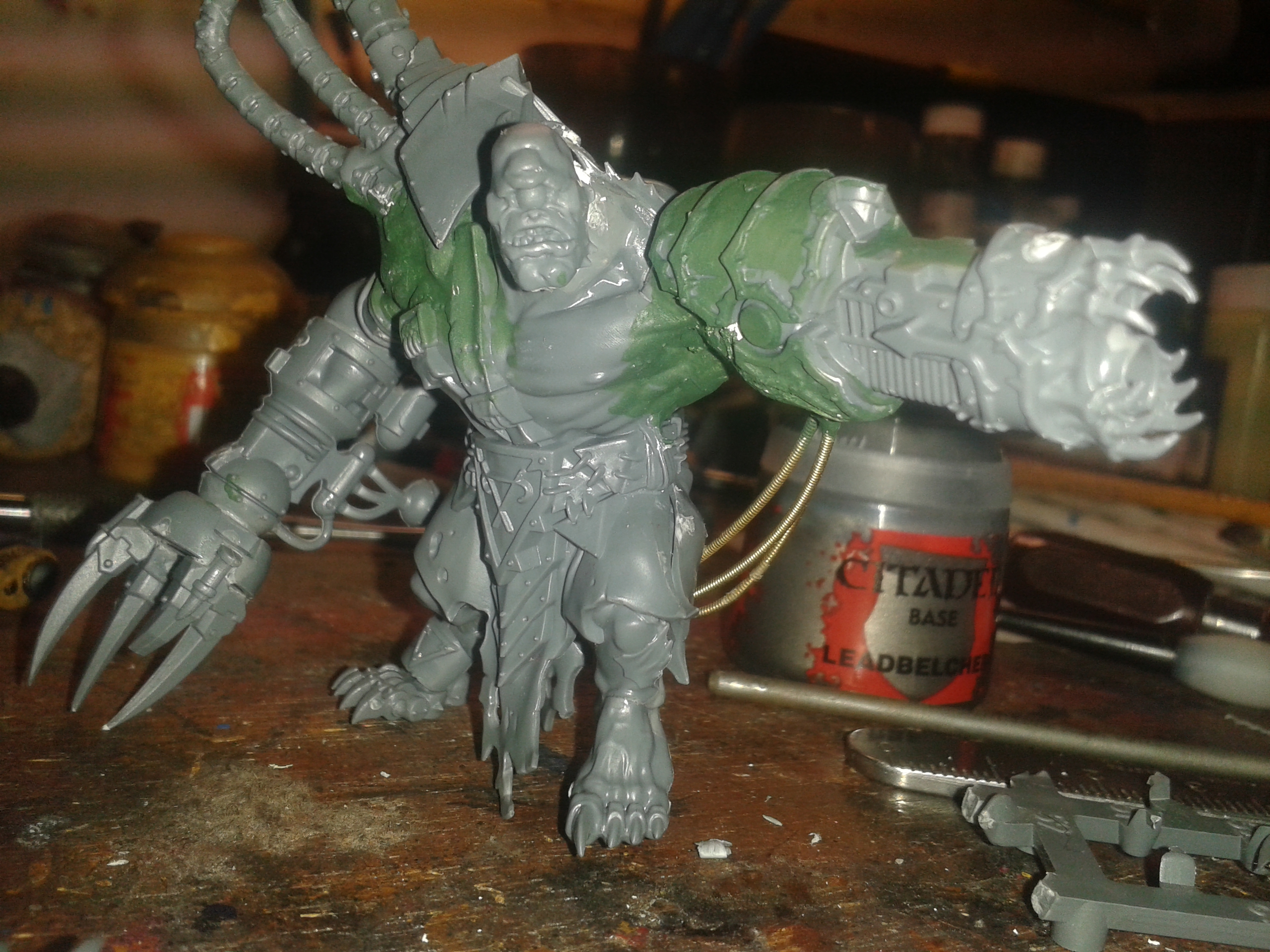 I've been a lurker on Dakka lately, and this competition actually inspired me to register as a new user and join the community. I've got a hulking (soon to be) green monster that's been sitting on my shelf awhile. I like the kitbash I did so much that I'm afraid to mess it up by painting it. Also, since he's standing on a decapitated head, it's a bit more gory than my usual style (I don't normally paint blood on, etc, but there's no getting around it this time). I've modeled and painted like 5 minis since building this guy, and I figure that by entering a competition (even an unofficial one), now I have to paint him up proppa, and soon, no more excuses. Here's my "proof pic":