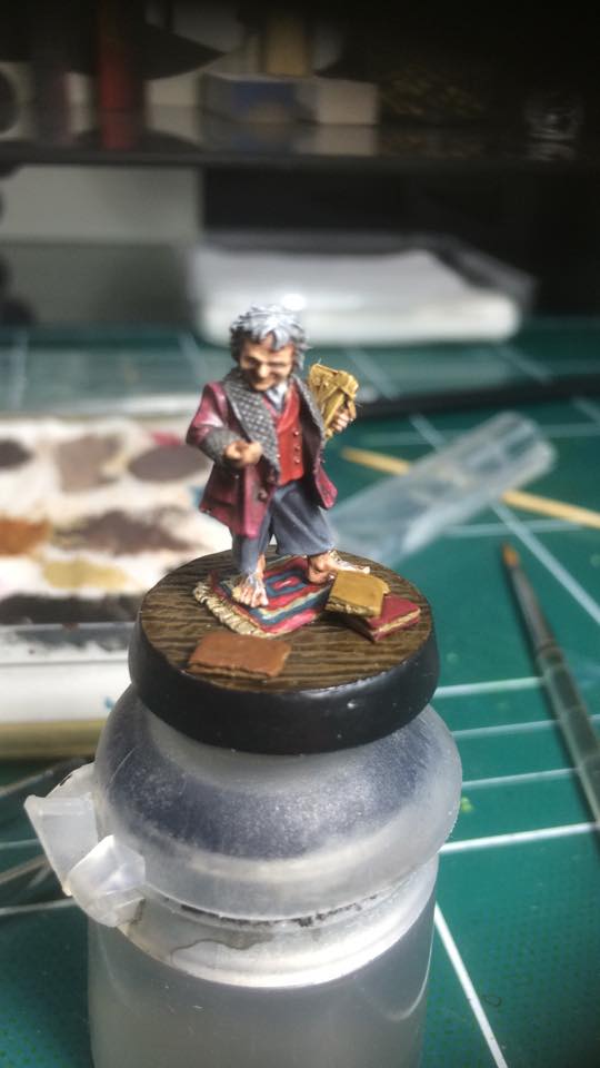 Up early to do a bit of work on wee Bilbo here. Quick WiP. Trousers and jacket are more or less complete. May add another thin glaze later on. Quoted cuffs and lapels are annoying me so gonna leave them for the while and move onto the book and the the skin. Hope yea like him. Fun wee fig to paint