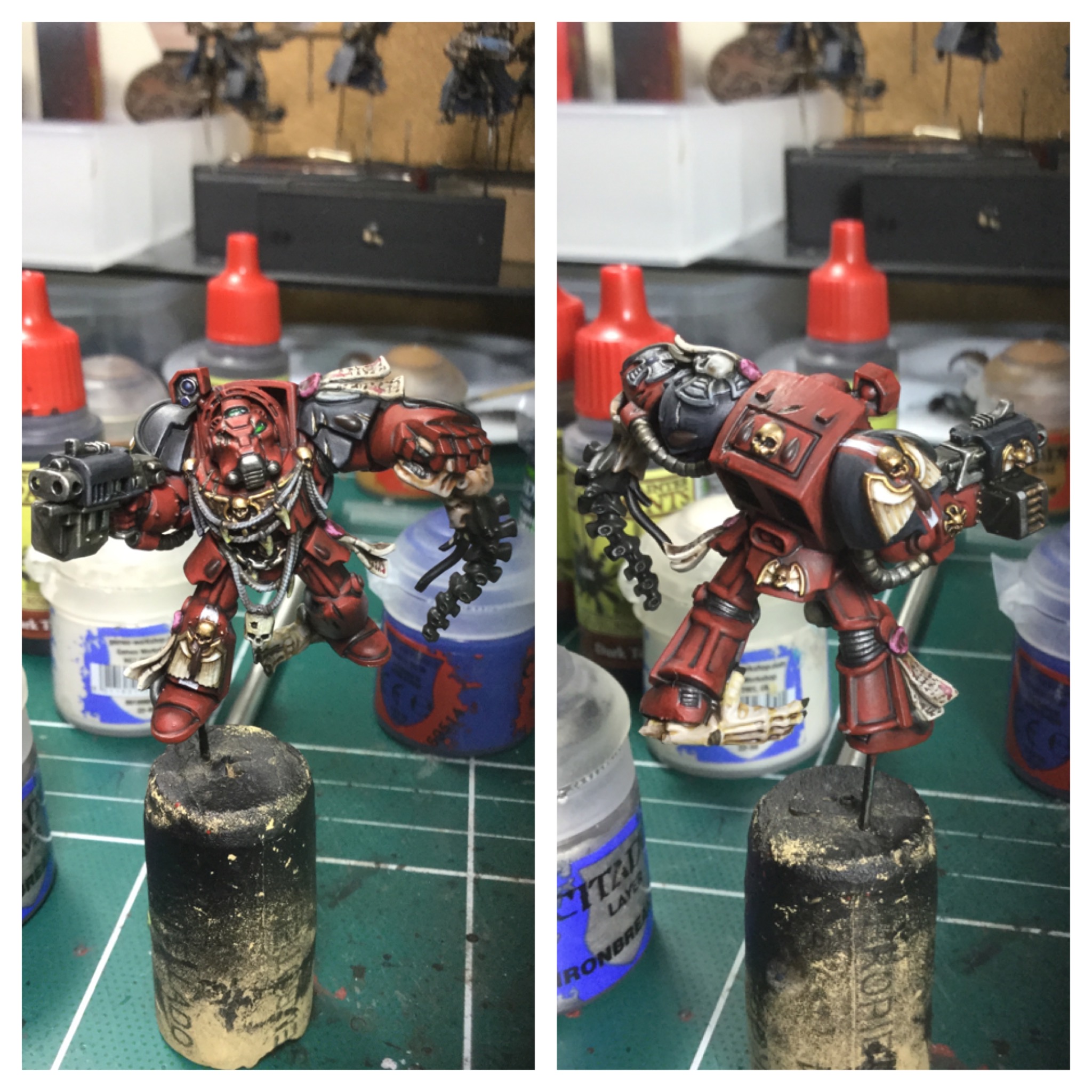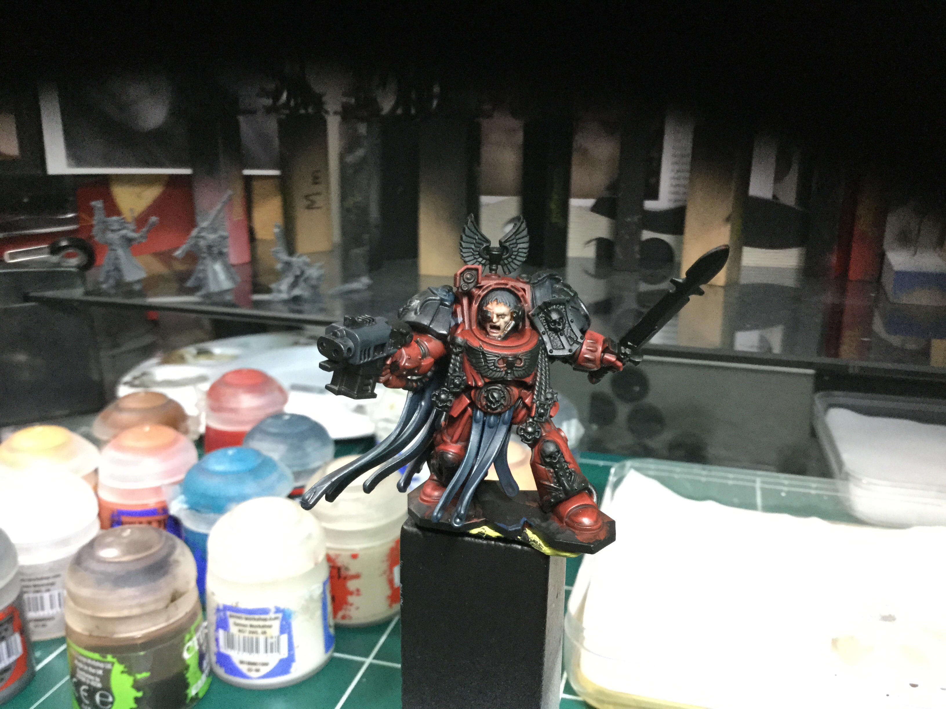 Cheers AoV - not a fan of Blood Angels much; their reds are just a bit ick. So did the sarge there up in a darker tone and made him more of the flesh tearers with the black pauldrons. Looks a lot more worn and actually like armour that made it through battles. Still need to finish him up - cloak, metals and then lotsa weathering and damage - he's on a hulk fighting for his life though endless hordes of filthy bugs after all!!!!