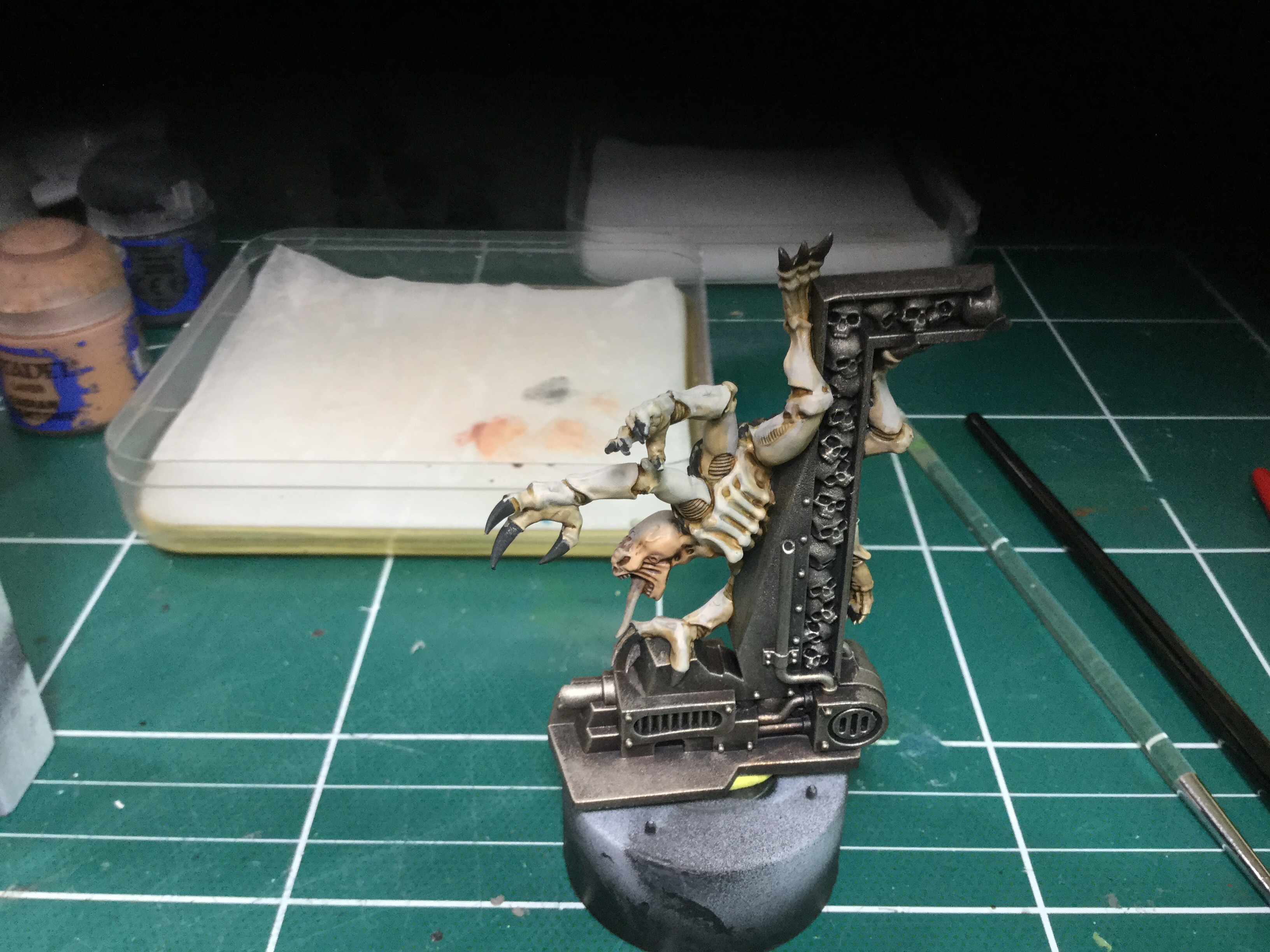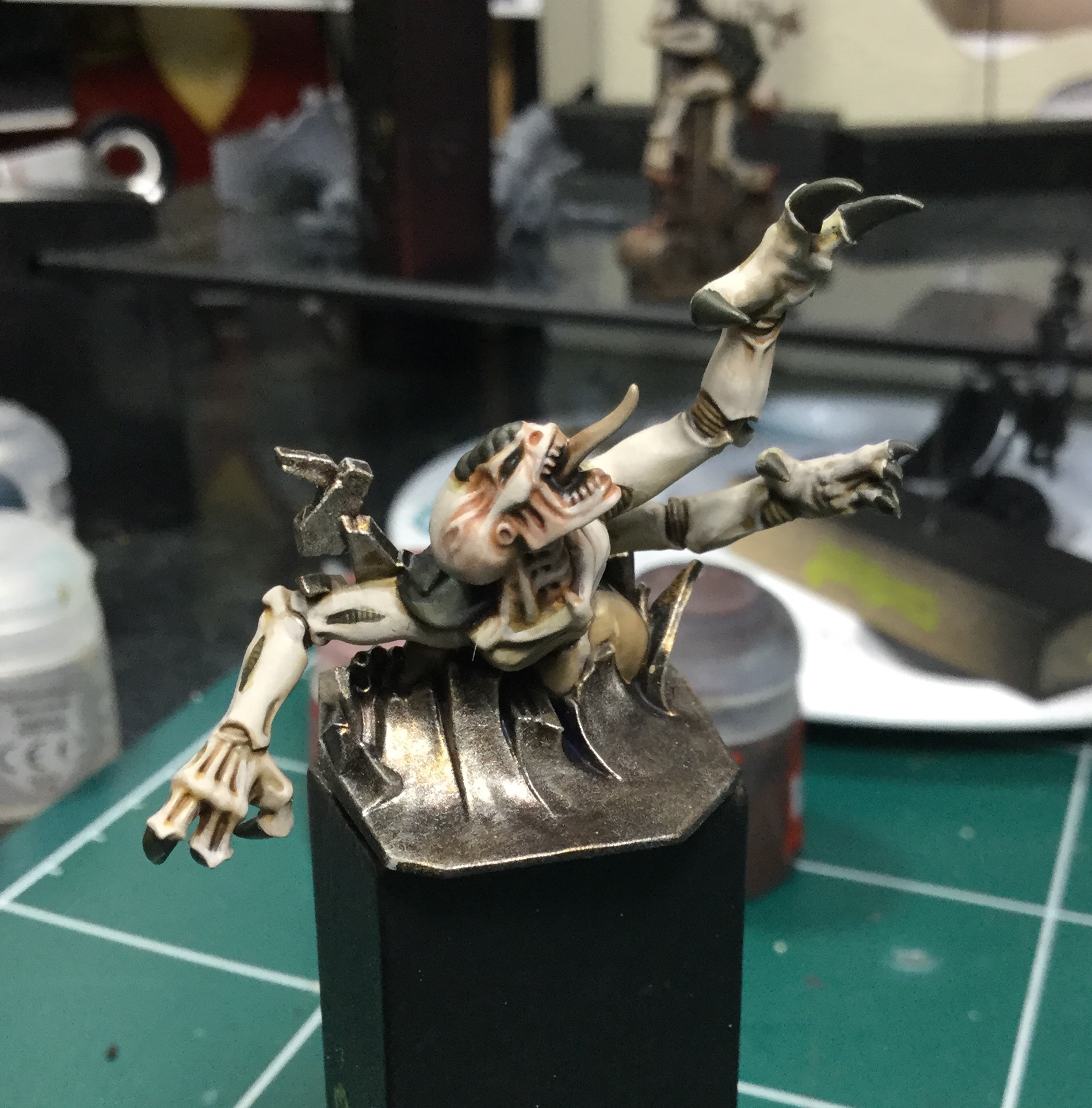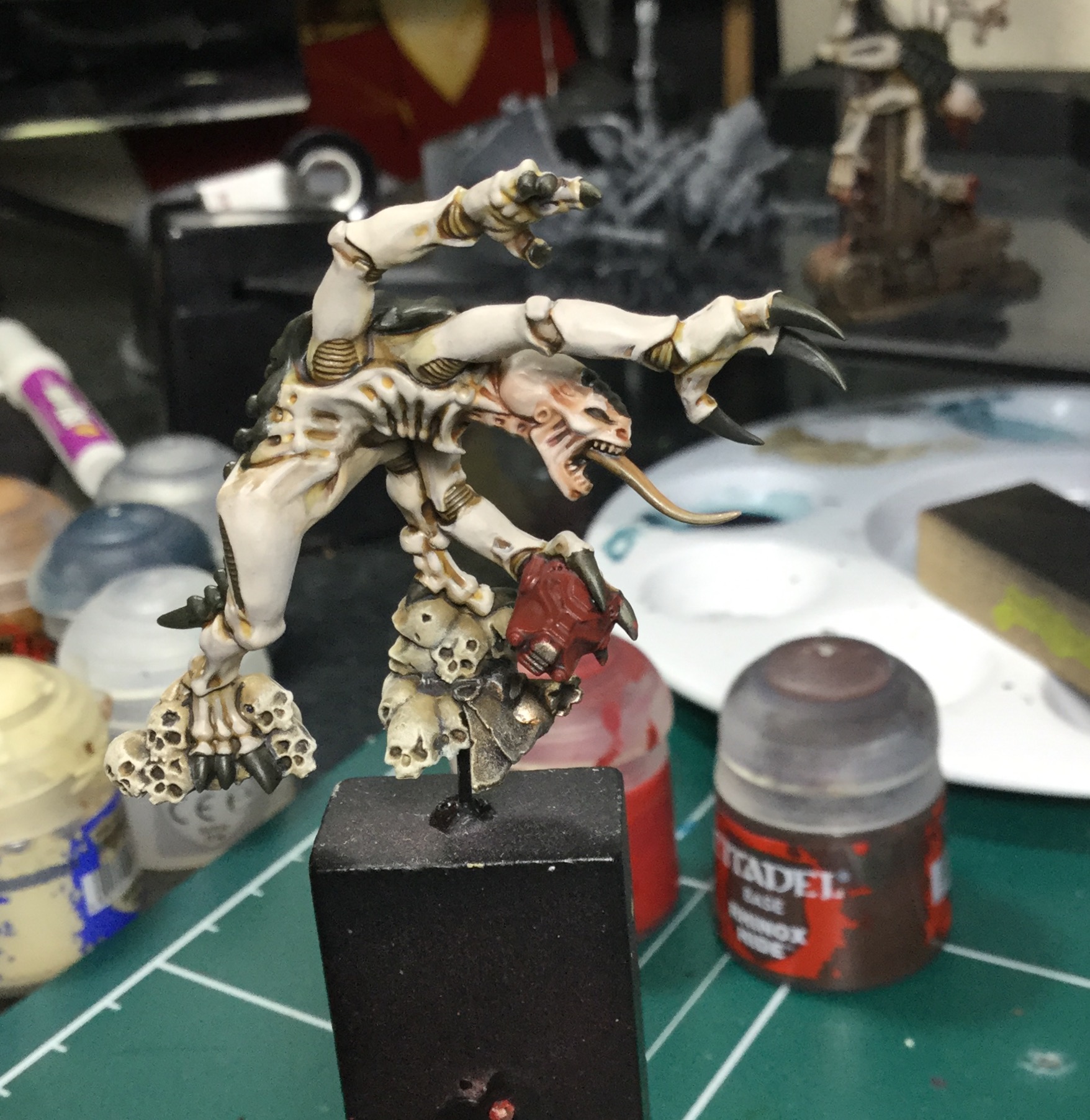 Not at all Para. The flesh work is almost entirely rakarth flesh, paint wise. lots n lots of really thing layers to get that pale chalky tone. The shadow sides are done with rakarath and a little tau light ochre mixed in. Lots of washes, firstly seraphim sepia after the base layers, then later agrax into the dark shaded areas and a touch of nuln. the faces dont get that wash but a reikland fleshshade instead. more rakarth and any areas that are realy exposed and subject to the direct light get a little pallid wych mixed in. The claws and carpace are black adn xv88 mixed until it loses its brown adn takes on an olivey green tone. That gets a final wash with camoshade on the carapce and also where the cara meets the flesh. the maws are/will washed with thinned down BFTBG and then blood splatter is painted on undiluted. Tht's basically it....more or less