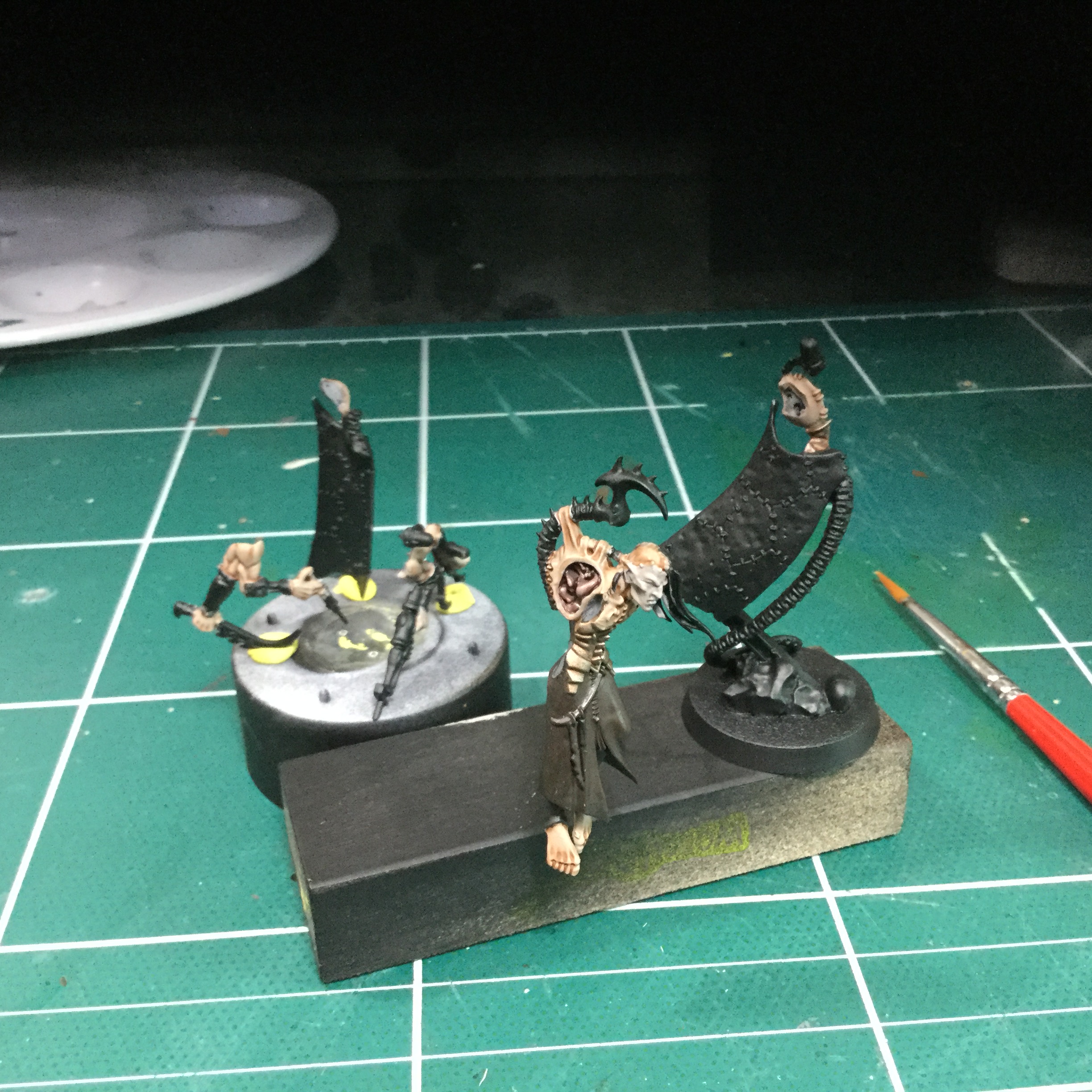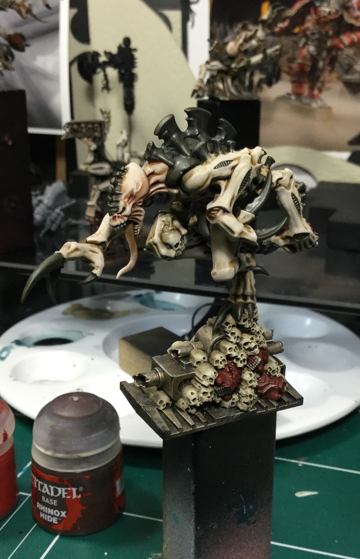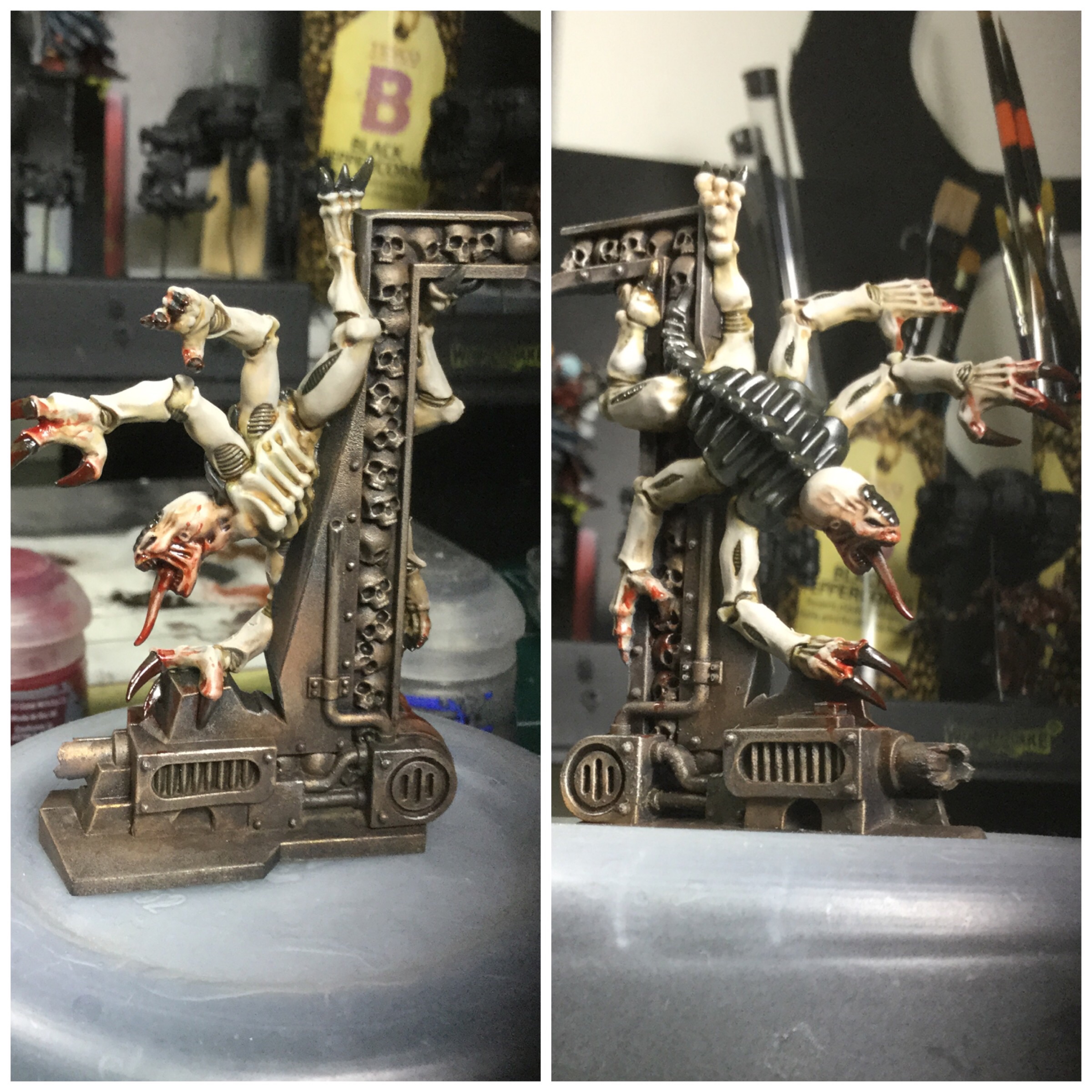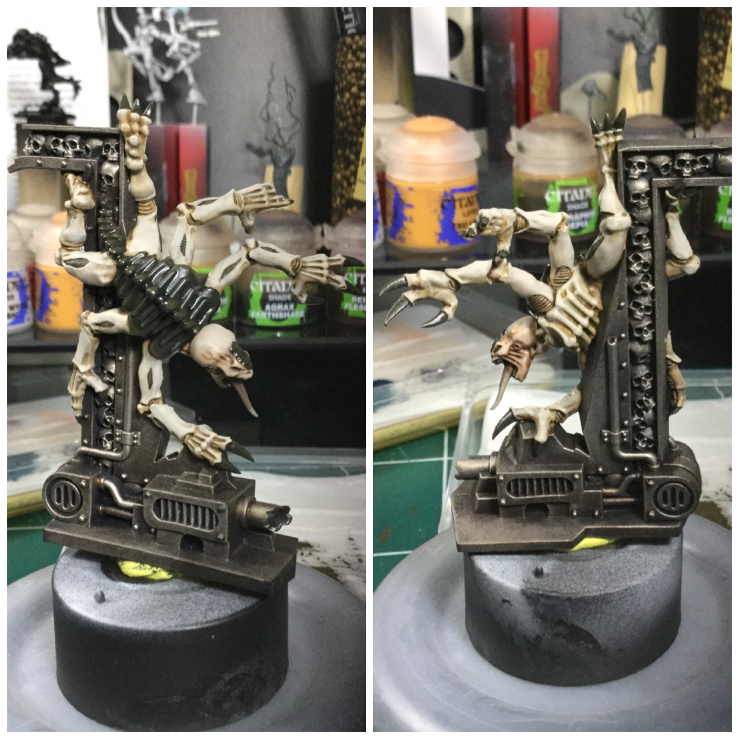 Not at all Para. The flesh work is almost entirely rakarth flesh, paint wise. lots n lots of really thing layers to get that pale chalky tone. The shadow sides are done with rakarath and a little tau light ochre mixed in. Lots of washes, firstly seraphim sepia after the base layers, then later agrax into the dark shaded areas and a touch of nuln. the faces dont get that wash but a reikland fleshshade instead. more rakarth and any areas that are realy exposed and subject to the direct light get a little pallid wych mixed in. The claws and carpace are black adn xv88 mixed until it loses its brown adn takes on an olivey green tone. That gets a final wash with camoshade on the carapce and also where the cara meets the flesh. the maws are/will washed with thinned down BFTBG and then blood splatter is painted on undiluted. Tht's basically it....more or less