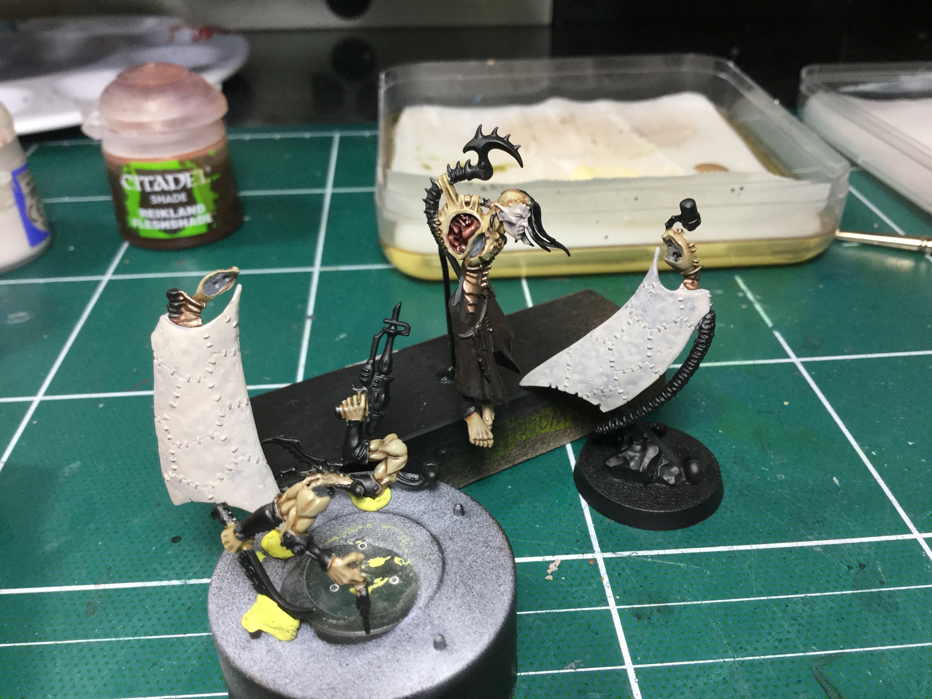 Looks nice. I really like the idea of a dark eldar painted with light tones.