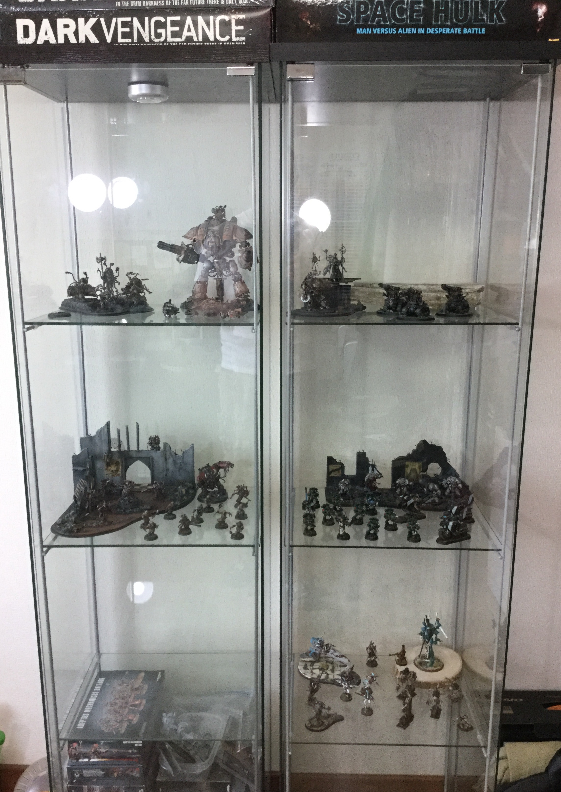 Wednesday!! Finish work at lunchtime!!! Head home and my new (second) display cabinet had arrived. 8282 and get building. Much less swearing involved this time than with the first one!! I now actually have spare space ( that's never gonna last) and everything is much less cramped. My growing taghmata force of Achlys III gets the top shelves across the two cases.. DV takes the second level and Space Hulk and (eventually) DW:O with take tier three...... Think I need another cabinet