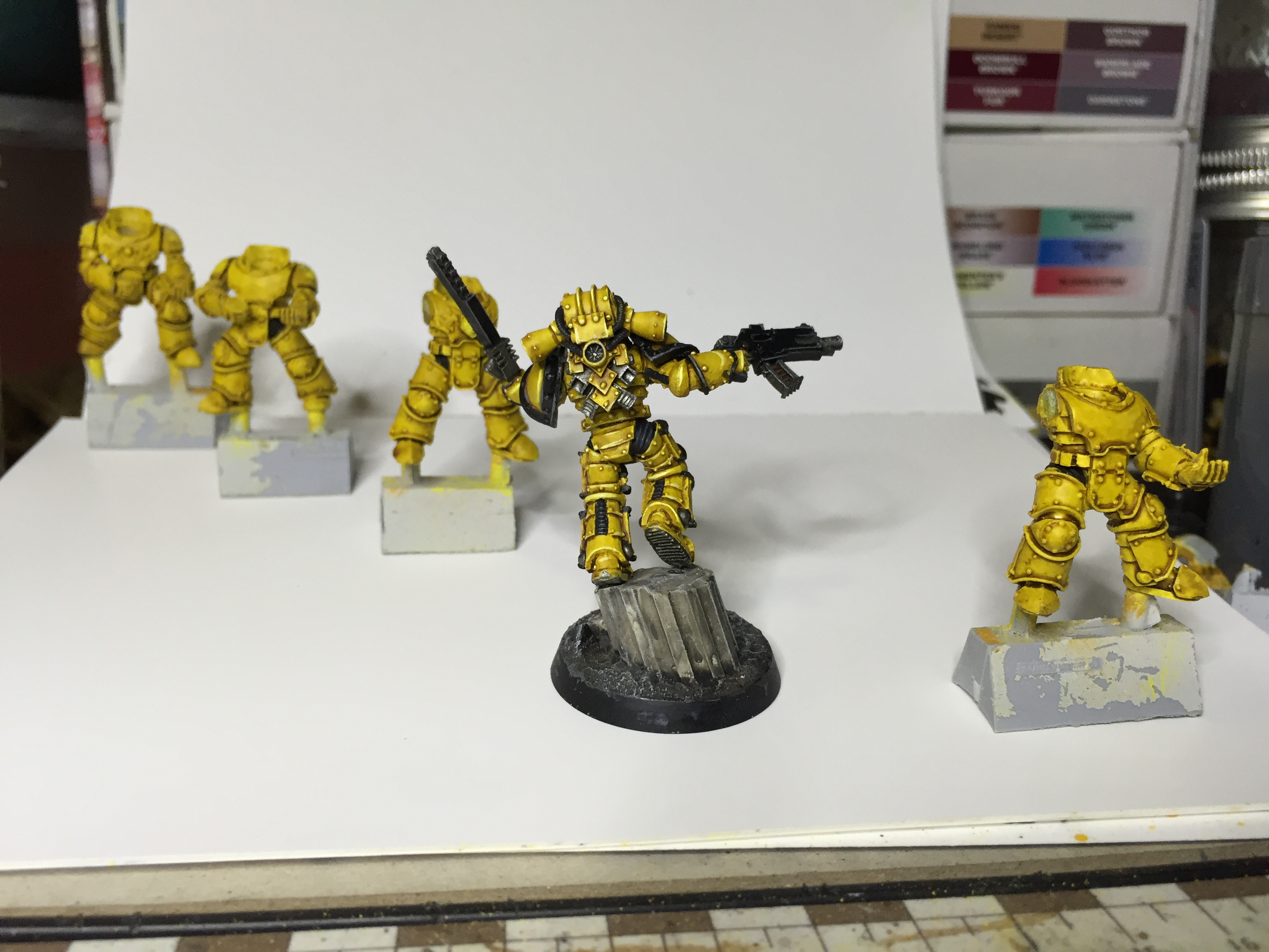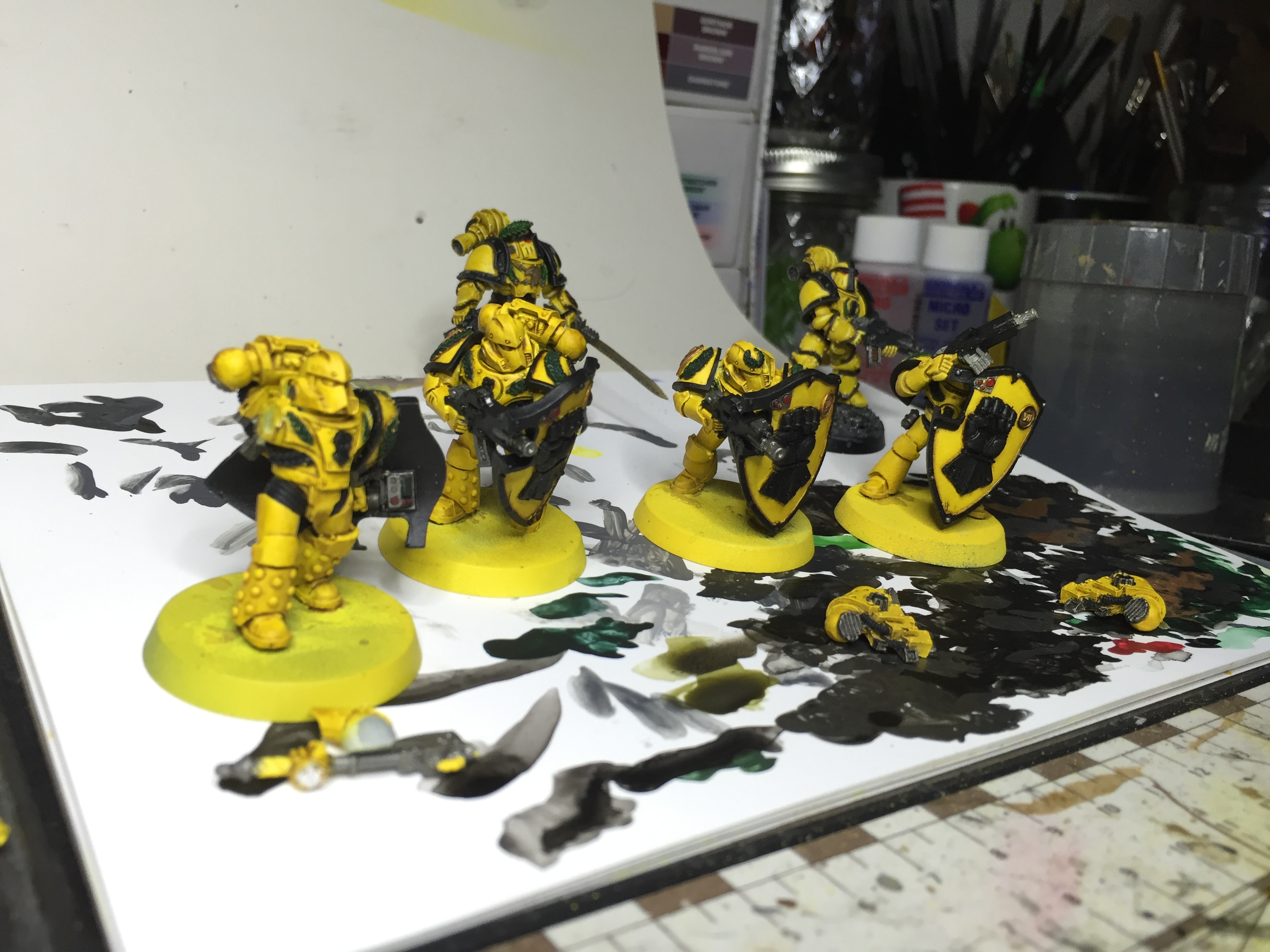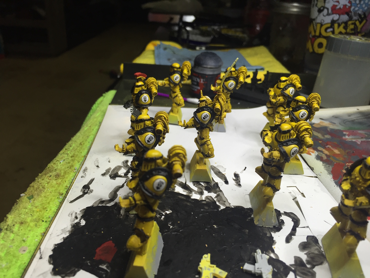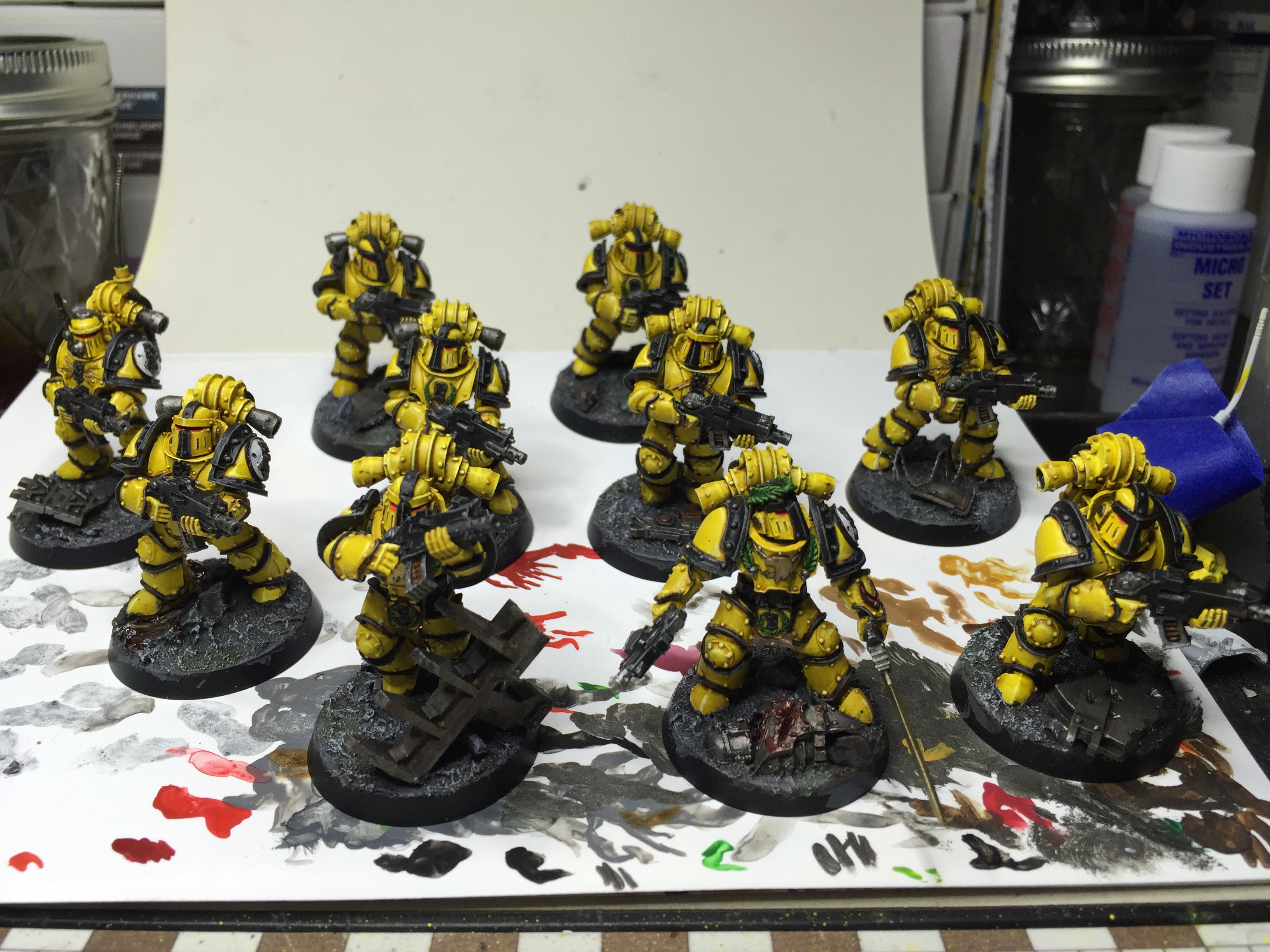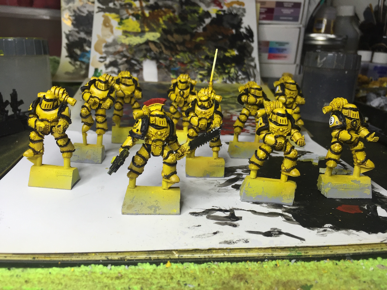 Gorgeous! Love the yellow and especially love the pops of green mixed in there man! Very clean (As in cleanly painted!) and slick looking squad. Nice basing too!