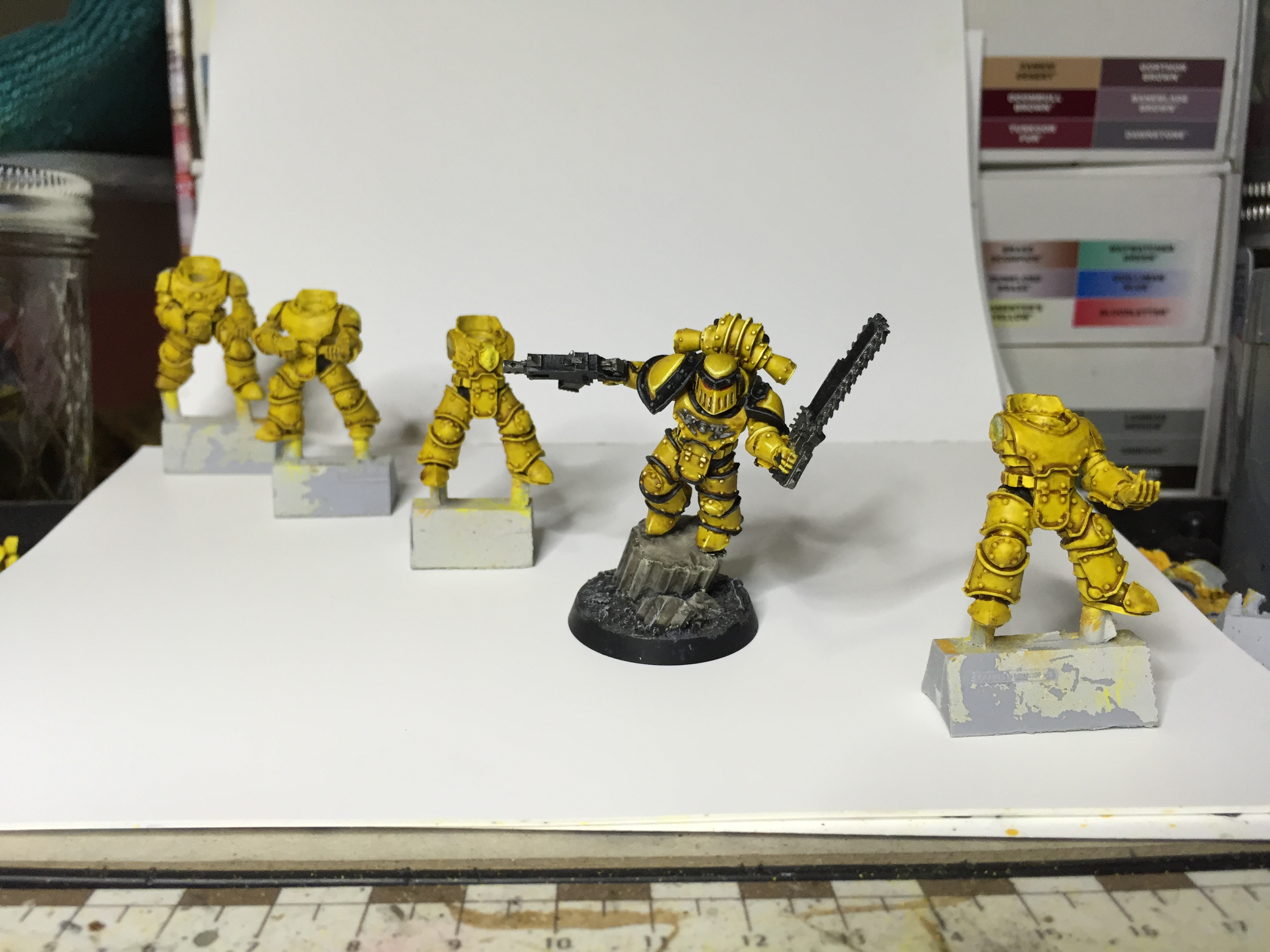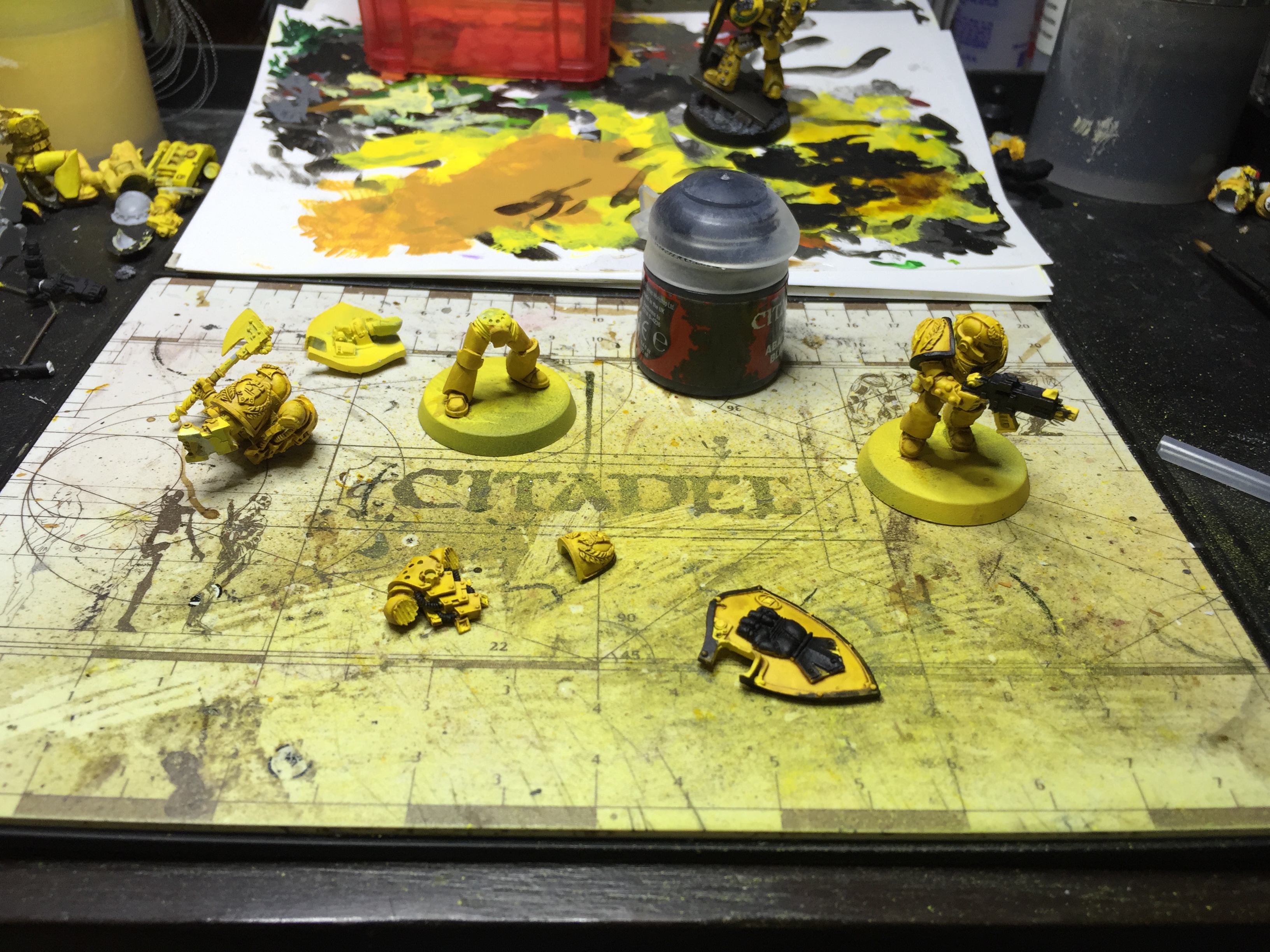 As Promised, i have some advancements on my infantry: I applied highlights (Dorn yellow), followed by Sigismund Yellow (cwutididther) using GWs paint gun. Then I applied a matte varnish. The following steps will include a thinner Dorn yellow high light (the 2-tone i mentioned in the first post). Then I will do the blacks and other colors.
