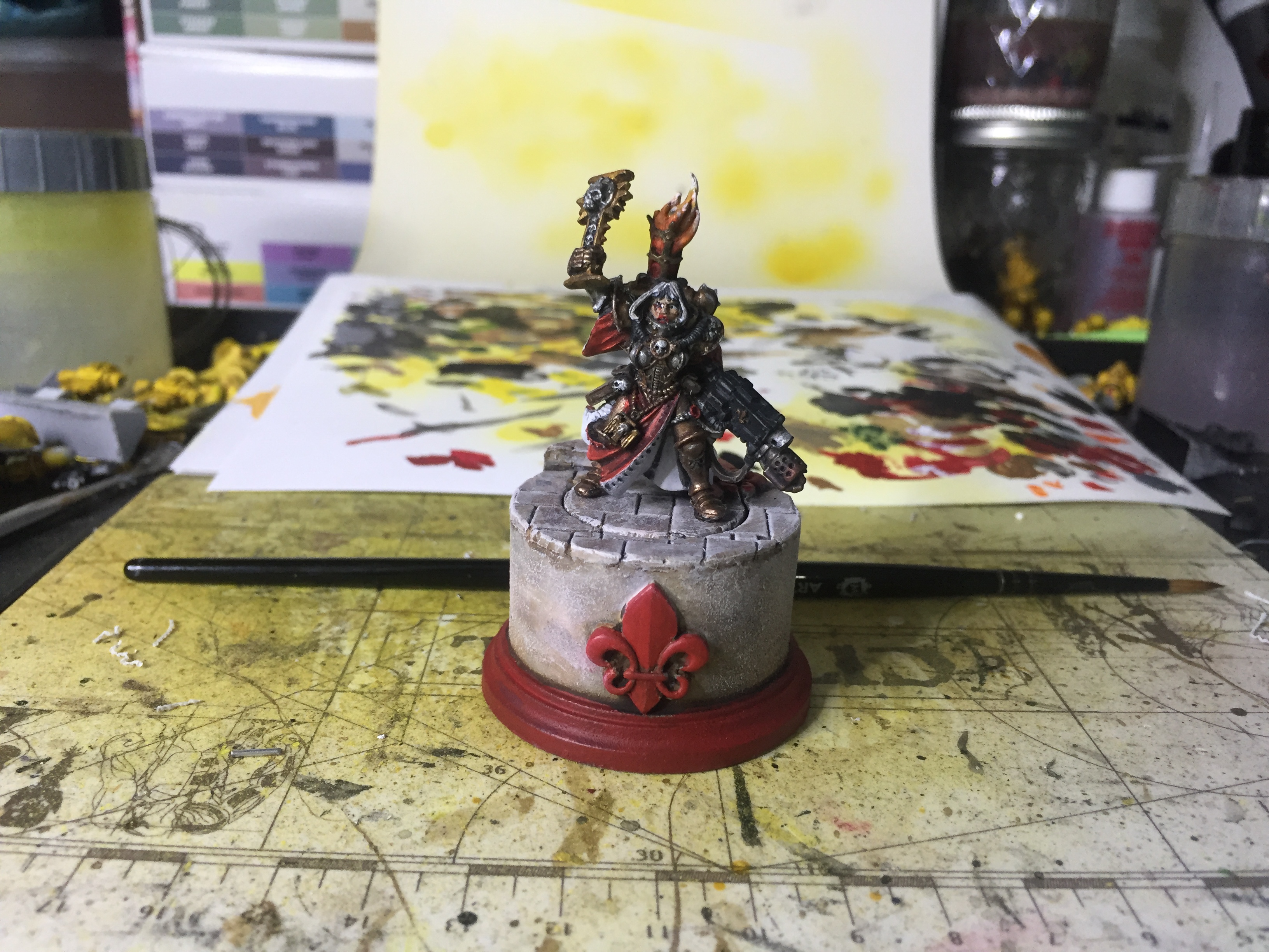 The only critique I'll offer for the Champion is perhaps add some brown washes to the upper leg/thigh areas and forearm armor detail. I can see there's some amazing filigree work in there on the armor but the gold (Very nice gold by the way!) is kind of washed out on the yellow back ground. Having a shade in there to help define it and make it pop would help folks see it more easily. It's such a cool part of the model, I want you to show it off more.