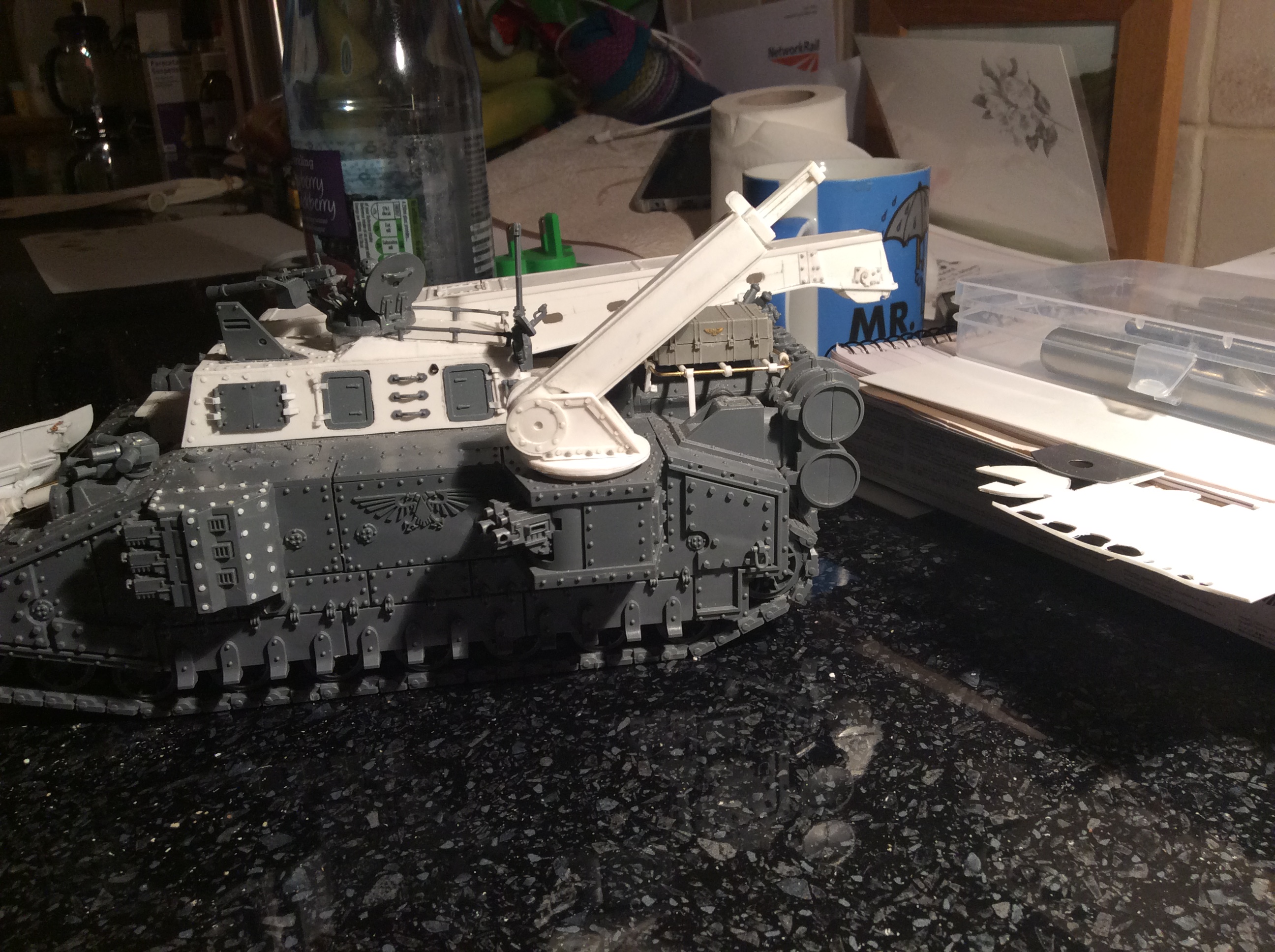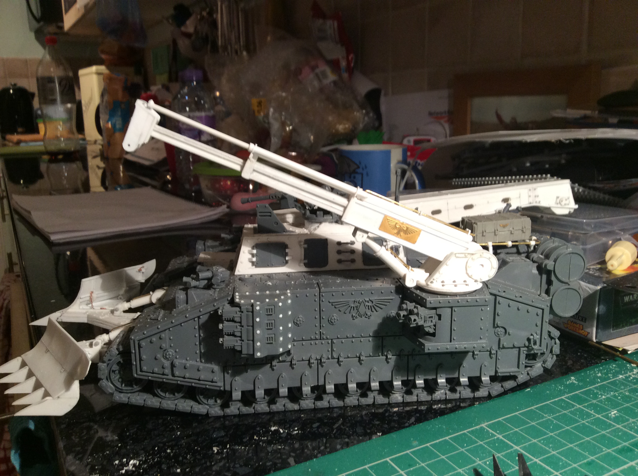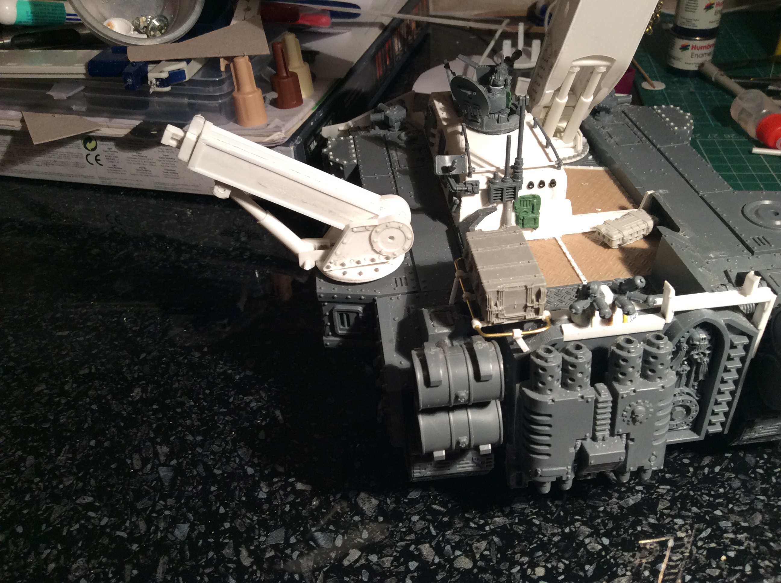 Mmmmm, food for thought. Like the idea of a excavator arm, lots of ram and rivet detail potential. Have been building a telescopic crane for another project . aquired an incomplete forgeworld bombard kit and I am currently converting it to a Trojan type supply vehicle with scratch built trailer. The crane from the kit was a bit short for what I wanted so I extended the first section by 20mm and then completely rebuilt the second section as a telescopic jib, but could scratch build something like it for one of the sponsons.