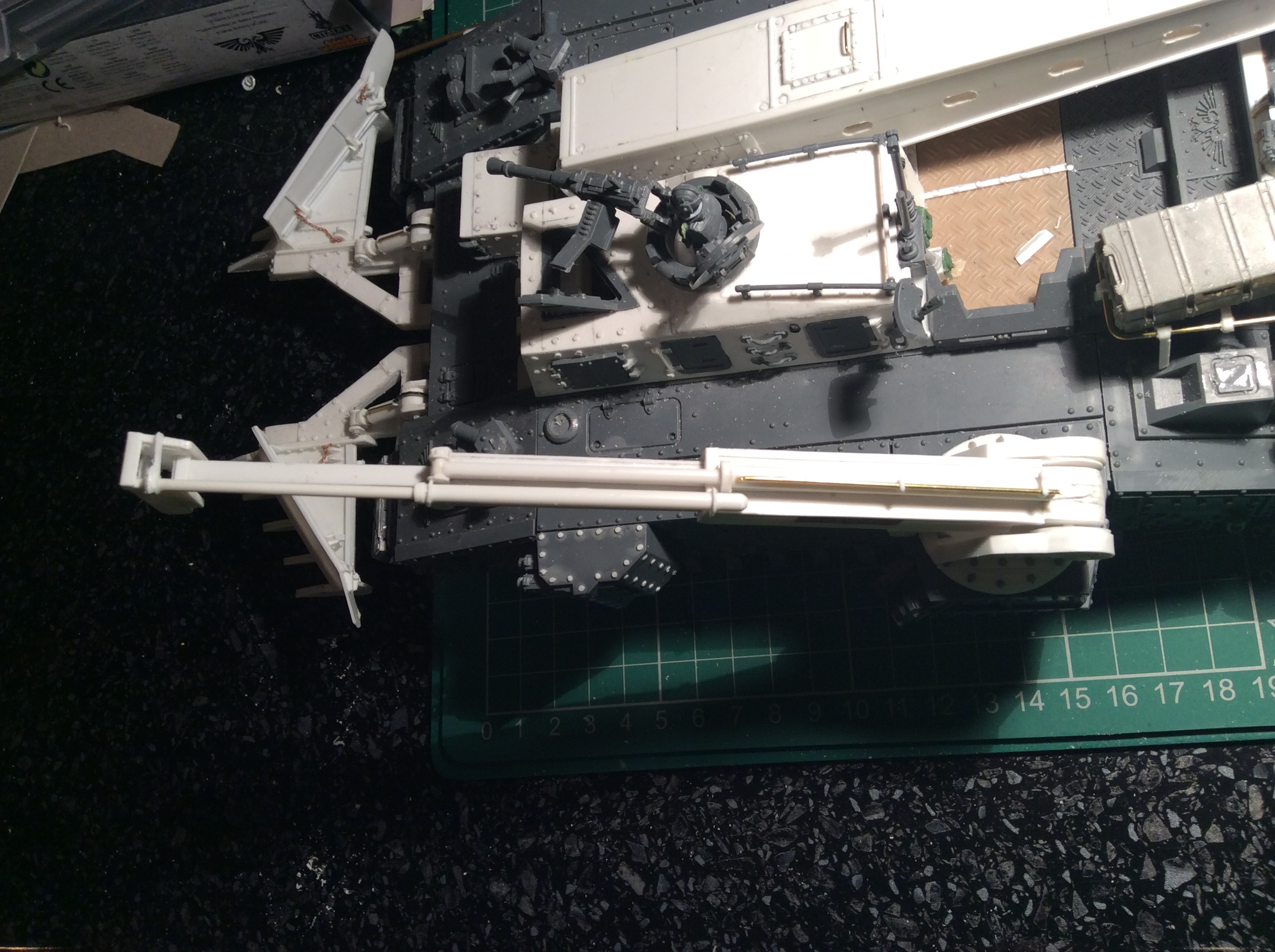 As this is supposed to be a recovery vehicle it has some defensive weaponry, the sponsons have the bolters fitted but i think i will leave the turrets off. ive added addition bolters from the stormraven kit to the sides aswell, these are located at the front of the chassis.