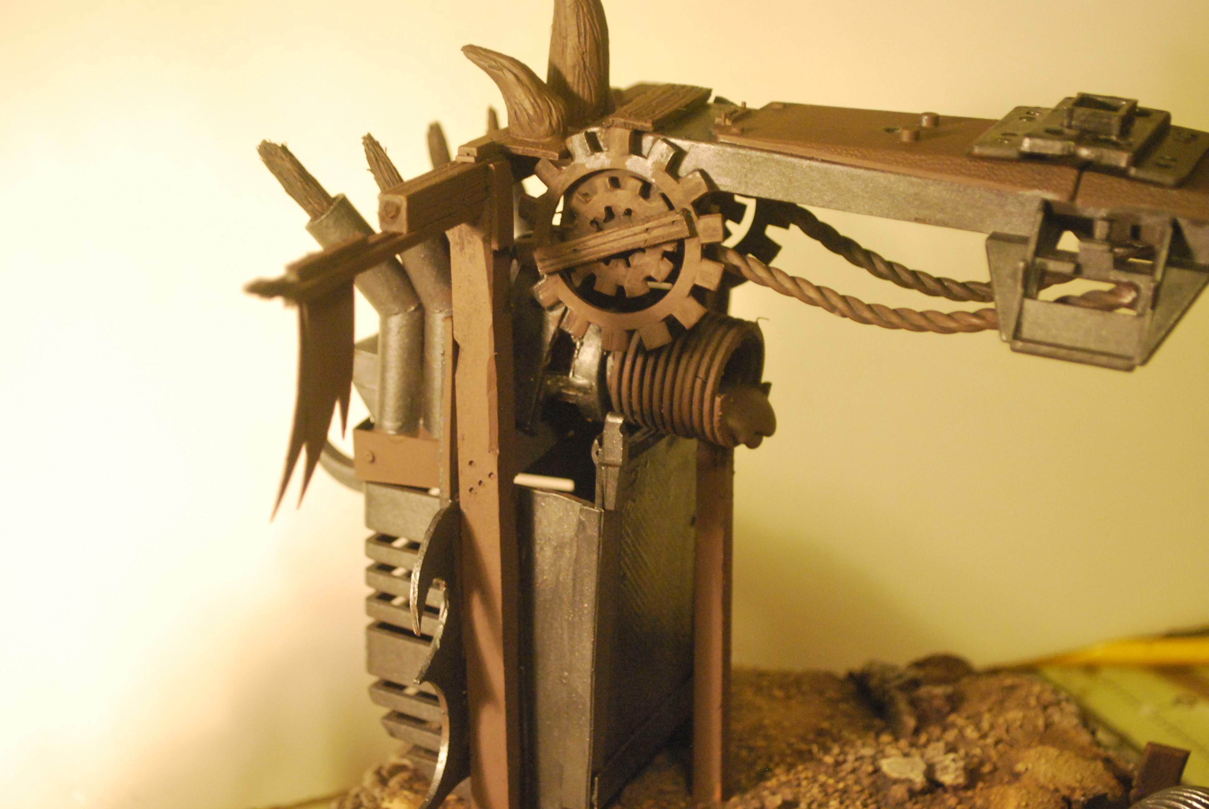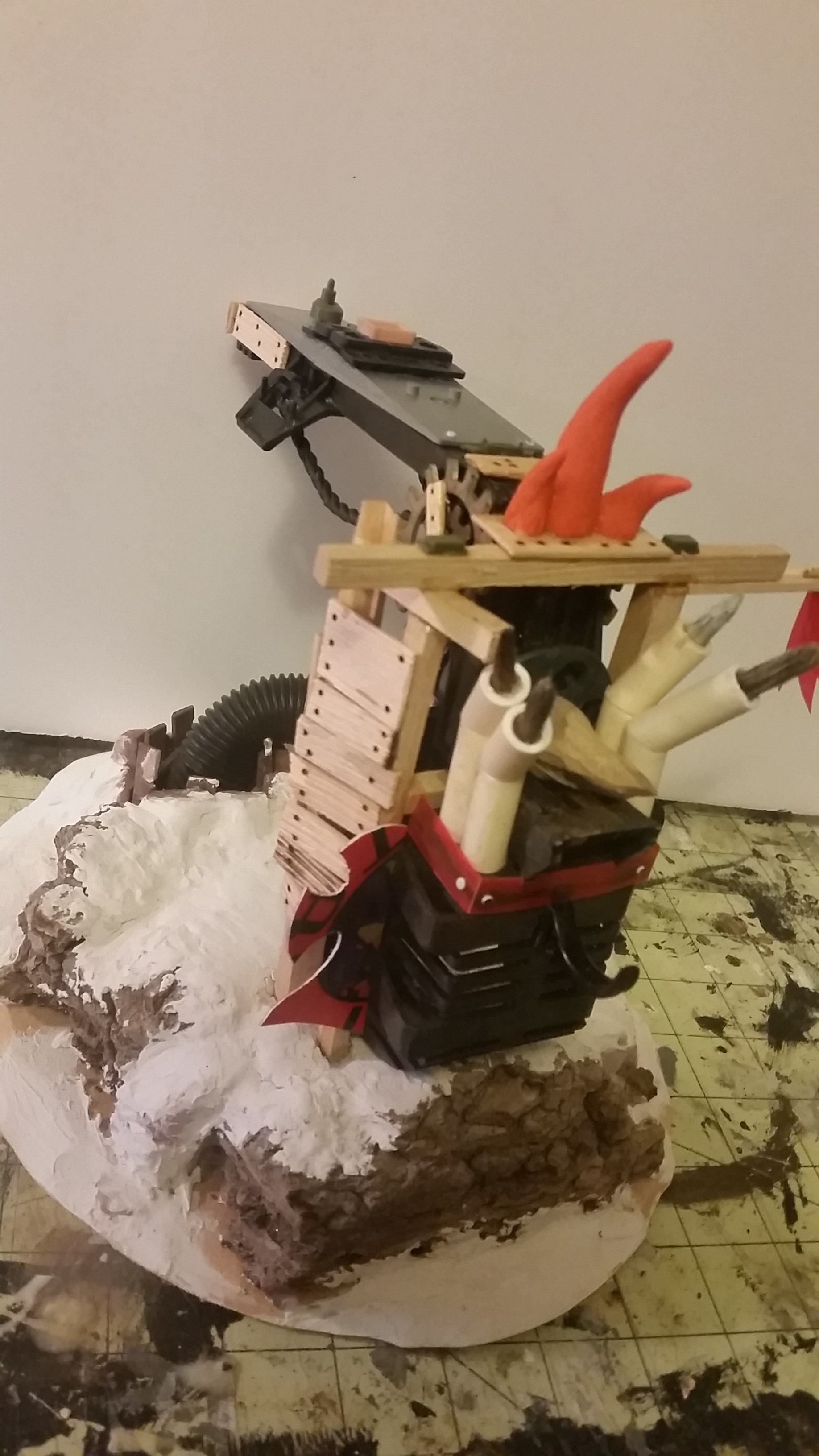Finally am happy with the structure itself after a few more modifications. I sculpted some horns/spikes from sculpey and added some exhaust pipes for the machinery. I also added jets of flame coming out of the pipes - I used some old paintbrush bristles that I had used for epoxy before...Not sure how that's going to look, so I may end up pulling them out - we'll see.