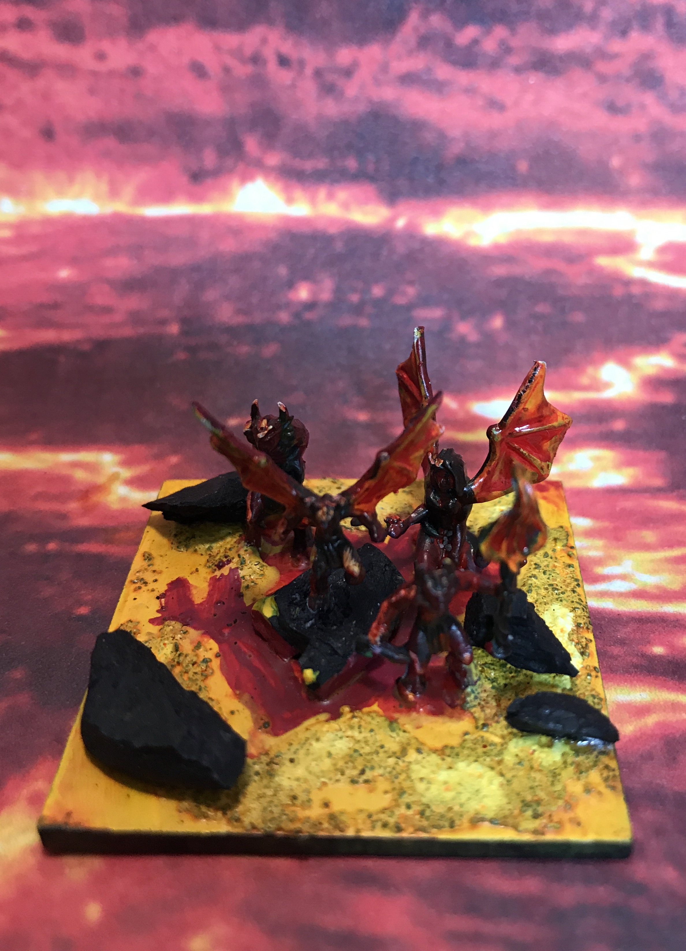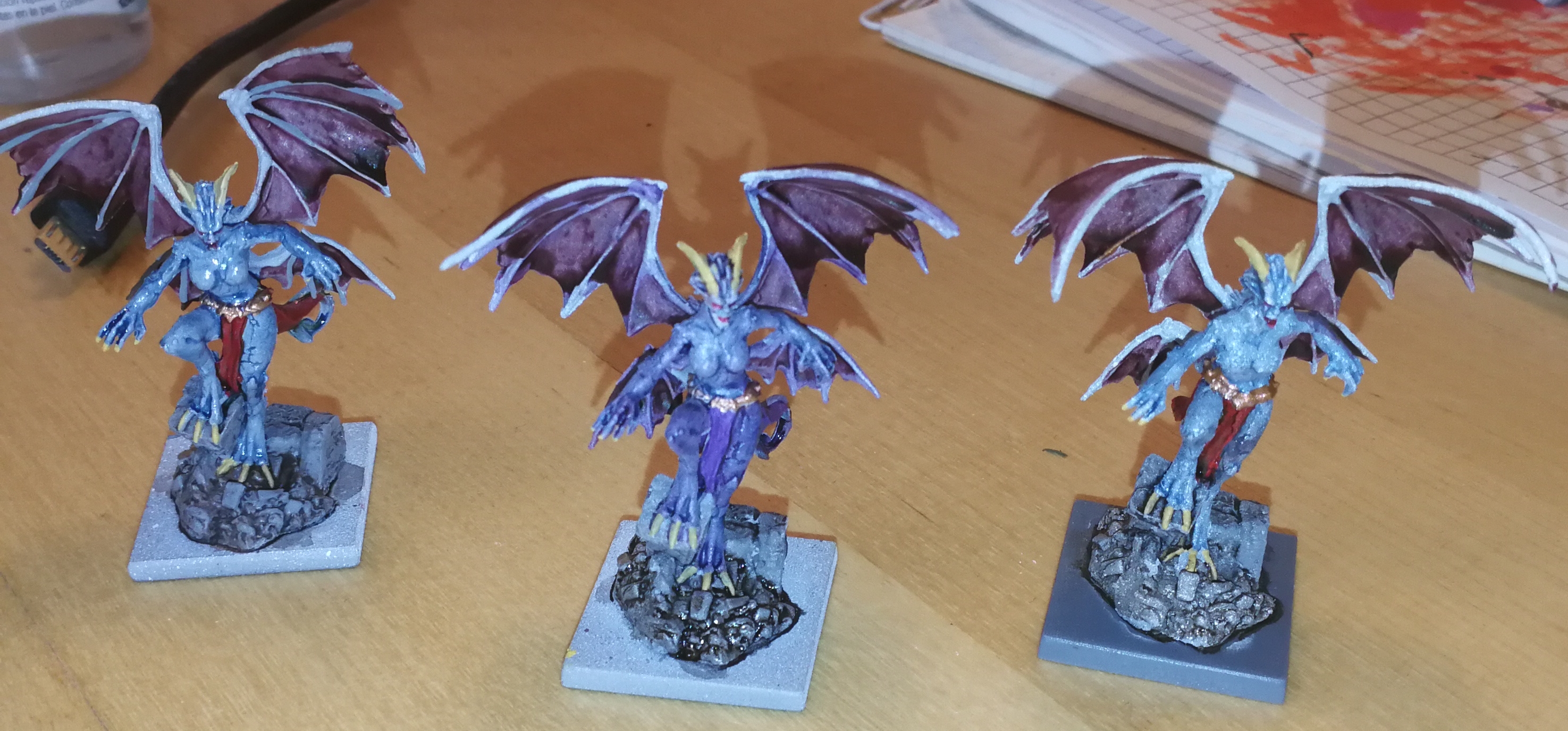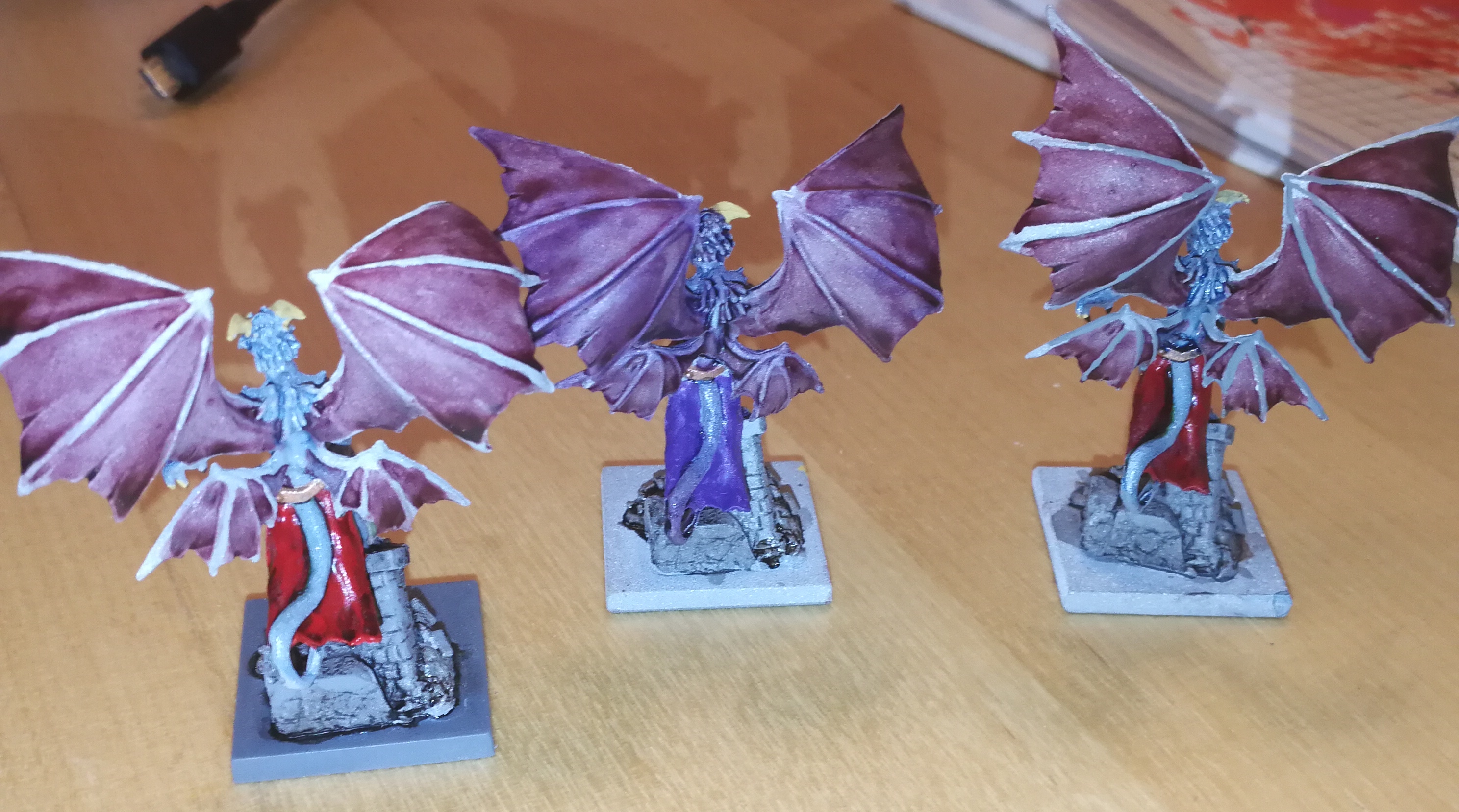 The gargoyles were sprayed black all over, grey from a distance from frost / back and then a very light spray of white straight down, they were finished with a purple wash on the wings and a purple dot for each eye.