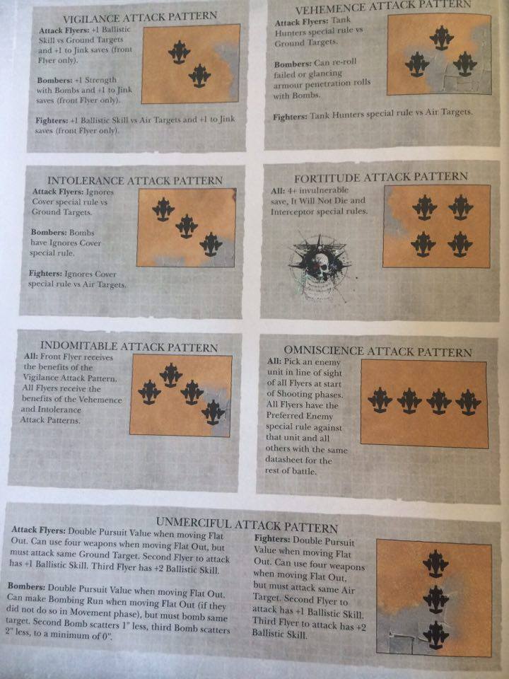 I am definitely thinking of getting a Stormhawk (I would give it the Icarus Stormcannon and Skyhammer Missile Launchers). Swapping out the Aegis and the Land Speeder would generate enough points for one. I still am not at all happy about my Stormtalons being nerfed severely. If Fighters get Skyfire against Flyers and -1 BS to non-flying targets, it seems like they could have given Attack Flyers Skyfire, but at -1 BS and normal ground fire. If I do get one, I will probably run the Intolerance Attack Pattern to make my brother's Ravenwing extra sad. Nevermind, they can't be used in the same attack pattern due to not being from the same datasheet. Otherwise I will run the Vigilance Attack Pattern if I decide against the Stormhawk.
