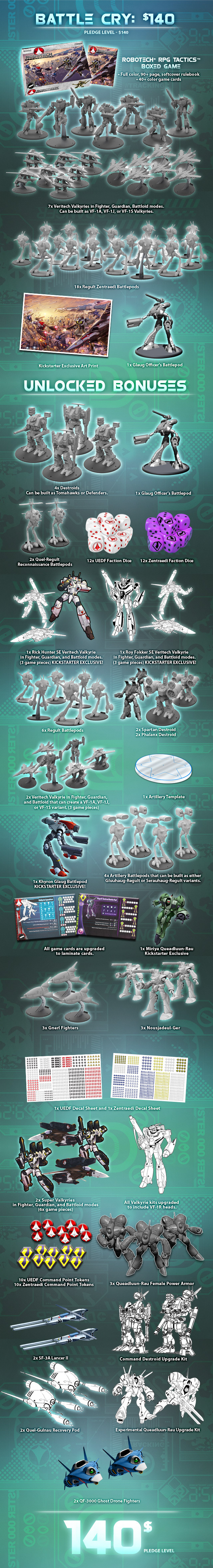 I will pay a little bit more than that but I am looking for someone in the US. I've found people in Canada/ UK unfortunately shipping costs are just too much. LOL I suppose we ought to take it to eBay. Battle Cry in Tampa for 275 USD starting bid: http://www.ebay.com/itm/Robotech-RPG-Tactics-Battle-Cry-Pledge-w-stretch-goals-LE-exclusives-/231354689123?pt=Games_US&hash=item35ddd06663 Here's one in Maryland at 160 USD, 22 bids so far with 4 days to go: http://www.ebay.com/itm/Robotech-RPG-Tactics-Battle-Cry-Pledge-w-stretch-goals-LE-exclusives-/201184997173?pt=Games_US&hash=item2ed78f6f35 EDIT -- scratch that , now at 187.50 USD.