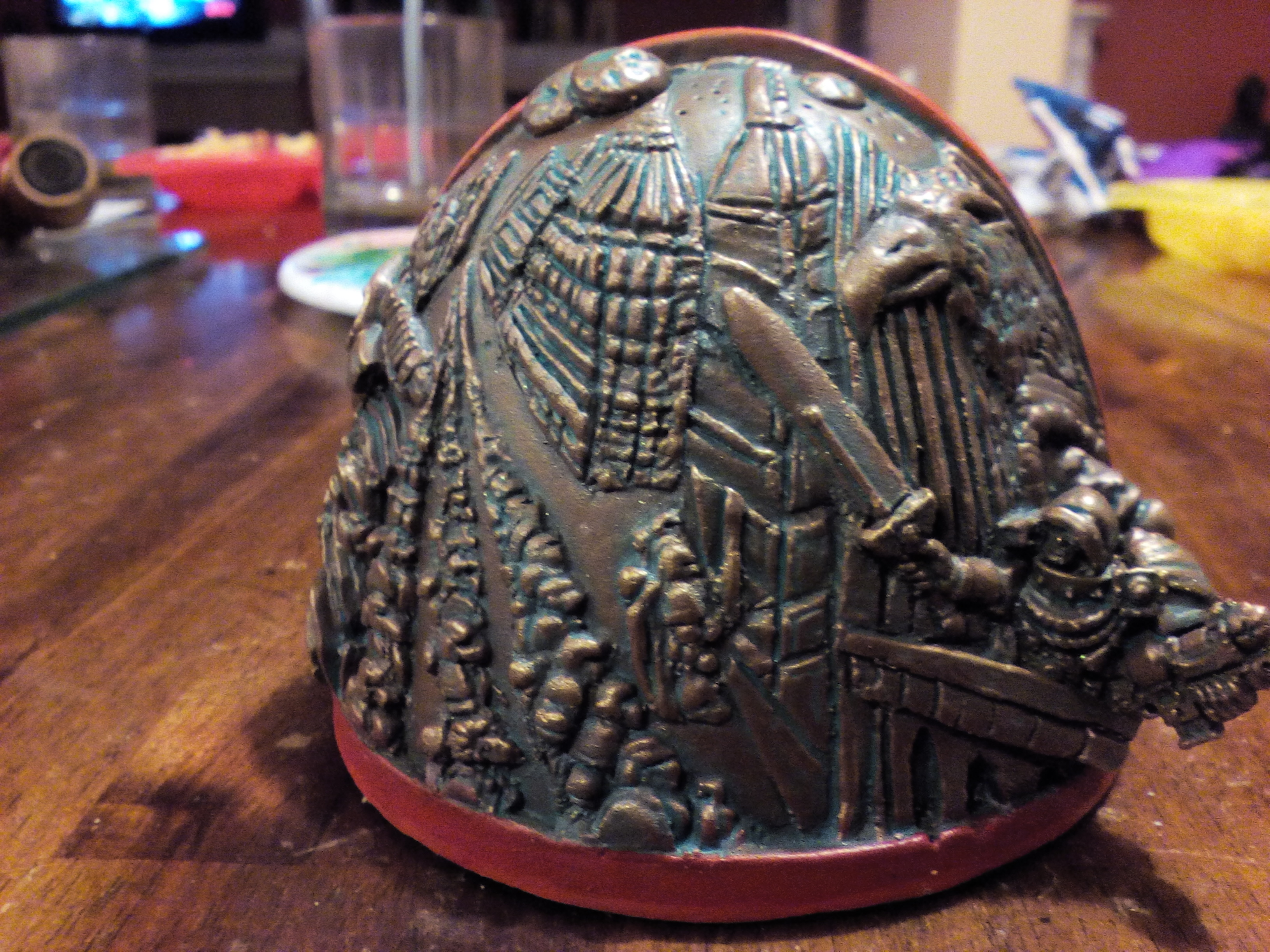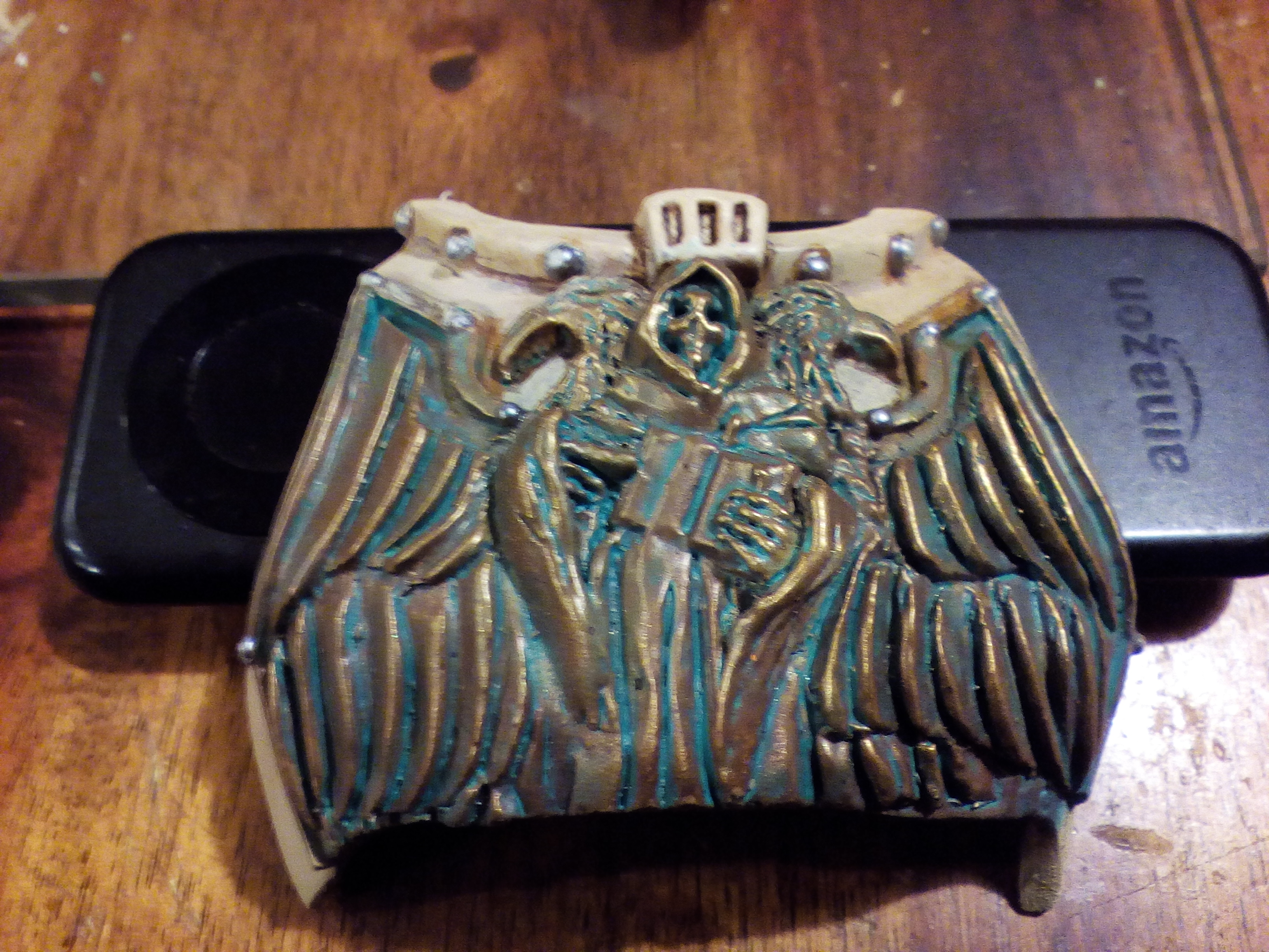 All the metalwork on those models is done over a black prime then a heavy silver drybrush, similar in application and effect to a zenithal pre-highlight; you get the same accentuated raised/upwards facing areas and darker shadows, then the colour is applied through washes. On some, like the Iron Man, the final colour is just applied in several coats, on stuff like the Ad Mech I add 'splotches' of other colours to add depth to the final look. In the case of these particular models, it was primarily green and purple, before a wash of Vallejo smoke ink over the whole thing to give that nice worn brassy/bronzey look.