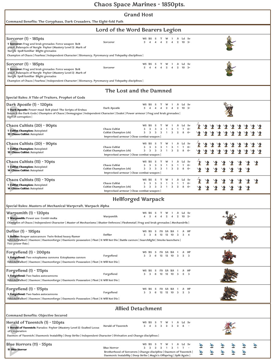 I get where you are coming from but some lists like that are innately more one-dimensional and have less play options. In 7th I ran the below list (the one with the Warband) as it had a small bit of everything.