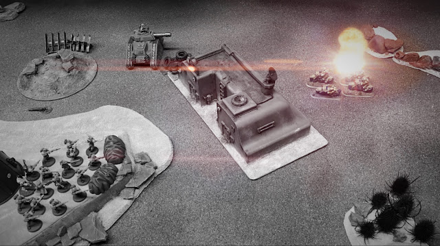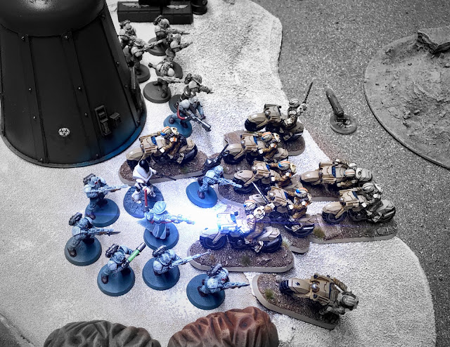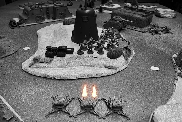 Recon bikers arrive from the flanks to harry the Traitor advance. The drop trooper front line is being whittled down with all the sentry guns destroyed and the surviving infantry going to ground behind their barriers as the battle cannons pound their position.