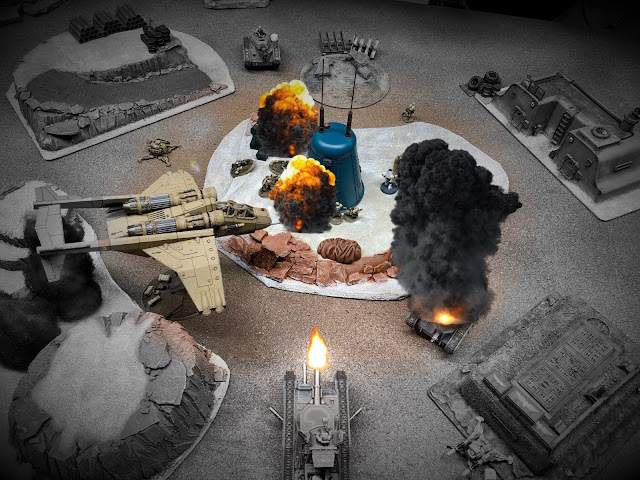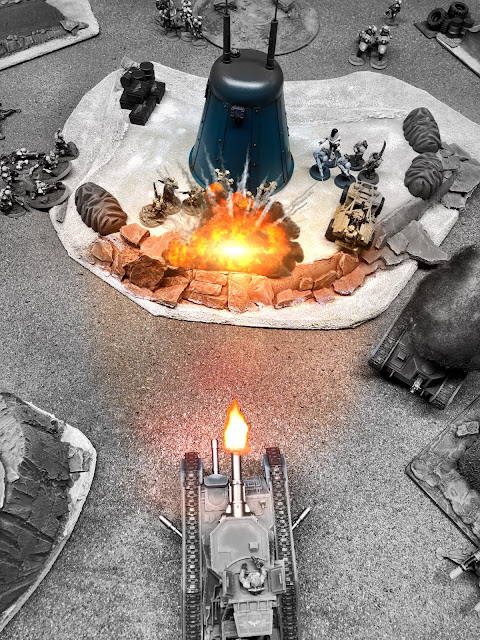 The battle between the Sentinels and the Leman Russ Demolisher came to a climax when a multimelta blast penetrated the front armor of the tank and started a chain reaction of explosions, eventually engulfing the tank in a massive eruption.