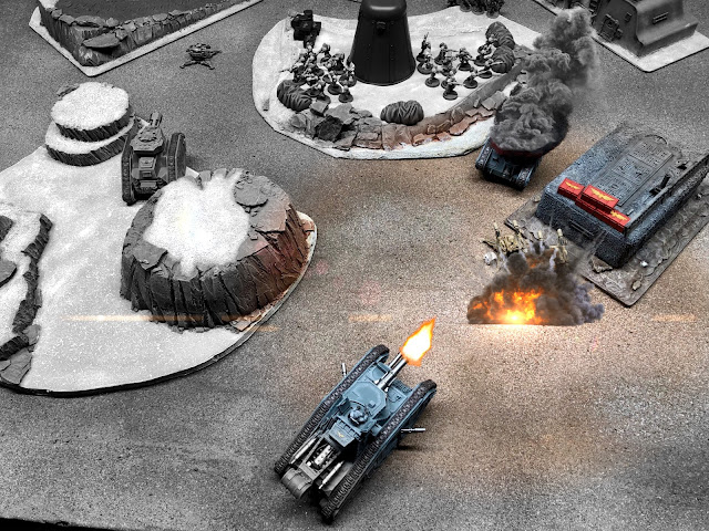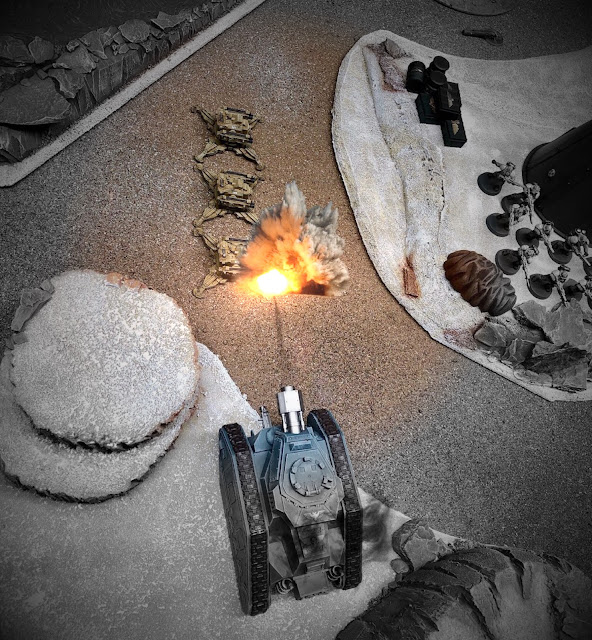 In a final effort to stop the Loyalists from accomplishing their mission, the remaining two Traitor battle tanks pound the drop troopers with a salvo from their battle cannons. The drop troopers were closely packed together as they worked to rig the charges and the blasts were devastating. Two entire squads were taken out of action with all members badly wounded or killed outright.
