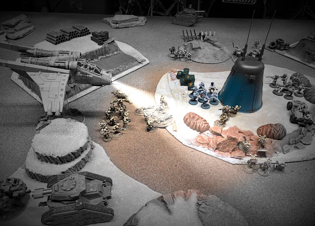 Even with all of the gentlemen's agreements to make the game more enjoyable and balanced, we both tried our best to guide our armies to victory. My strategy to neutralize a few tanks and then focus on the Relay Station worked well. It was a surprise to me when the game started and I learned that the Malcador had armored ceramite! (Do all the big tanks in Horus Heresy get that option?! It makes it tough for an army that relies on melta for its anti-tank...) But once I knew that, I decided to not even try to hurt that beast as I would be wasting my limited firepower. I had to clear his infantry and then swarm the objective with too many units for him to stop them all. Pete's Grenadiers were extremely resilient with their medics and their strong morale from their Provenances of War. It ended up being pretty close in the end. I only cleared his Squad Beta in turn 4 so I could charge in turn 5 so I could win in turn 6. That is the challenge for the attacker in this scenario - you have to stay in melee contact for a full game turn so if you wait until the last turn to make your charge, it is too late! And of course his remaining tanks could (and did!) wipe out a unit per turn once my guys were bunched up in melee so I would not have survived much longer. The main thing that saved me was that I was able to land a penetrating hit here and there on the tanks and shake their crew, preventing Pete from firing their big blast weapons. Otherwise I may not have had enough men at the end to make my big push. I am sometimes still not sure what I see in a Guardsman army without tanks and who's special ability is to get closer to the enemy faster in a way that leaves them clustered together and exposed in the open! But they got it done this time and I salute those brave souls with their flimsy armor and lasguns.