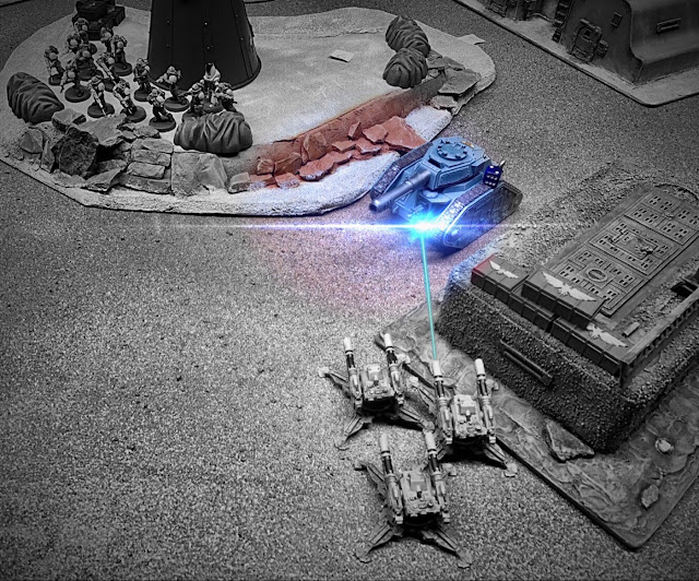 This was an interesting collaboration of a game. We used a scenario from WH40k 40th edition, my army used WH40k 6th edition rules for the drop troops and Imperial Guard, Pete's army used a Horus Heresy list and we fought the game using the WH40k 7th edition/Horus Heresy rules. We had five different rulebooks open all over the garage to fight this one! It is a great example of using the rules and models we have available to fight the battle we saw in our minds. Both Pete and I were flexible with the rules to make the game more fun and it definitely worked out. For starters, we decreased the points cost of the drop trooper list by 15% to try to bring them in balance with Horus Heresy. Then we had Pete start with his tank squadron around the objective rather than in reserve in order to make the game more balanced. And we elected to make his hidden units stay hidden through my first turn rather than revealing them at the start of the game because it felt more flavorful and fun if the drop troopers had to start dropping in without knowing which units were where. Then in turn 3, I failed the reserves roll for my drop trooper platoon a second time. Pete graciously offered to let them pass the rol1 and come in anyway because he thought the game only had six turns and if they did not arrive until turn 4, there would be little chance for them to accomplish the objective. We later learned the game could go extra turns past 6, but since Pete had already allowed them to arrive one turn early, we decided to cap the game at 6 turns and not give the drop troopers extra time. So we really made a lot of changes both in the setup and during the game to try to make it more balanced, fun and exciting and I think it paid off.