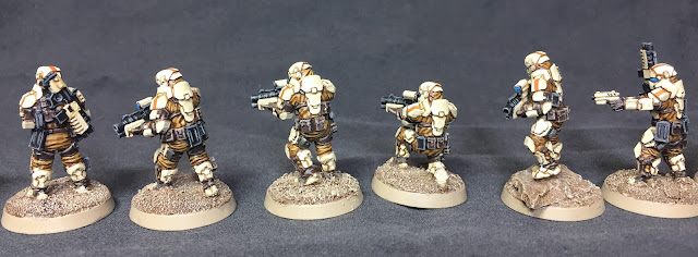 Next up are some third party models from Anvil Industries. Originally, I was thinking of using them as Storm Troopers. But now I've changed my mind and plan to get some of the metal Kasrkin for my Storm Troopers so that re-purposes these guys into veterans with carapace armor. I like that idea a bit better since they have the same helmets as the regular troops, but have more of their body covered with the armor plates and less of the fatigues exposed. Also, they are clearly lacking grav chutes so I should try to stay in character and rather than deep strike, either have them ride a Valkyrie or start on the board.