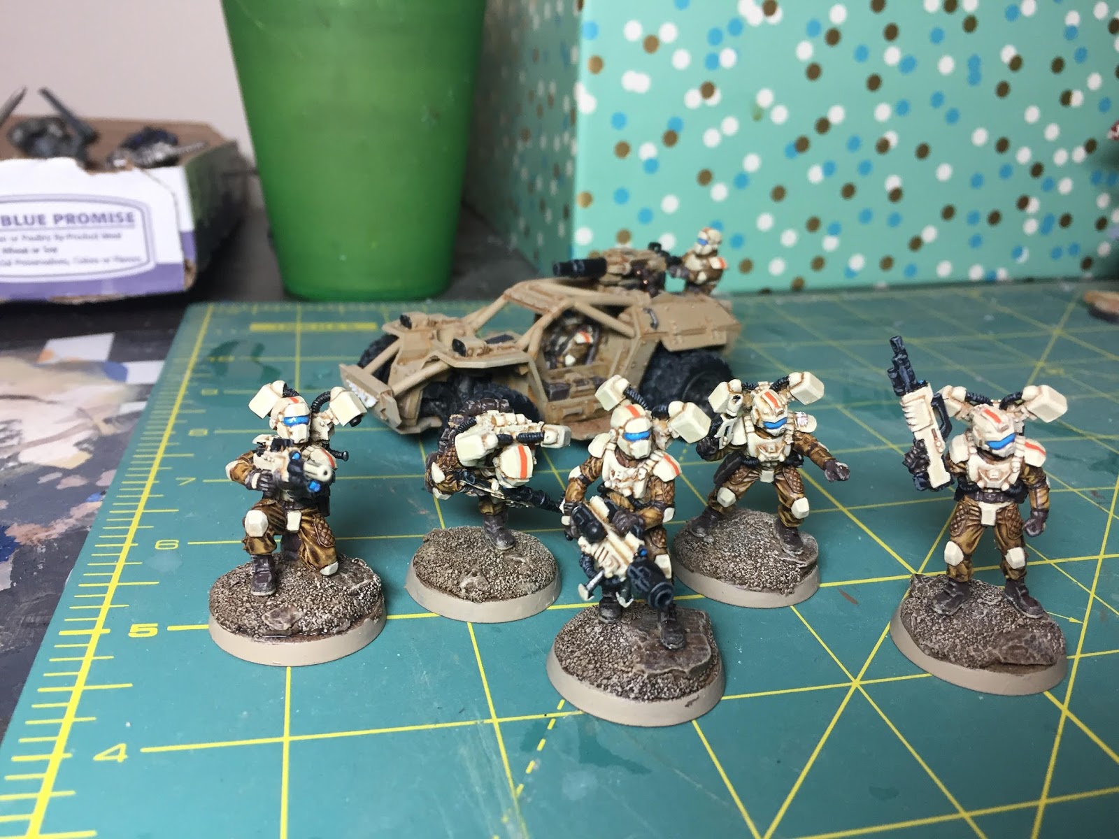 Nice drop troops. Their helmets work really well, and fit the high altitude drop theme perfectly. The orange stripes work great with the bone colours too, keep ‘em coming!