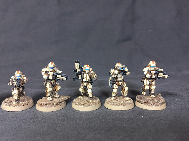 The squad is loaded down with packs, canteens, knives, extra ammo, grenades and bombs. They are ready to be dropped into a warzone behind enemy lines and operate independently or to hold a key position for as long as needed. I elected not to do any weathering other than a little dust on the boots because they are just expendable troopers and I already spent more time on them than I should have. I think it would be cool to try some exhaust streaks on the grav chutes, but I'm not sure if it is worth the time on models that I need to paint dozens of and that die by the handful.
