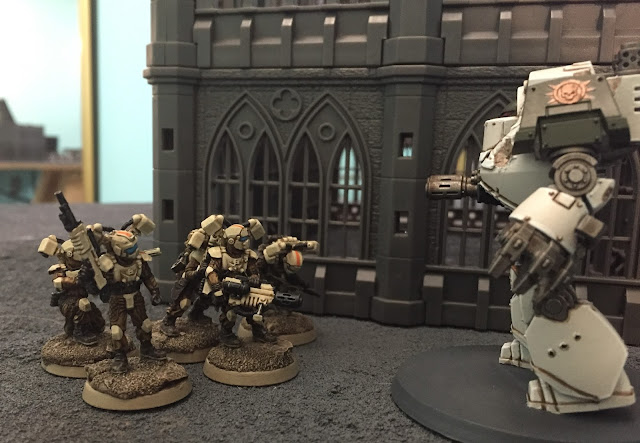 Of course, the infantry were useless against space marines. But the new melta gunner provided the highlight of the game when he destroyed a Contemptor Dreadnought with a very lucky overwatch shot! Even though he and another trooper died in the blast, he did his duty and will be remembered as a martyr and hero.