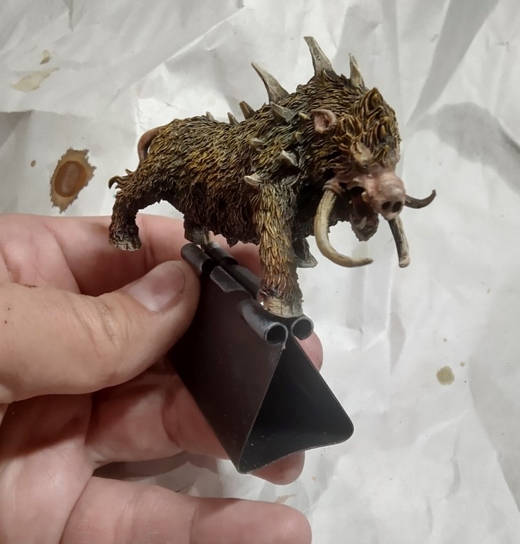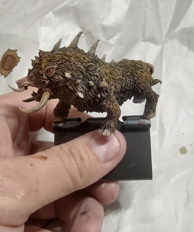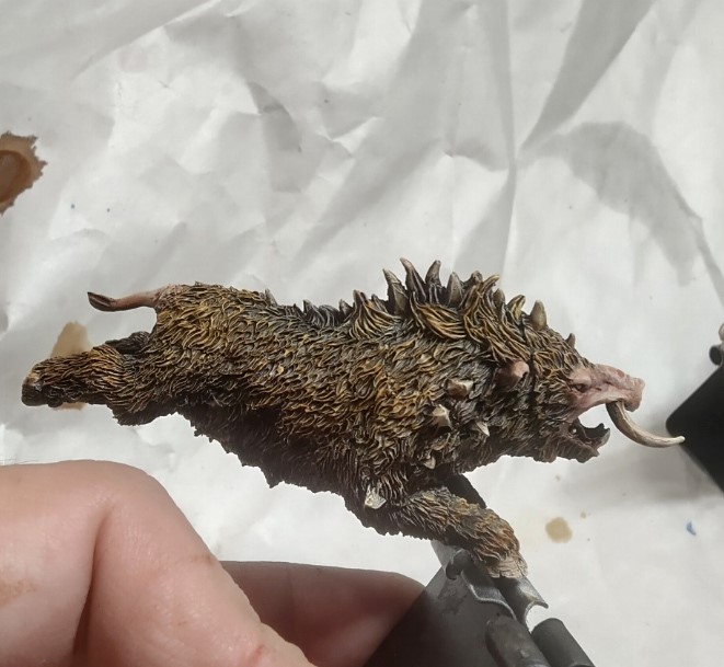 Lastly I did a second boar to see if I could replicate the effect as well as I watered down the highlight layer with one part water as well. It looks pretty good too. Maybe better then the first one I did. Doing this one out of spoiler as I think it looks pretty good and not everyone clicks those. Maybe once I get these done I can set up the light box and get a better camera for people but this is a very interesting way to paint as I've found contrast to work best going from brightest down to darkest (shrinking coverage area) in paint order works best but this is the opposite color wise but still using targeted coverage for the second layer. I'll have to try more things and textures as maybe I just got lucky with my color choices and the deep fur textures on these models.