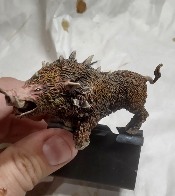 I finished up the boars tonight in probably another 30 but that was also included drying times for the washes. I added in some green to some of the shaded areas for some more color depth and then did a second thin coat of Ogre Brown on the fur highlights which intensified them.