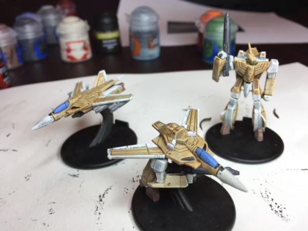 Here are some 6mm scale "VF-1A Valkyrie" models, from Palladium Books' Robotech RPG Tactics line. The robots can transform into different modes, so each of these models represents the same vehicle, just transformed. These miniatures are relatively recent, from 2014, but the mecha designs are from the 1982 anime Super Dimension Fortress Macross, so I think they qualify as "Old-School Cool."