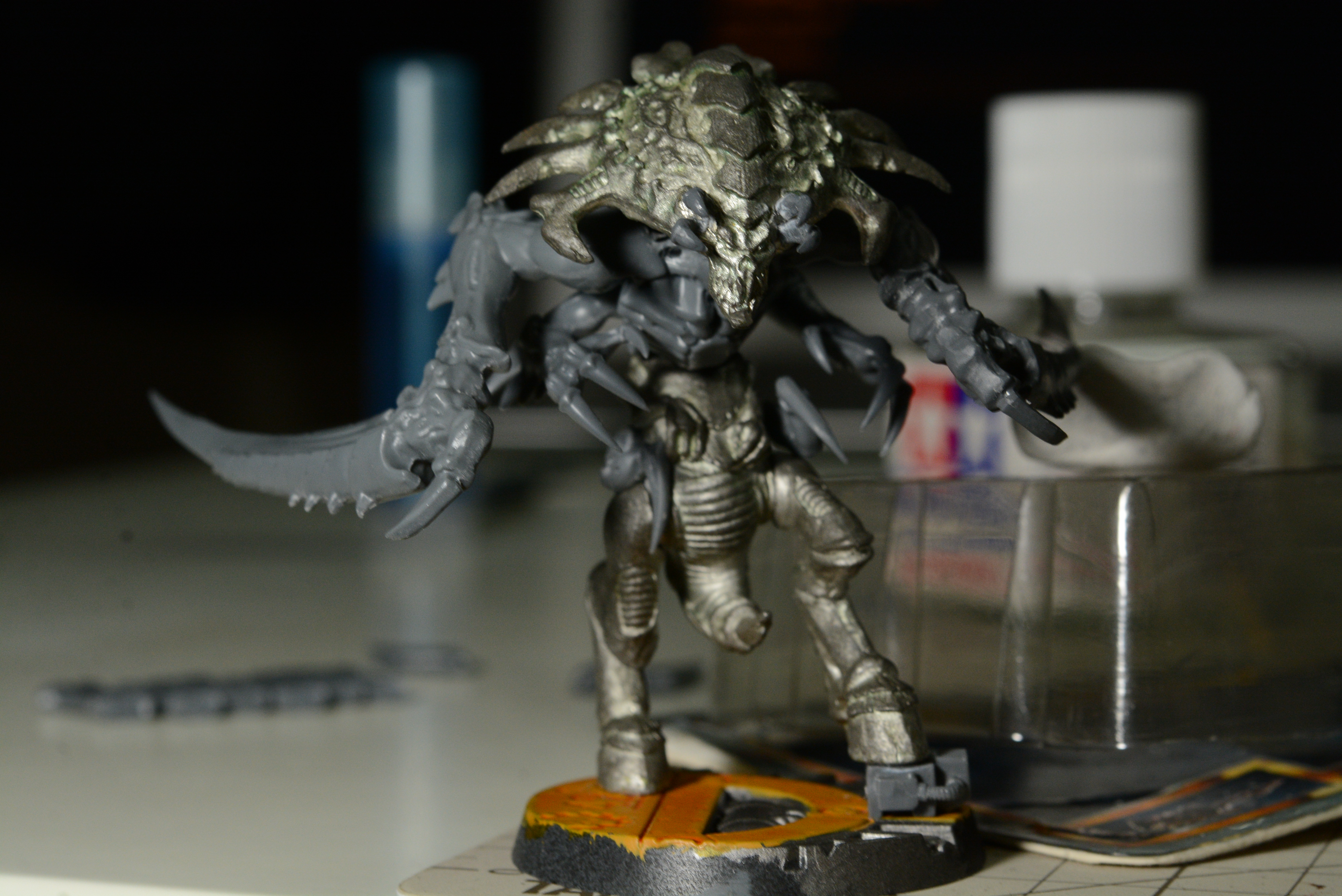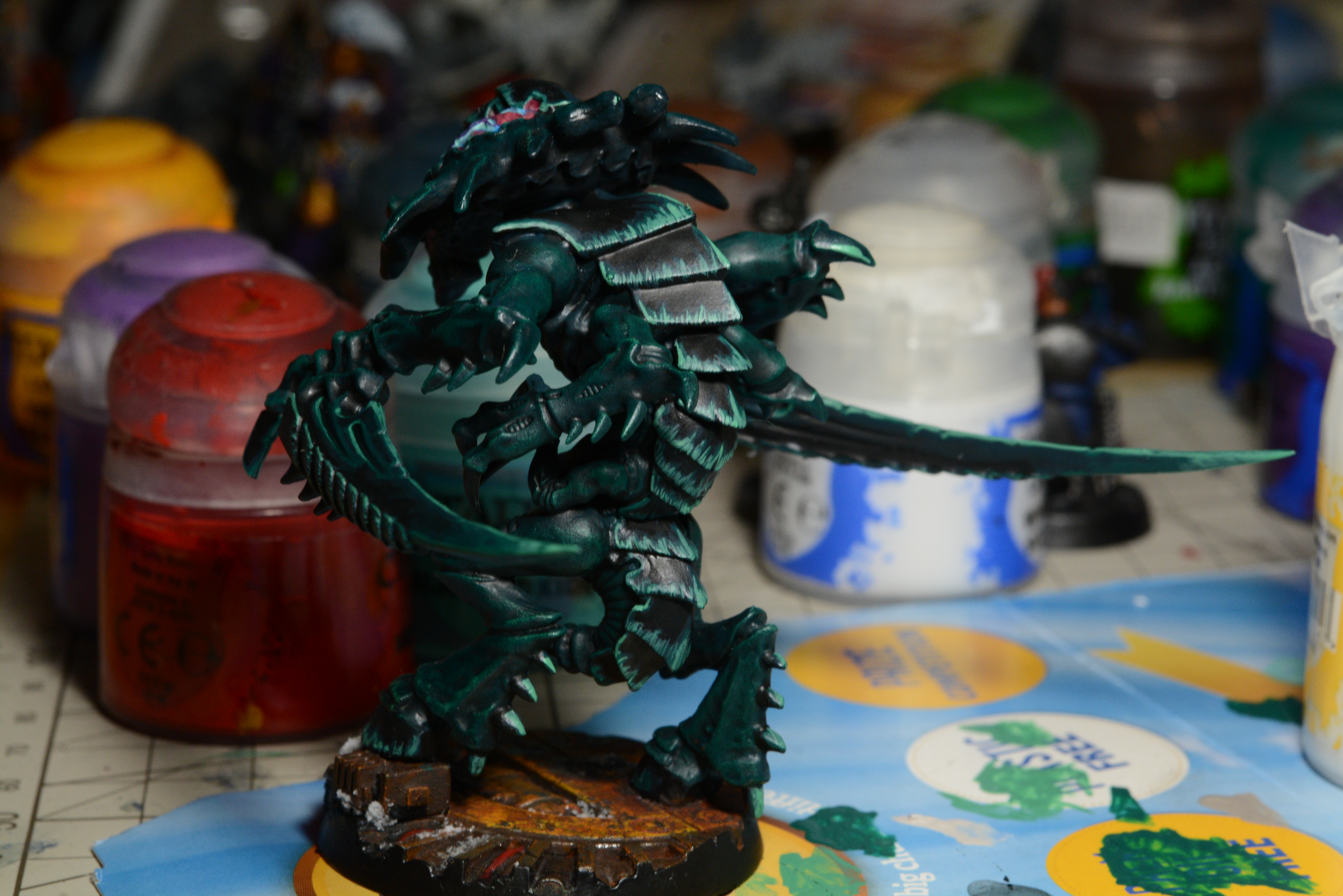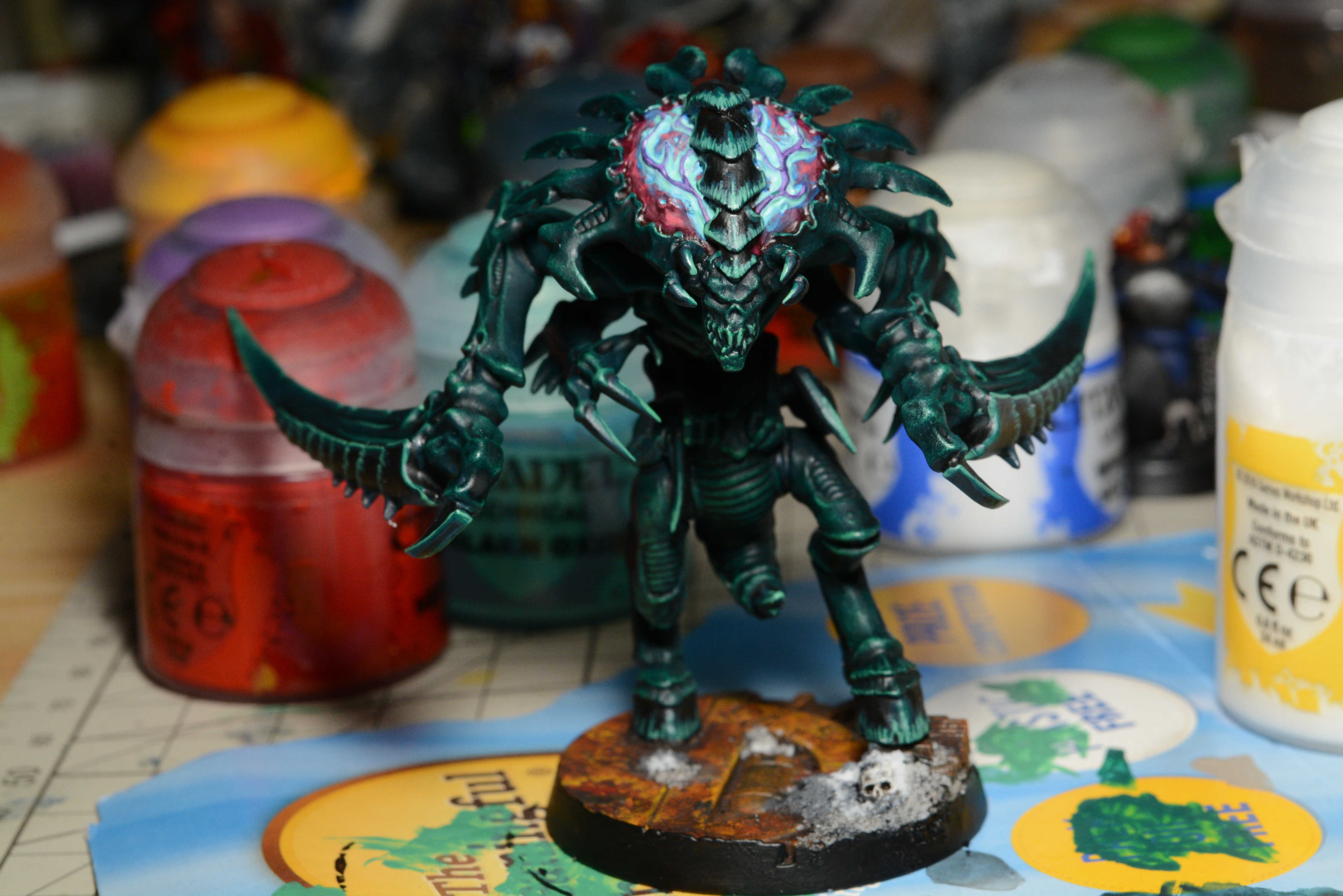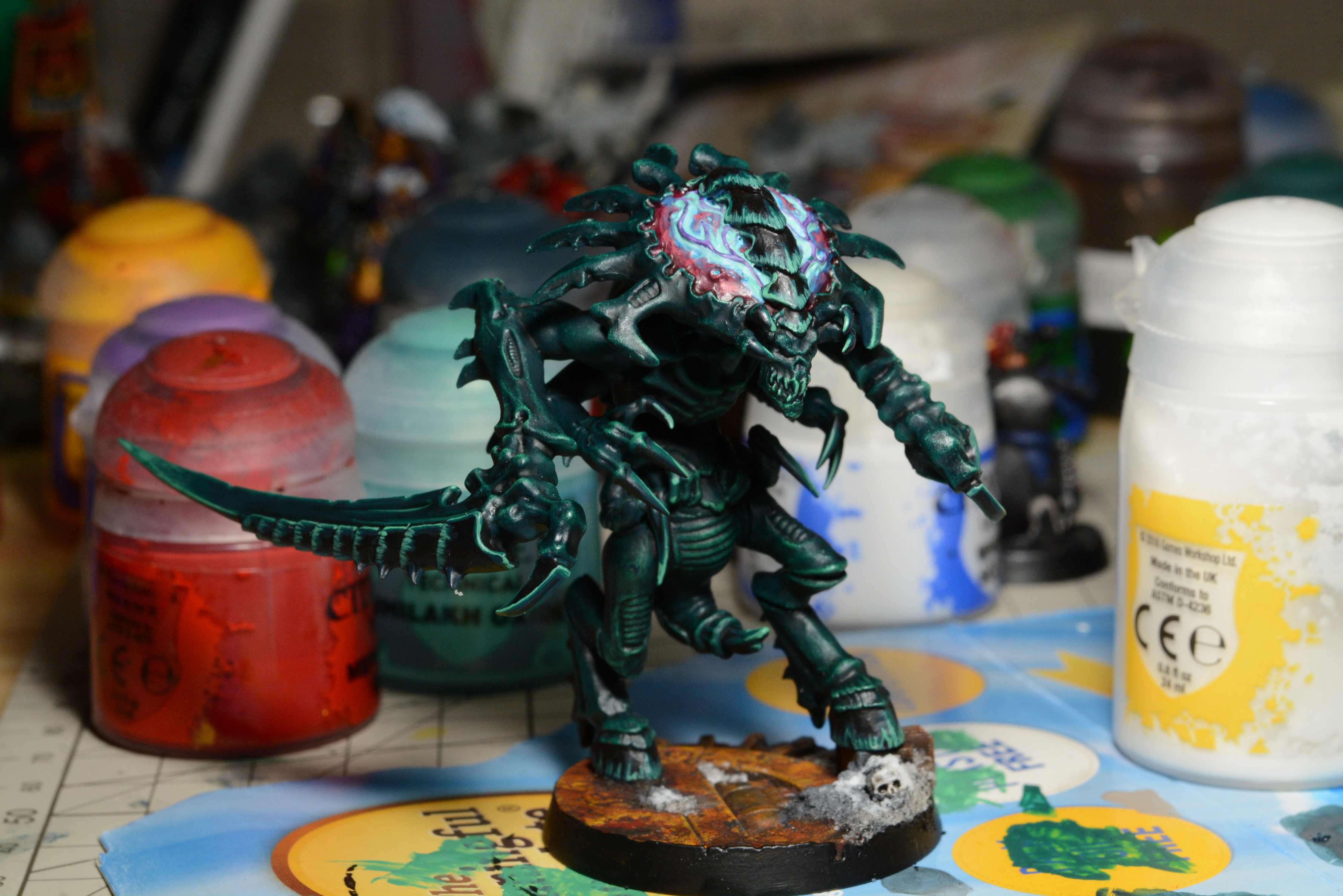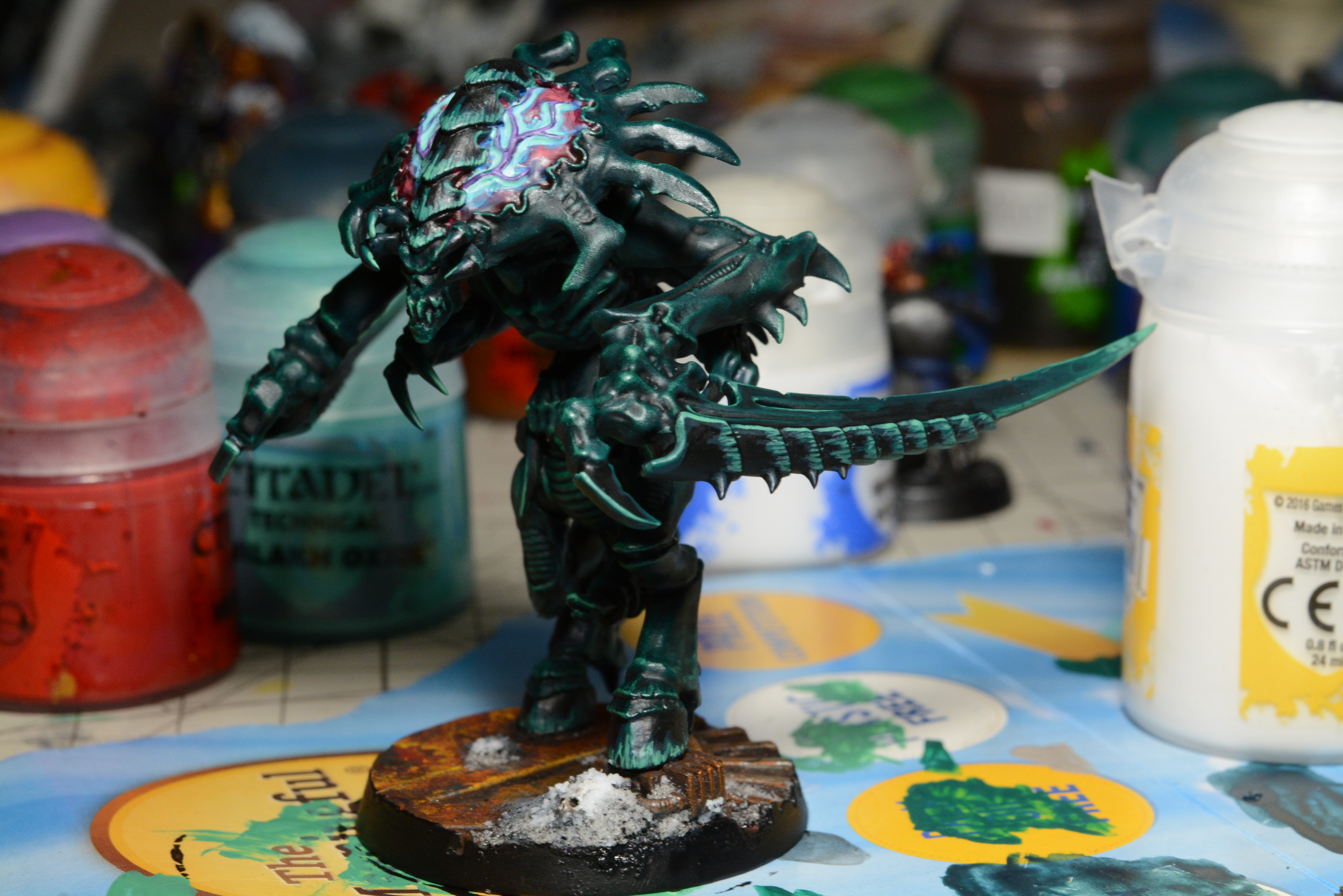 Finished up the flesh today, and took the masking off the base. Full speed to brains, chitin and weathering that metal!