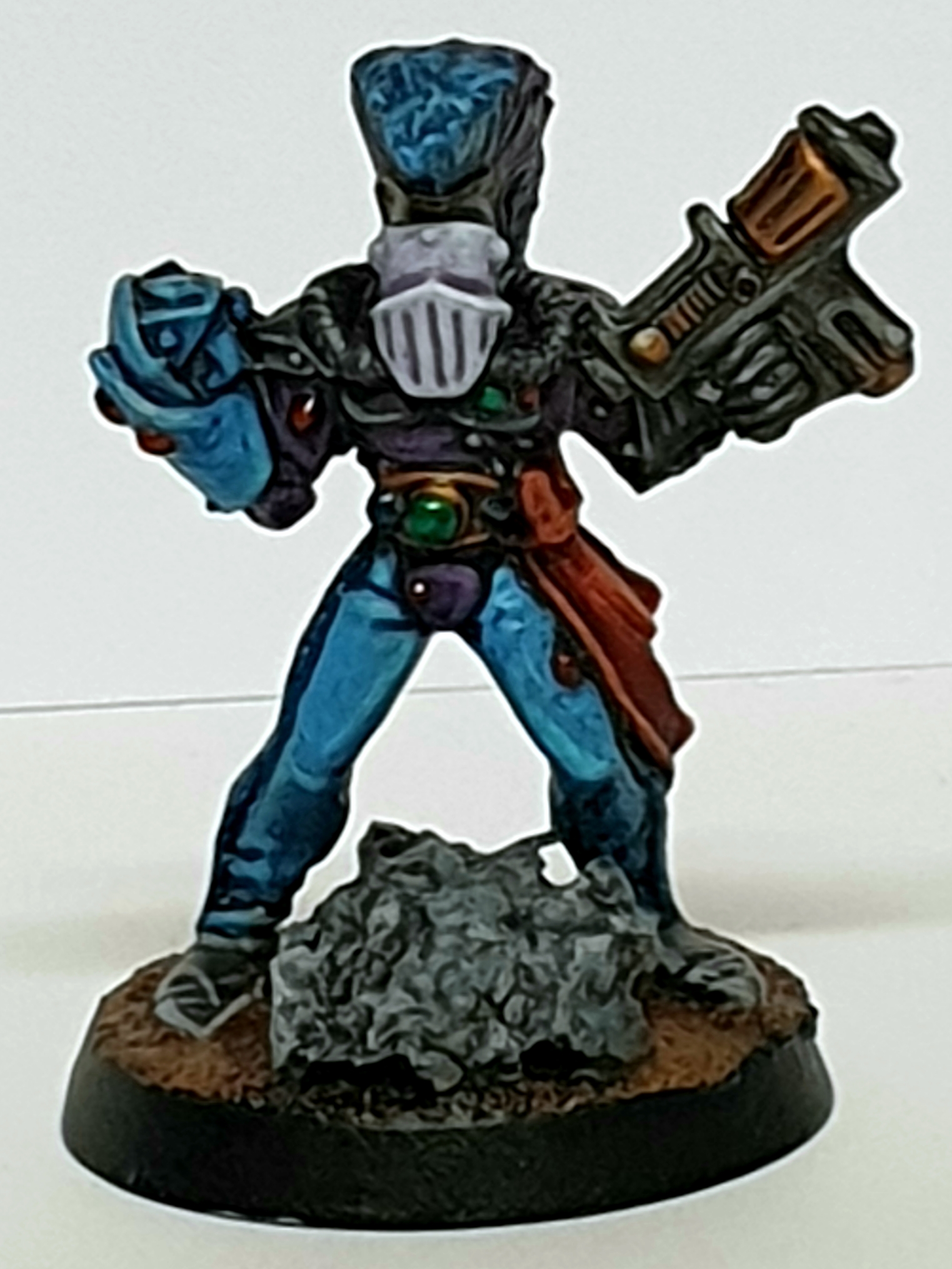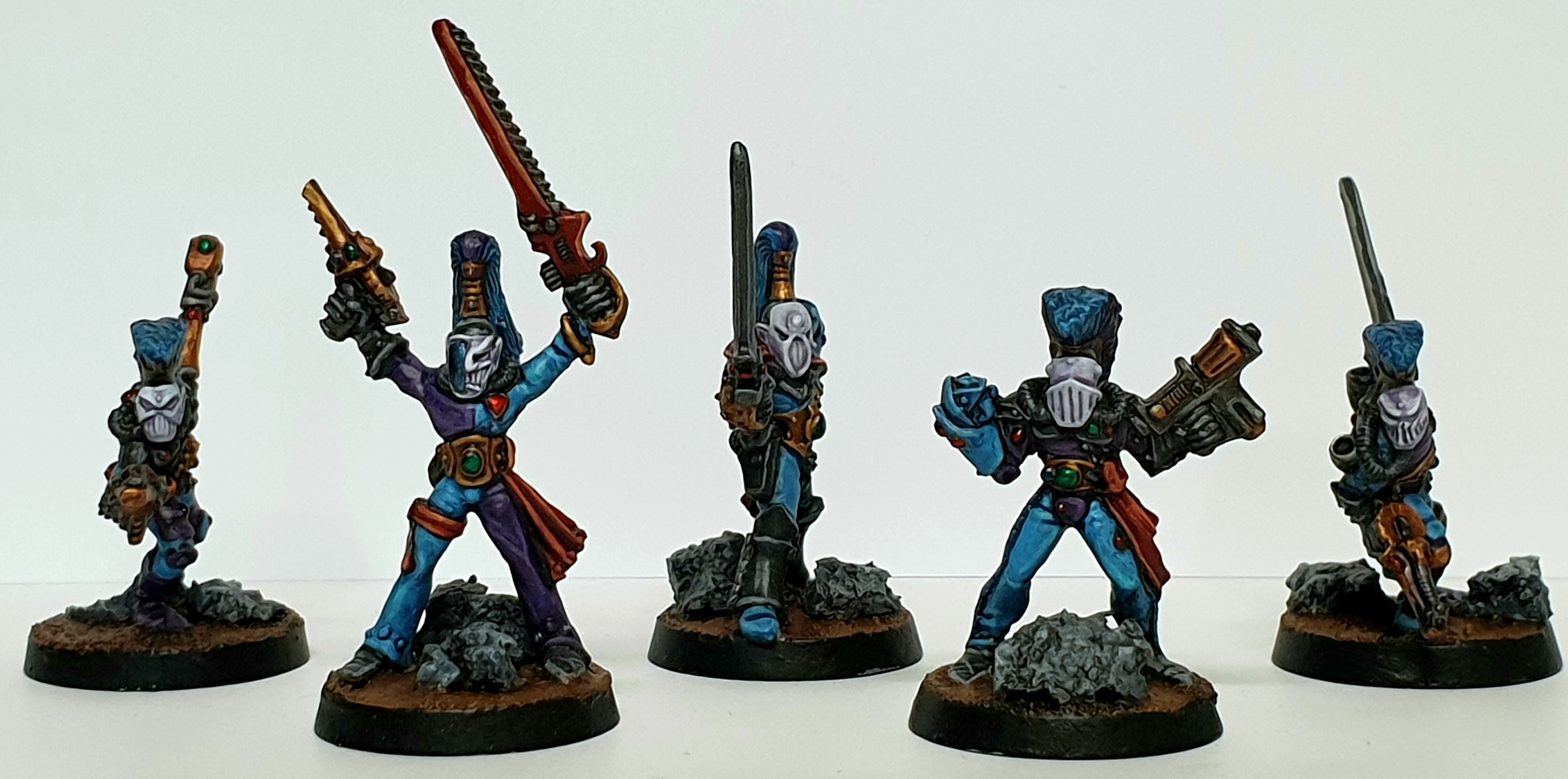 Here's my five-man Adeptus Arbites unit. I bought these guys at Ralph's Comic Corner in Ventura, California, sometime in the late 90s, and they've been in my collection, unpainted, until now. I struggled with getting the blue armor tint figured out, but the good netizens of Dakka helped me through it. This was my first attempt at gems, and I'm quite pleased. The custom bases were a last minute addition, but they ended up being pretty easy and very rewarding. I'm excited to get these tip-of-the-spear enforcers of Imperial doctrine into a list somehow-- the Adeptus Arbites, Adeptus Ministorum, and Ordo Xenos together as the Emperor intended. There are more photos in spoilers and on my P&M blog.