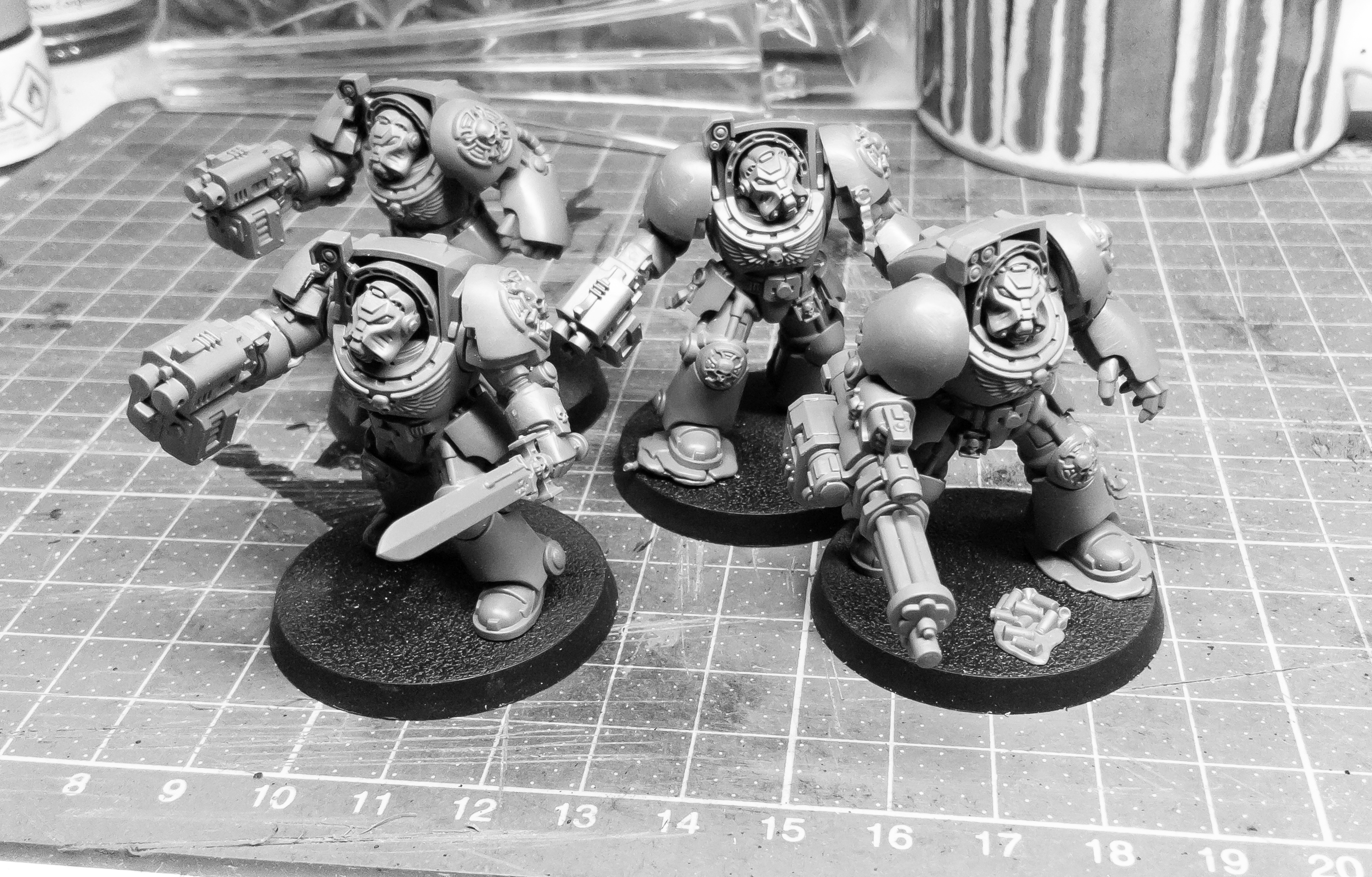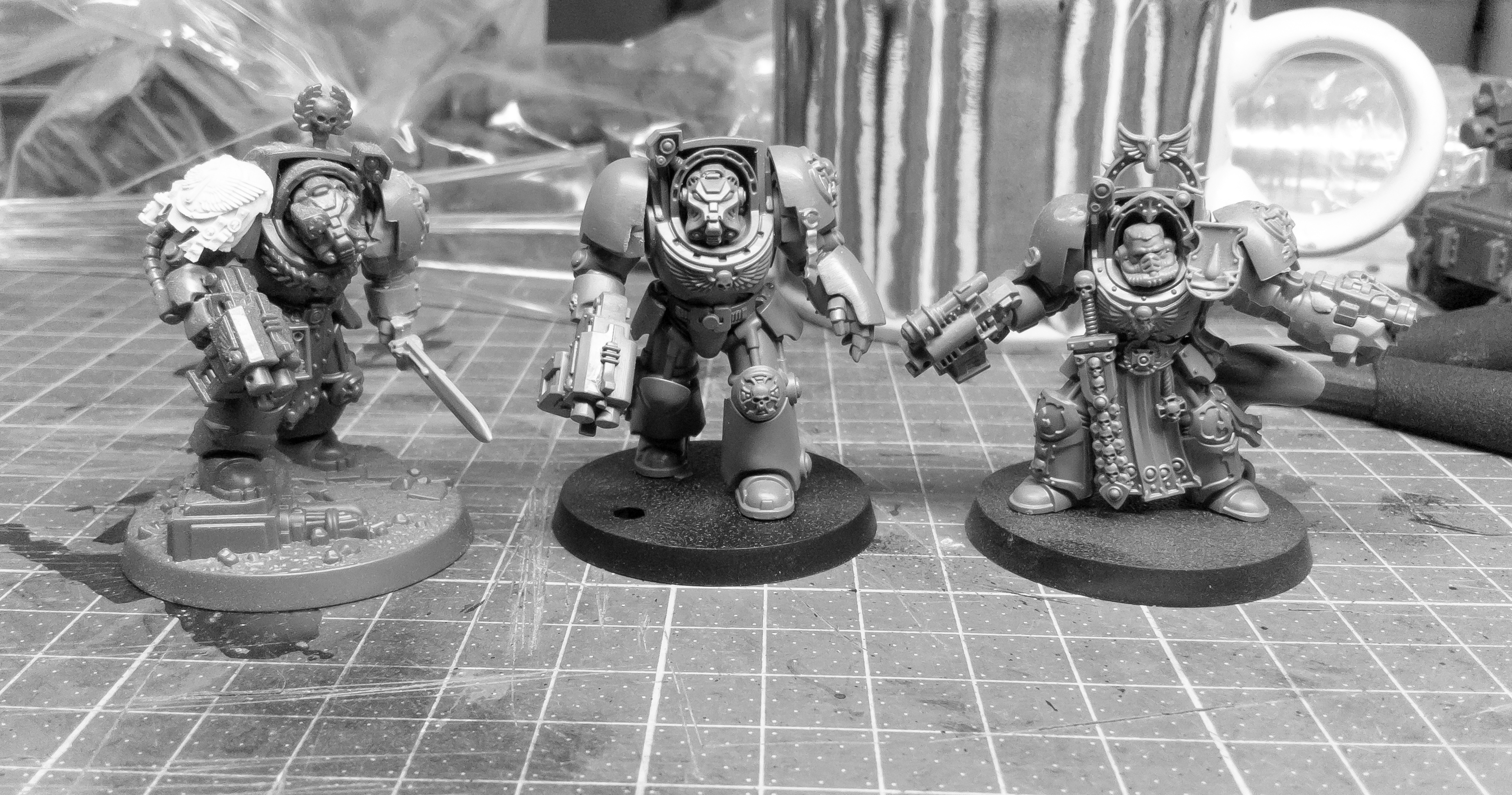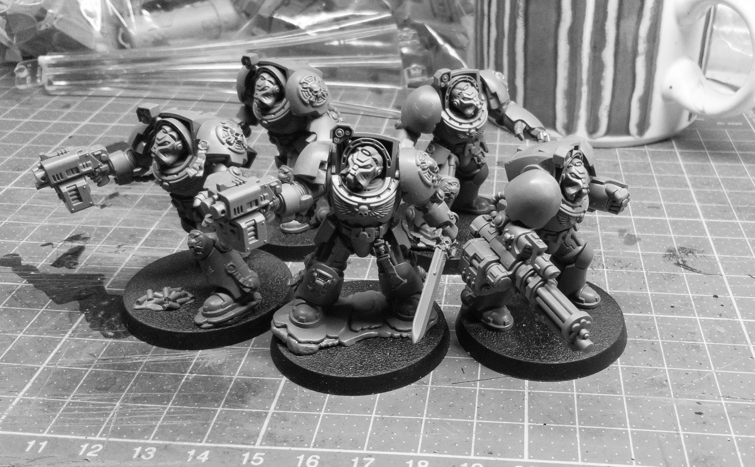 I think these models were bashed from just the helmets and MKIV style breatplates from the FW resin upgrade kit and plastic arms, legs & other parts.. Also, the undercoated blue seems on a bit thick..