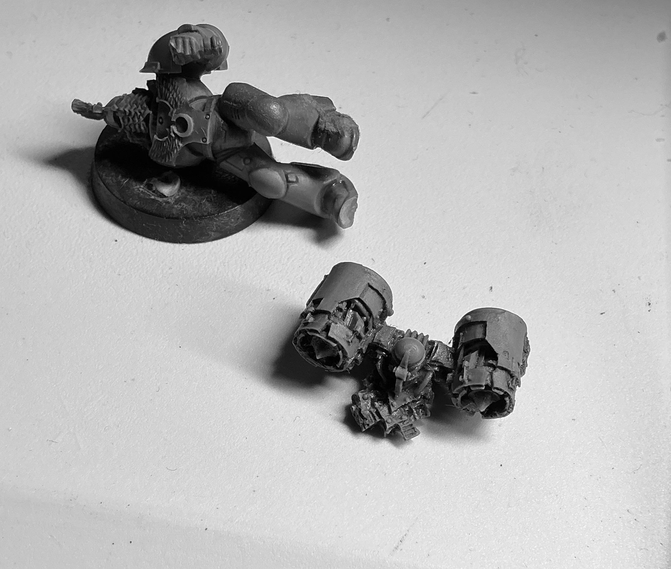 I got it done but messed up quite a bit hehe! I damaged the sergeant model accidentally while cutting off the left arm to swap out to the multipart arm, so made a bunch of simulated battle damage to the left side to make the mess look more intentional. Also noticed that one of the model had broken its left leg "sneaker pump", so battle damaged that one too. Also on the sergeant, which I worked on first, I made a bit of a mess cutting the old right bolter arm from the elbow joint and while reconnecting the multipart plastic weapon to the elbow, snapped the cable in two! After a lot of cursing and faffing around, I finally managed to glue the snapped cable back in place. Whew!