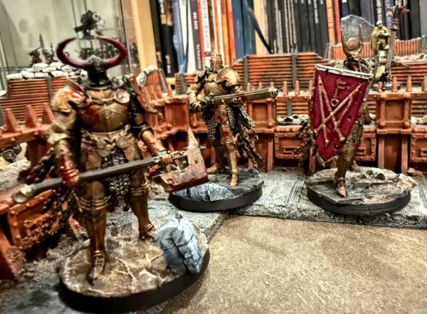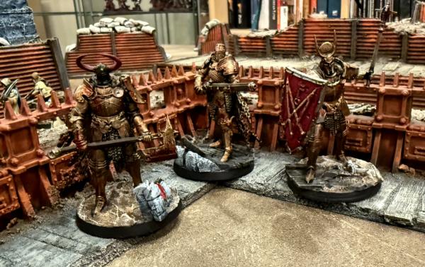 Now the Hell Knights. I wanted something that would both stand out yet match the board. Gold works for the desert color scheme. Could have done silver, but it didn't really look good with the bases.