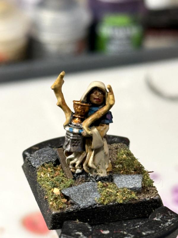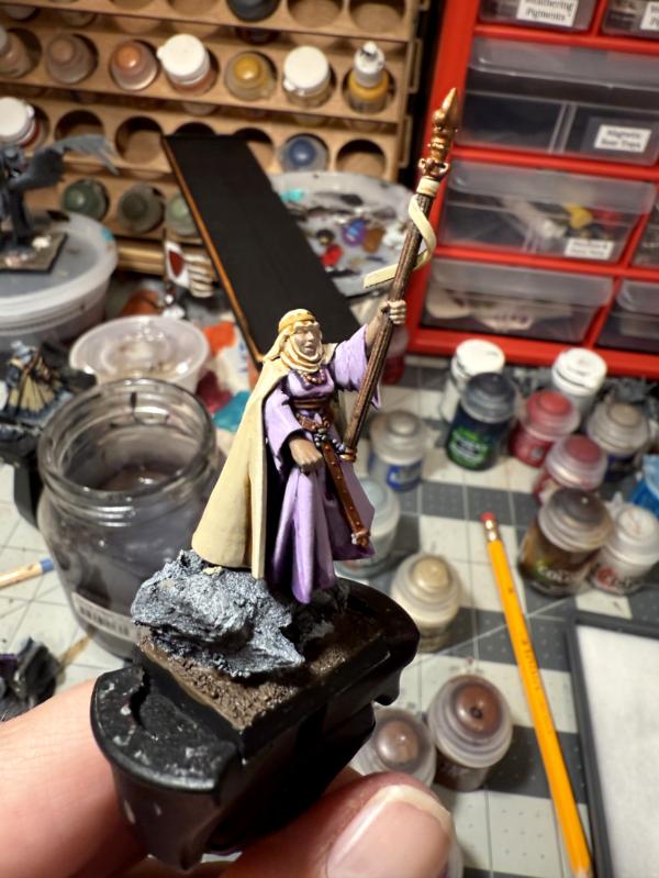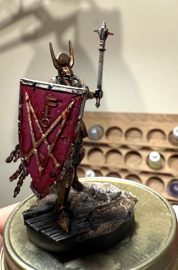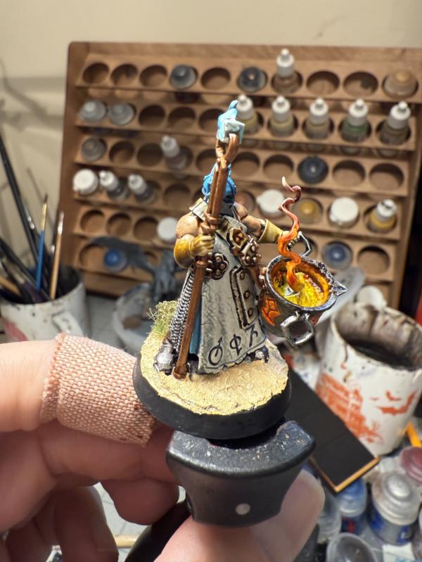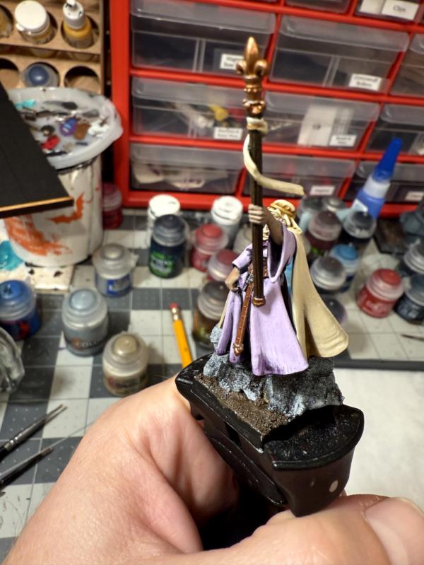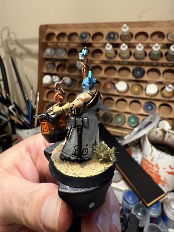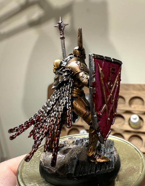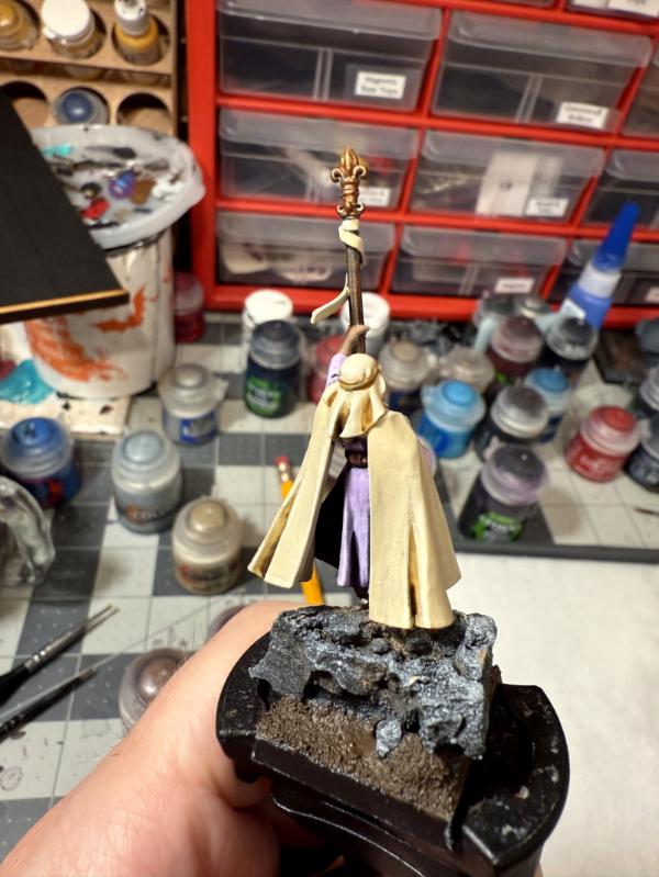 No Cloak cause he's sneaky, and two close combat weapons because that's what the model comes with. Kitbashed from a Sword Brethren (which is an amazing kit for bits & character making if you're even moderately a kitbasher). Really particularly proud of the leather work on this guy as well. Still trying to figure out how to do the tabards differently than my normal style, so I figured the crosshatched would look okay. Not sure if I'll keep it or just paint over that.